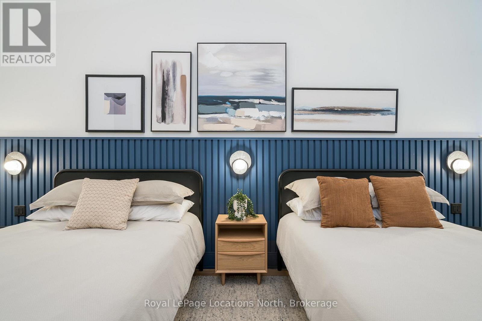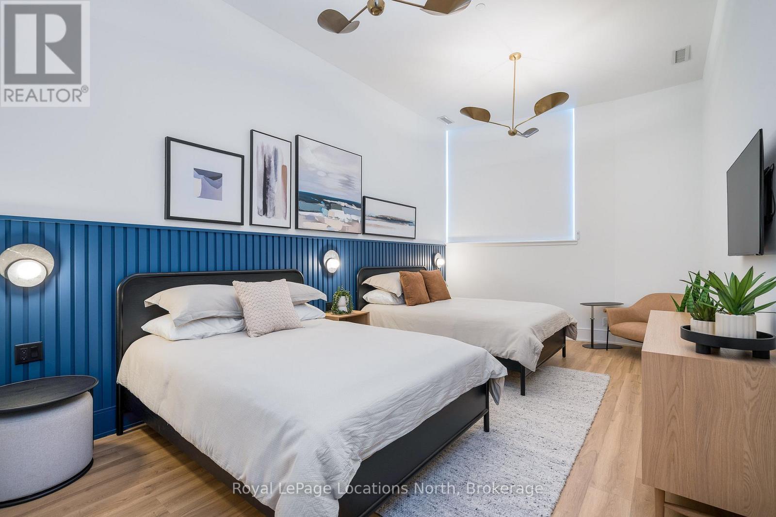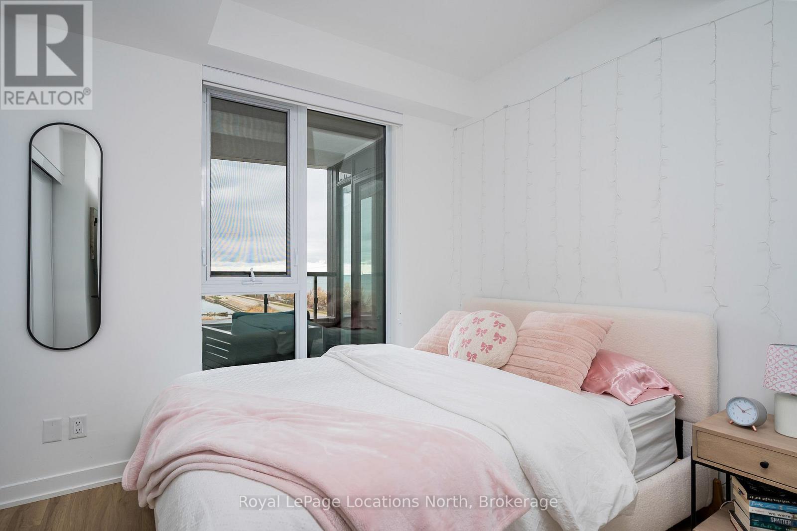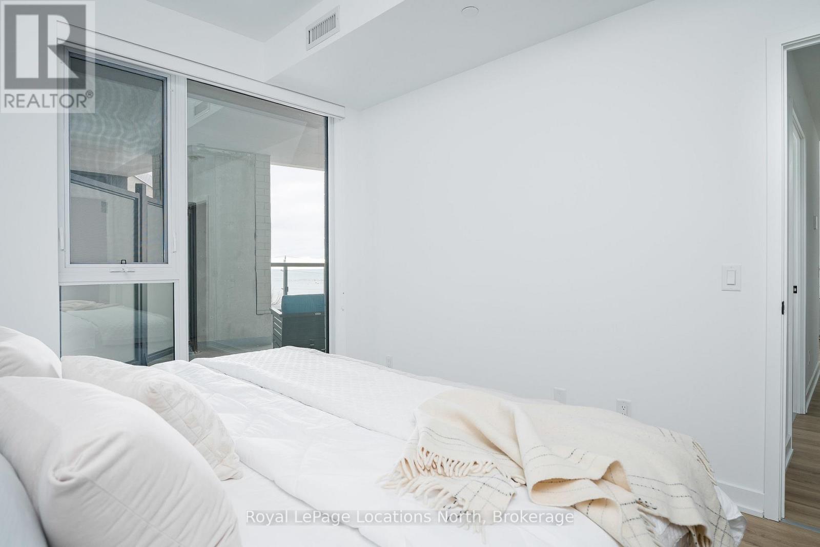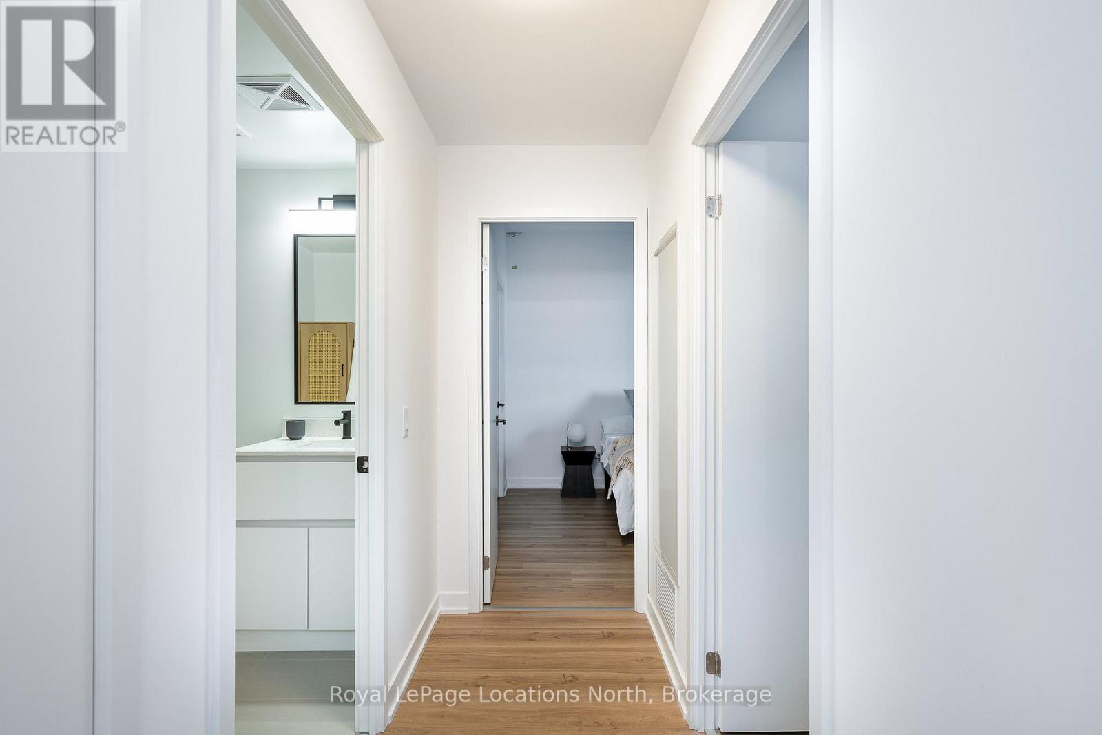 Welcome to Harbour House, Collingwood's premier new condominium address where contemporary design meets waterfront beauty. Perched on the 5th floor, this pretty suite offers stunning water views and a level of elegance that perfectly complements its coveted downtown location. Thoughtfully designed, this 2-bedroom, 2-bathroom condo features 910 sq. ft. of one-level living. The Scandinavian-inspired aesthetic is both serene and luxurious, with a modern open-concept layout that invites an effortless flow. Designer finishes and natural textures subtly echo the surrounding landscape, creating a warm atmosphere. The chef's kitchen offers a generous sit-up island with waterfall quartz counter and custom cabinetry with under-mount lighting, crafted for both beauty and function. The primary bedroom is a tranquil retreat with views of Georgian Bay. The private ensuite features a sleek glass walk-in shower. Extend the living space onto the 150 sq. ft. balcony where panoramic views of Georgian Bay and the Collingwood Terminals create a breathtaking backdrop for morning coffee or evening unwinding. This residence includes an exclusive underground parking spot and private storage locker. Harbour House's amenities elevate everyday living - enjoy a fully equipped fitness centre, dog & gear wash stations, guest suites for overnight company, secure fobbed entry and a rooftop party room & media lounge (to be completed) both with outdoor terraces overlooking Georgian Bay. All this within an architecturally stunning, nature-focused building. With shops, dining, and essentials just steps away, Harbour House offers a sophisticated lifestyle defined by comfort, convenience, and the timeless beauty of Georgian Bay. (id:64974)