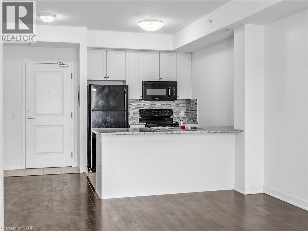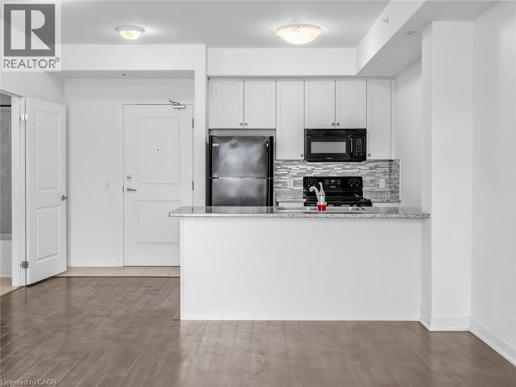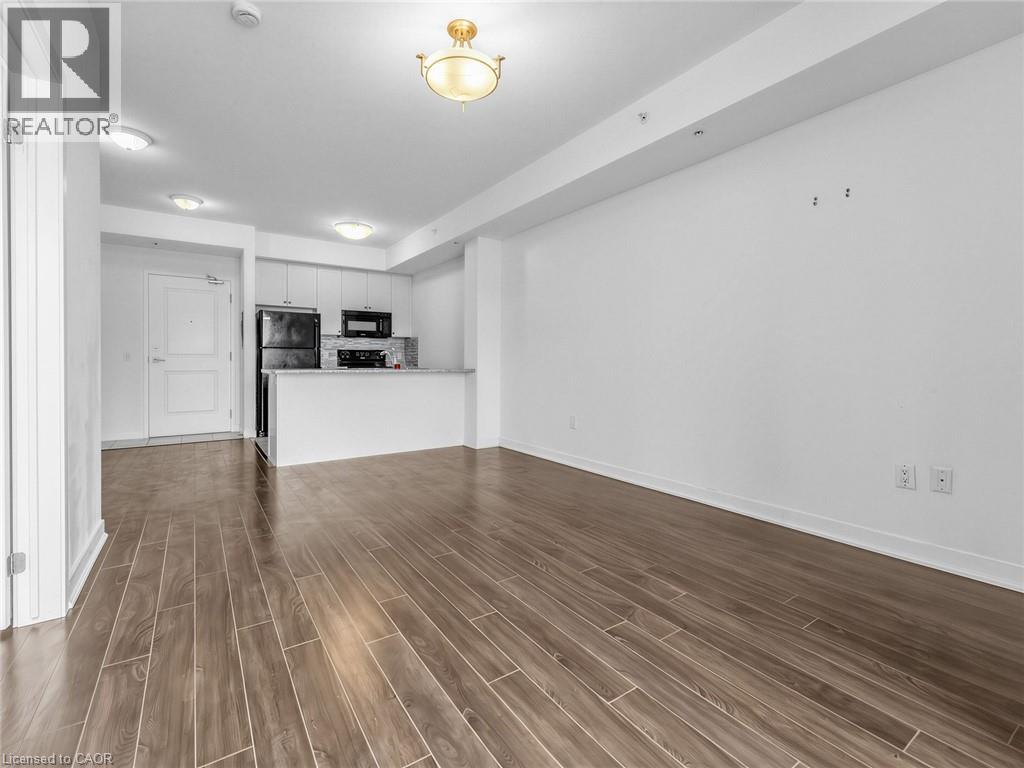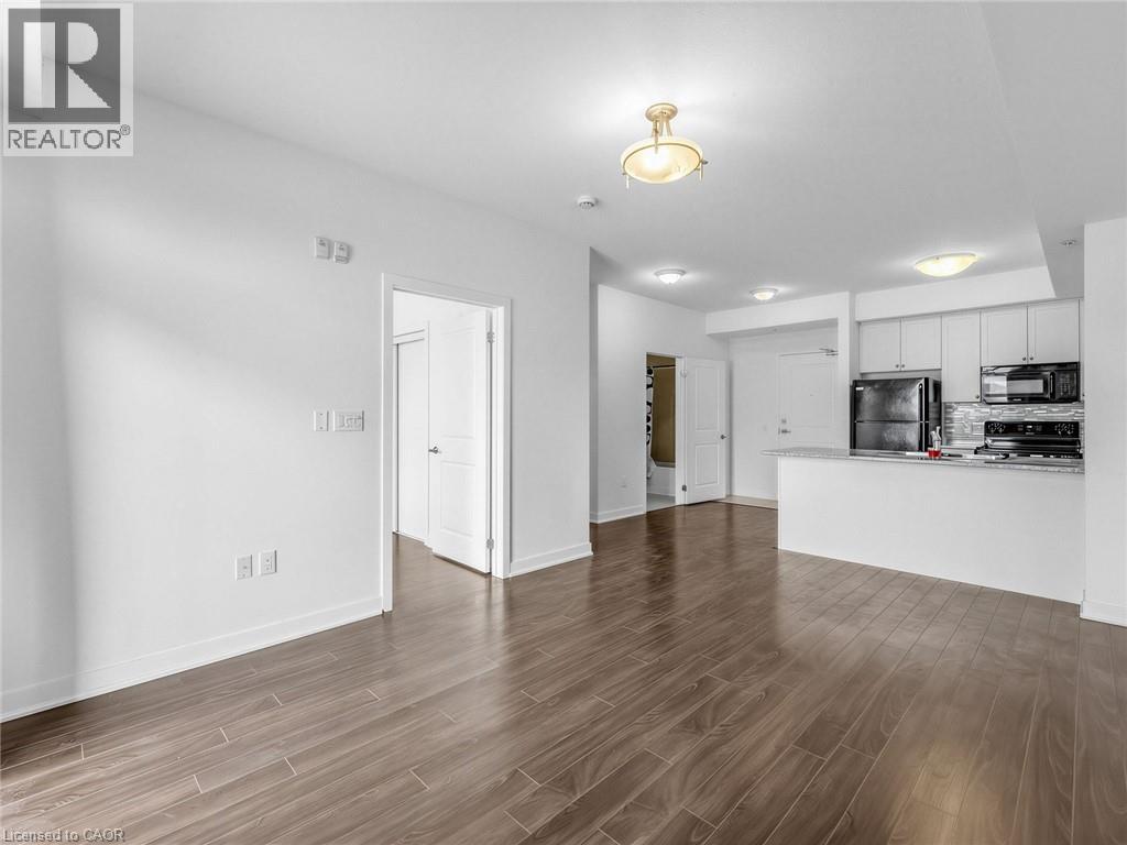 Sun-filled 1-bedroom, 1-bathroom suite at Vibe Condominium, ideally located at the desirable intersection of Appleby Line and Corporate Drive in Burlington. This bright east-facing unit offers an open-concept layout with 9-foot ceilings and engineered hardwood flooring throughout. The modern kitchen overlooks the combined living and dining area, which extends to a spacious balcony-perfect for relaxing or entertaining. The suite features a generously sized 4-piece bathroom and convenient in-suite stacked washer and dryer. Included are one oversized parking space located close to the elevator and one locker. Situated in a prime Burlington location close to shops, restaurants, schools, and all essential amenities, with easy access to the QEW, 403, 407, and major routes-ideal for comfortable living and easy commuting. Enjoy premium building amenities including a rooftop patio with BBQs, fully equipped fitness centre, party room, and visitor parking. (id:64974)
