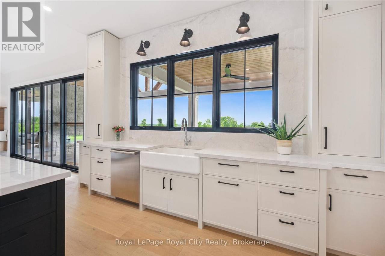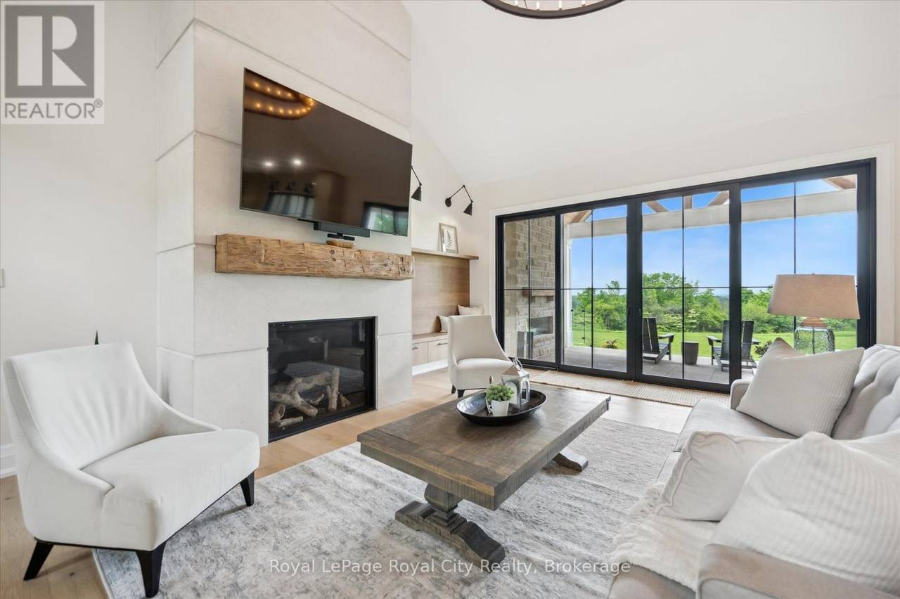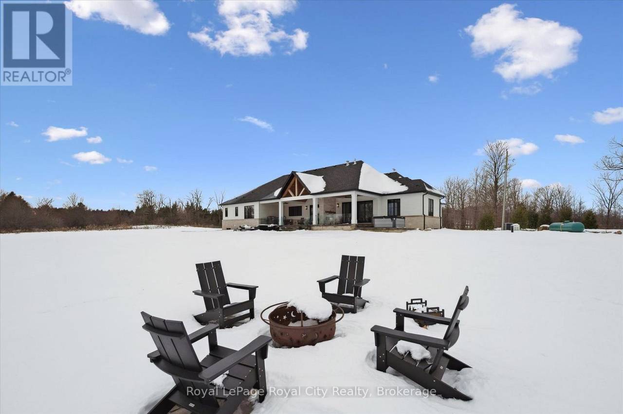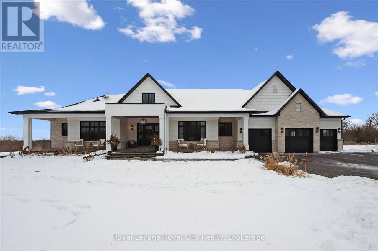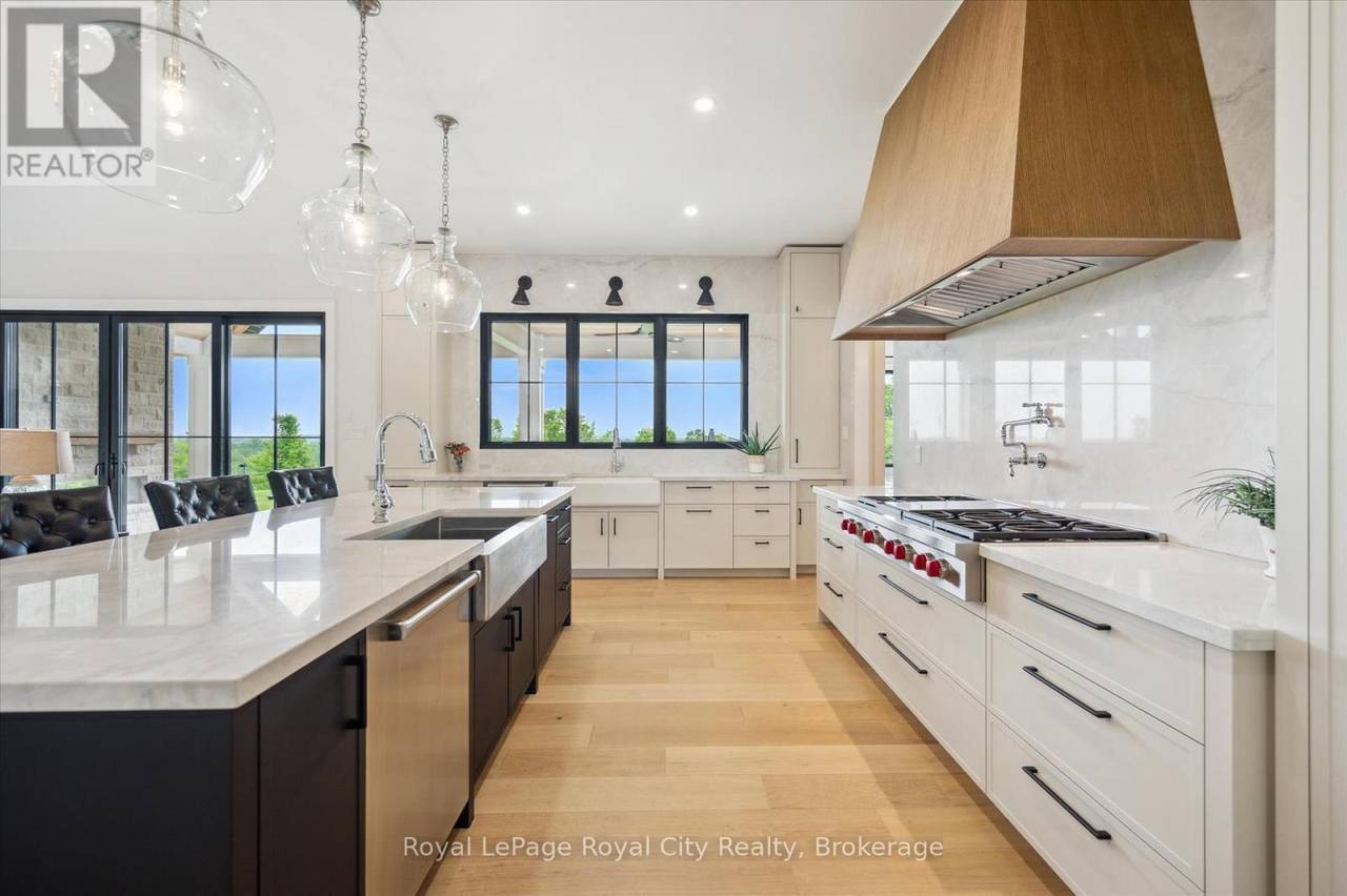 Custom-Built Luxury Bungalow on 2.4 Private Acres with Escarpment Views. Welcome to this one-of-a-kind custom-built bungalow offering 3,400 sq. ft. of refined main floor living space, perfectly nestled on 2.4 acres of serene countryside. With panoramic views of the escarpment and set well back from the road, this residence offers exceptional privacy while being just 20 minutes from the 401. Designed with luxury and functionality in mind, the home boasts soaring ceilings and oversized windows, creating an expansive, airy ambiance throughout allowing the natural landscape in and flooding the home with light. The main level features a seamless open-concept layout anchored by a great room and primary bedroom with oversized sliding doors opening to an extended outdoor living space with a two sided fire place, hot tub, and an abundance of entertaining space. The heart of the home is a chefs dream kitchen outfitted with top-tier Wolf, SubZero, and Cove appliances, complemented by a stylish servery just off the formal dining room. Retreat to the spacious primary suite, a true sanctuary offering an oversized spa-inspired ensuite complete with heated floors, a large walk-in shower, water closet, luxurious soaker tub, dual sinks with an extended vanity, and a generously sized walk-in closet. Two additional bedrooms on the main floor each enjoy their own private ensuites. Downstairs, the wow factor continues. The 10-foot ceilings and expansive windows make the finished basement feel anything but below grade. Designed for versatility, the lower level includes a full gym, sauna, and a private entry from the oversized 3-car garage making it perfect for an in-law suite. This separate living space features a bedroom, full bath, and kitchenette with a fridge, sink, and microwave. Every detail has been thoughtfully considered. Truly, this is a rare opportunity to own a stunning estate home where luxury, privacy, and convenience converge. (id:64974)