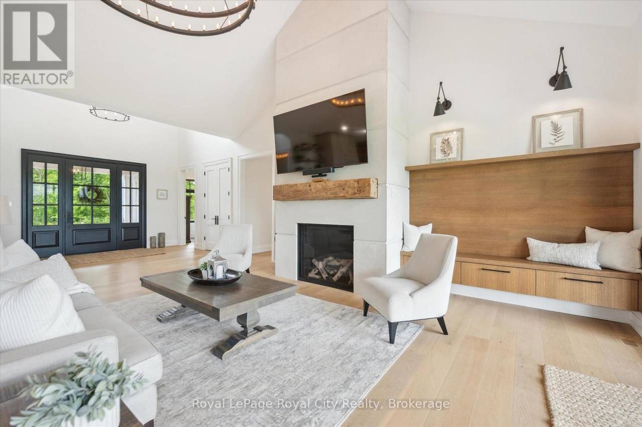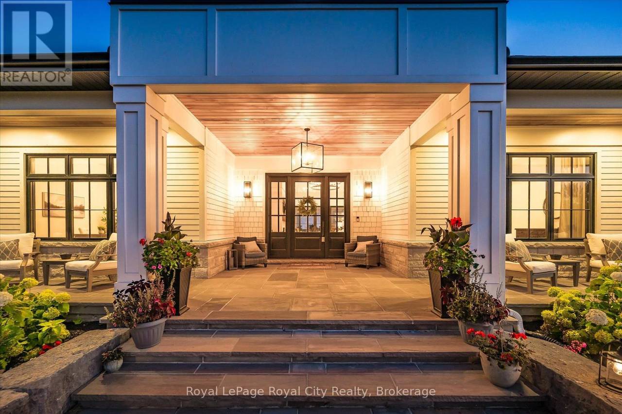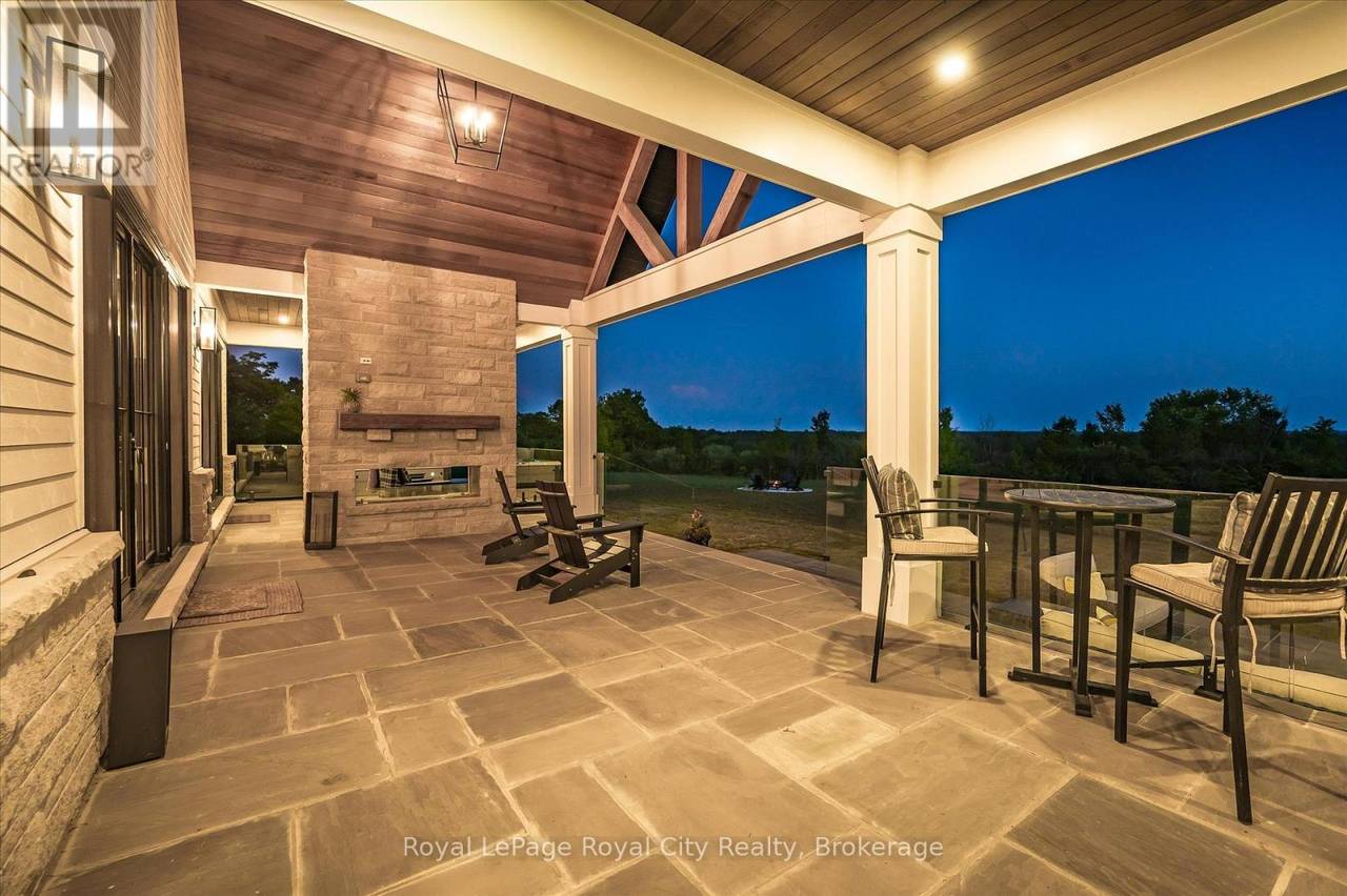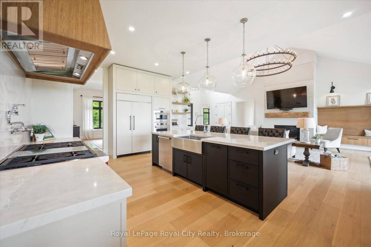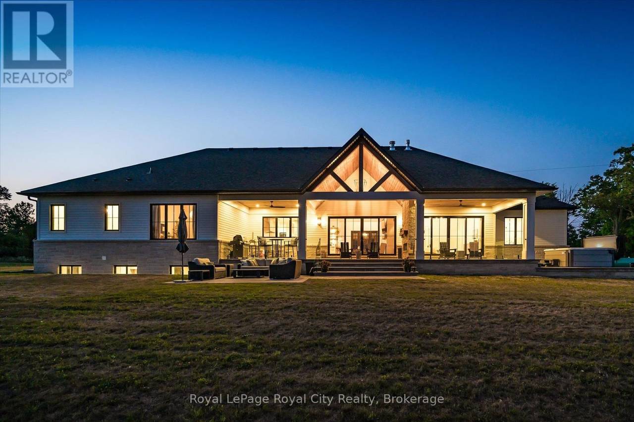 Custom-Built Luxury Bungalow on 2.4 Private Acres with Escarpment Views. Welcome to this one-of-a-kind custom-built bungalow offering 3,400 sq. ft. of refined main floor living space, perfectly nestled on 2.4 acres of serene countryside. With panoramic views of the escarpment and set well back from the road, this residence offers exceptional privacy while being just 20 minutes from the 401. Designed with luxury and functionality in mind, the home boasts soaring ceilings and oversized windows, creating an expansive, airy ambiance throughout allowing the natural landscape in and flooding the home with light. The main level features a seamless open-concept layout anchored by a great room and primary bedroom with oversized sliding doors opening to an extended outdoor living space with a two sided fire place, hot tub, and an abundance of entertaining space. The heart of the home is a chefs dream kitchen outfitted with top-tier Wolf, SubZero, and Cove appliances, complemented by a stylish servery just off the formal dining room. Retreat to the spacious primary suite, a true sanctuary offering an oversized spa-inspired ensuite complete with heated floors, a large walk-in shower, water closet, luxurious soaker tub, dual sinks with an extended vanity, and a generously sized walk-in closet. Two additional bedrooms on the main floor each enjoy their own private ensuites. Downstairs, the wow factor continues. The 10-foot ceilings and expansive windows make the finished basement feel anything but below grade. Designed for versatility, the lower level includes a full gym, sauna, and a private entry from the oversized 3-car garage making it perfect for an in-law suite. This separate living space features a bedroom, full bath, and kitchenette with a fridge, sink, and microwave. Every detail has been thoughtfully considered. Truly, this is a rare opportunity to own a stunning estate home where luxury, privacy, and convenience converge. (id:64974)