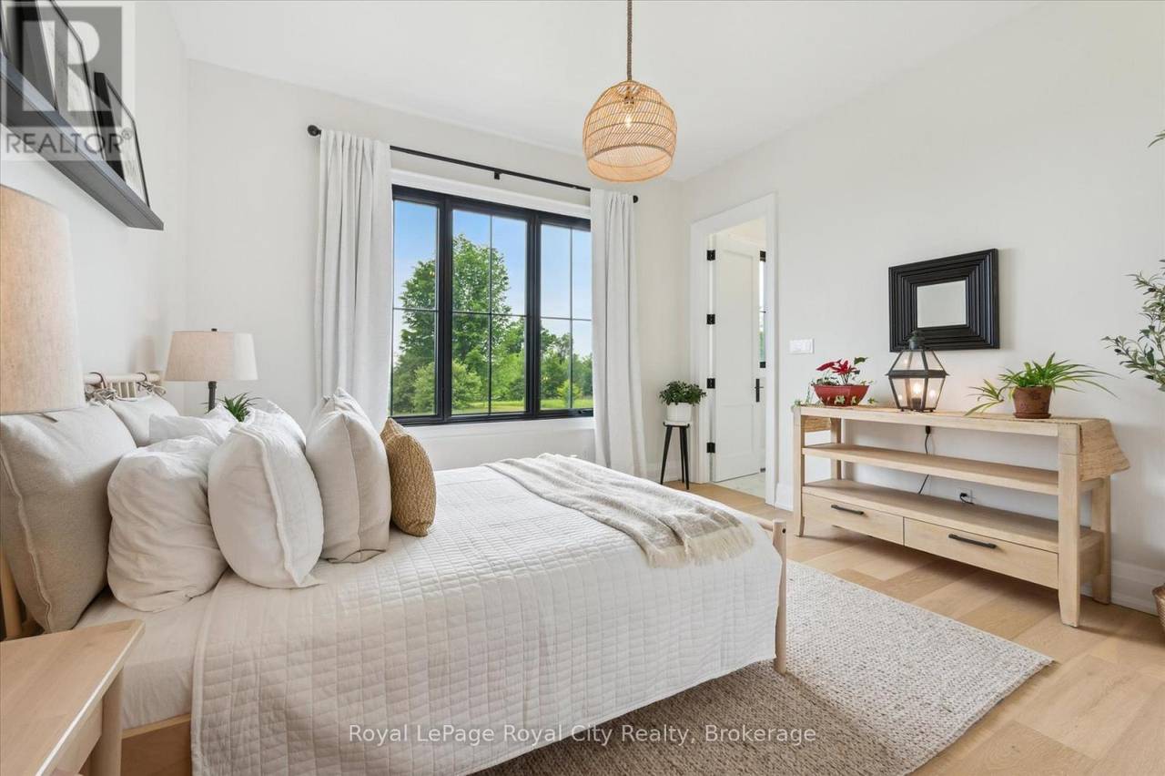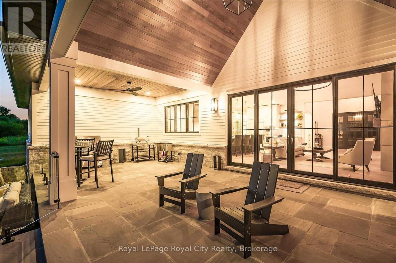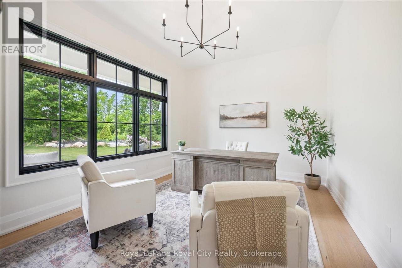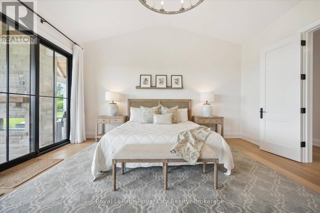 Custom-Built Luxury Bungalow on 2.4 Private Acres with Escarpment Views. Welcome to this one-of-a-kind custom-built bungalow offering 3,400 sq. ft. of refined main floor living space, perfectly nestled on 2.4 acres of serene countryside. With panoramic views of the escarpment and set well back from the road, this residence offers exceptional privacy while being just 20 minutes from the 401. Designed with luxury and functionality in mind, the home boasts soaring ceilings and oversized windows, creating an expansive, airy ambiance throughout allowing the natural landscape in and flooding the home with light. The main level features a seamless open-concept layout anchored by a great room and primary bedroom with oversized sliding doors opening to an extended outdoor living space with a two sided fire place, hot tub, and an abundance of entertaining space. The heart of the home is a chefs dream kitchen outfitted with top-tier Wolf, SubZero, and Cove appliances, complemented by a stylish servery just off the formal dining room. Retreat to the spacious primary suite, a true sanctuary offering an oversized spa-inspired ensuite complete with heated floors, a large walk-in shower, water closet, luxurious soaker tub, dual sinks with an extended vanity, and a generously sized walk-in closet. Two additional bedrooms on the main floor each enjoy their own private ensuites. Downstairs, the wow factor continues. The 10-foot ceilings and expansive windows make the finished basement feel anything but below grade. Designed for versatility, the lower level includes a full gym, sauna, and a private entry from the oversized 3-car garage making it perfect for an in-law suite. This separate living space features a bedroom, full bath, and kitchenette with a fridge, sink, and microwave. Every detail has been thoughtfully considered. Truly, this is a rare opportunity to own a stunning estate home where luxury, privacy, and convenience converge. (id:64974)