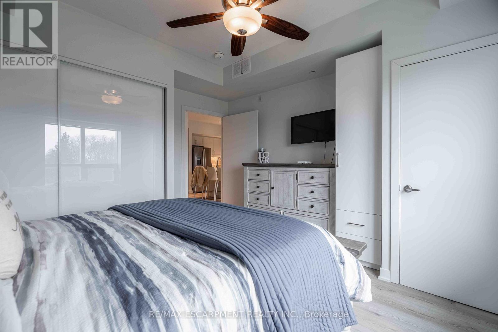 Welcome to this beautiful newer-build condo in the heart of desirable Ancaster, offering the perfect blend of modern design, comfort, and convenience. This bright and spacious unit features an open-concept layout with large windows that fill the space with natural light. Thoughtfully designed with accessible doorways and hallways, the unit provides ease of movement and functional living for all lifestyles. Enjoy cooking and entertaining in the upgraded kitchen, complete with premium finishes and enhancements that set this unit apart from others in the building. Additional upgrades throughout the condo add both style and value. Step outside to your private terrace overlooking peaceful green space, creating a quiet and relaxing setting rarely found in condo living. This unit also includes the convenience of owned parking and an owned storage locker. Residents enjoy fantastic building amenities including a fully equipped fitness centre, party room, and an outdoor patio with BBQs, perfect for entertaining or relaxing with friends and family. Ideally located close to all amenities in Ancaster, including shopping, restaurants, parks, and everyday conveniences, with easy highway access for commuters. A rare opportunity to own a beautifully upgraded condo in one of Ancaster's most sought-after communities. (id:64974)