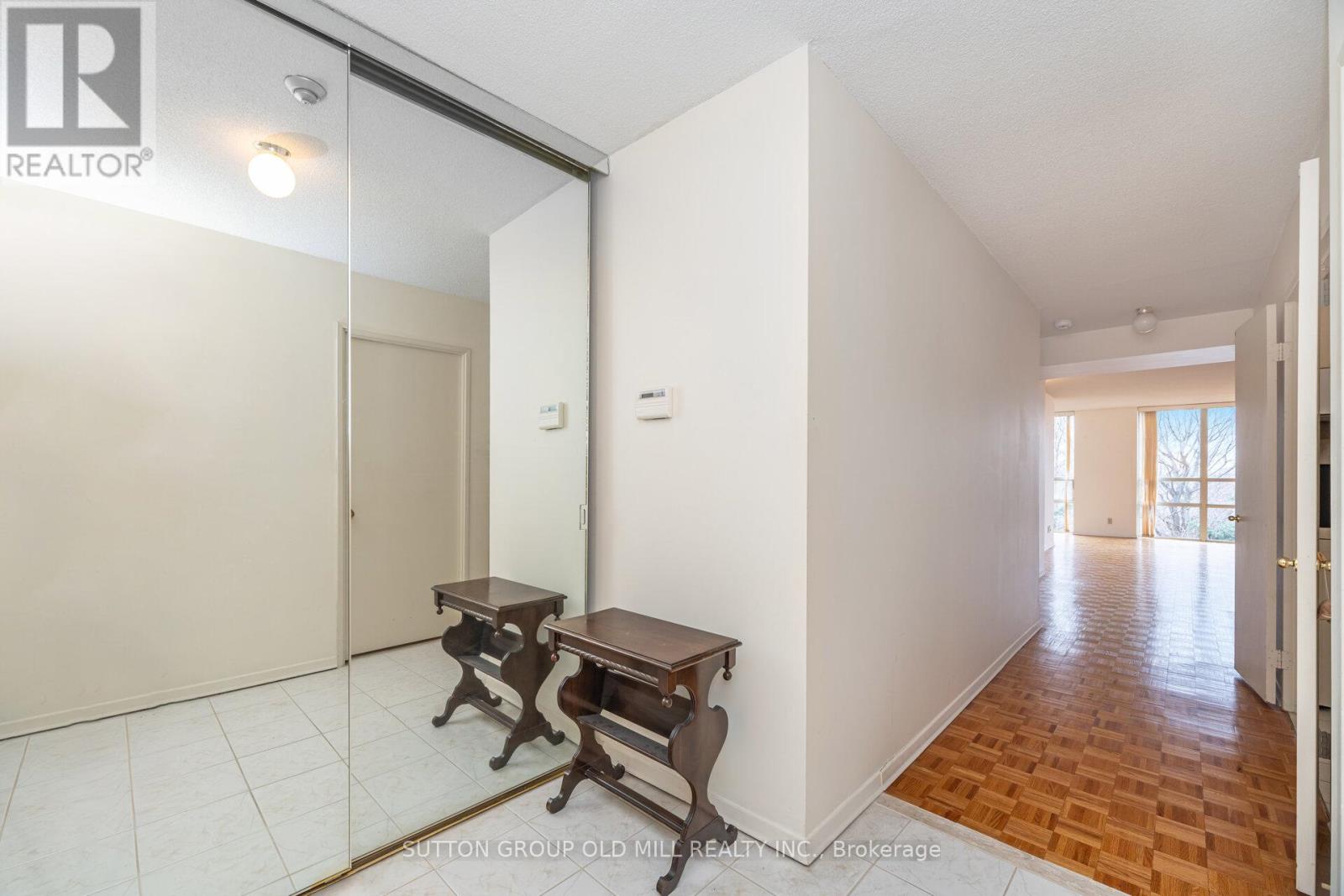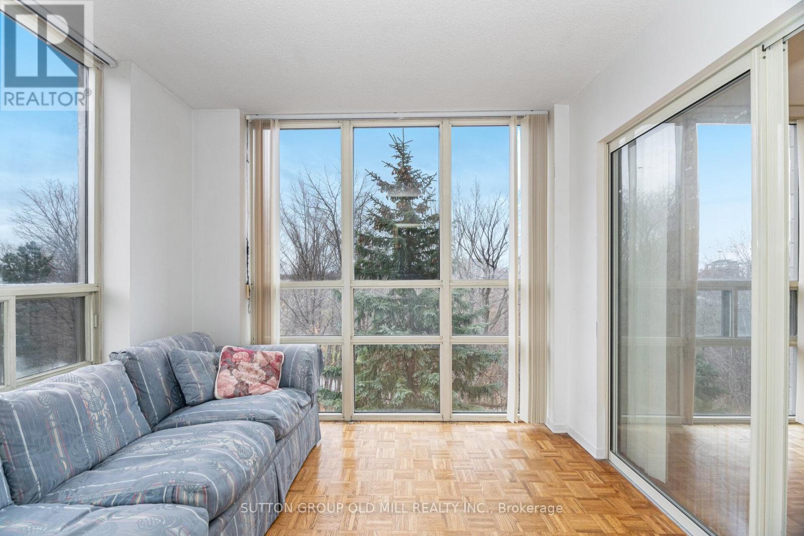 Welcome to one of the most sought-after floor plans at The Palisades-an exceptional 2 + 1 bedroom, 2 full bathroom suite offering almost 1,400 sq. ft. of bright, well-designed living space. The generous 04 layout is known for its balance of openness, privacy, and natural light, with a corner-like exposure with windows on the south and east side.Step into a wide foyer hallway that leads to an expansive open-concept living and dining area, highlighted by floor-to-ceiling windows framing a serene, through-the-trees view of the Flemington Golf Course. Sunlight pours into the suite, enhanced by the inviting sunroom, which offers a corner-style panorama perfect for reading, relaxing, or enjoying morning coffee.The galley kitchen includes a dedicated eat-in area comfortably seating four, while the large laundry room provides additional storage space.The primary bedroom features a spacious walk-in closet and a private 4-piece ensuite. The second bedroom enjoys excellent natural light with its sliding glass door and shares the sunny south-east exposure through the sunroom. Classic parquet flooring adds warmth and charm throughout the main living spaces.The Palisades complex offers resort-style amenities, including a sunlit indoor pool, fully equipped fitness centre, saunas, and more. One parking space is included.This is a beautifully maintained, light-filled home in an outstanding building-perfect for those seeking space, comfort, and a welcoming community. (id:64974)
