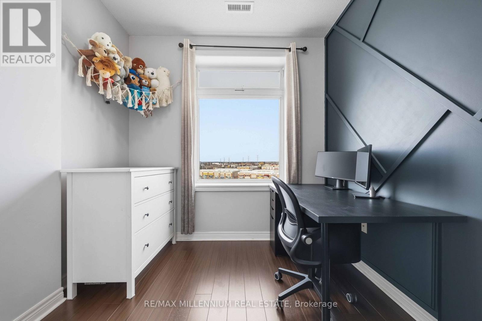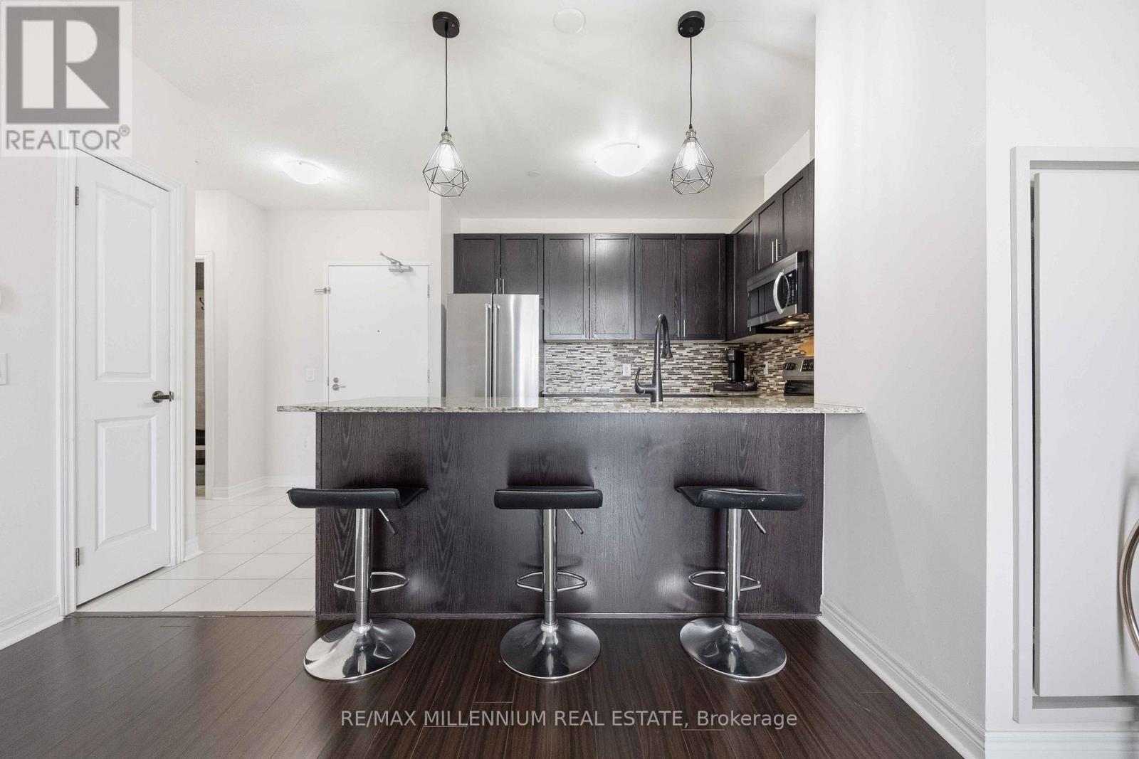 This home provides the perfect blend of comfort and convenience in this bright and spacious 2 bedroom plus enclosed den, 2 bathroom suite offering over 1000 sq ft of functional living space with 2 parking spots. Located on the 5th floor, this well maintained unit features a smart layout with no wasted space and an abundance of natural light throughout.The fully enclosed den offers incredible flexibility and can easily function as a third bedroom, home office, or guest space. The open concept living and dining area flows seamlessly into a modern kitchen complete with granite countertops, backsplash, and stainless steel appliances. Laminate flooring runs throughout the unit with no carpet, creating a clean and cohesive feel. Step out onto your open north facing balcony and enjoy unobstructed views, adding to the sense of space and privacy. This unit also includes the rare convenience of two parking spots, one underground and one surface, along with a locker for additional storage. Situated in a well managed green building known for its energy efficiency, residents benefit from lower than average maintenance fees without compromising on space or comfort. Ideally located near Markham and Denison, with easy access to Highway 407, public transit, schools, library, shopping, and everyday essentials. An excellent opportunity for first time buyers, down sizers, or anyone looking for a spacious and affordable option in a prime Markham location. (id:64974)