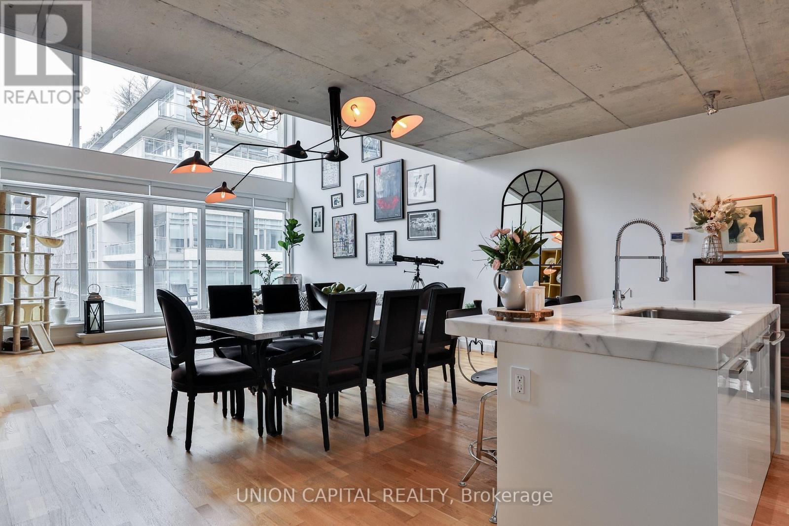 Welcome to this stylish and modern two-story FULLY FURNISHED loft at the highly sought-after Seventy5 Portland. Featuring over 1,300 sq ft, soaring concrete ceilings, expansive floor-to-ceiling windows, and a bright open-concept layout, this unit offers a perfect blend of contemporary design and urban comfort. With two convenient entrances - one from the main floor and a second from the upper level - this unique layout adds both functionality and privacy. The upgraded kitchen is equipped with high-end appliances, sleek cabinetry, and a spacious island ideal for cooking and entertaining. The living and dining areas flow seamlessly and open to a private balcony, creating a great space to relax or host guests. The bedroom offers a functional layout with ample storage, while the overall design maximizes both space and natural light. Located in a well-managed building with desirable amenities, this is an excellent opportunity to enjoy vibrant city living. Ideally situated in the heart of King West's coveted Entertainment District, this property is surrounded by some of Toronto's best restaurants and lifestyle amenities. Enjoy easy access to green spaces like Trinity Bellwoods Park and Stanley Park, perfect for outdoor activities and relaxation. The area is also home to top-rated schools and convenient shopping destinations including The Well and Stackt Market. (id:64974)