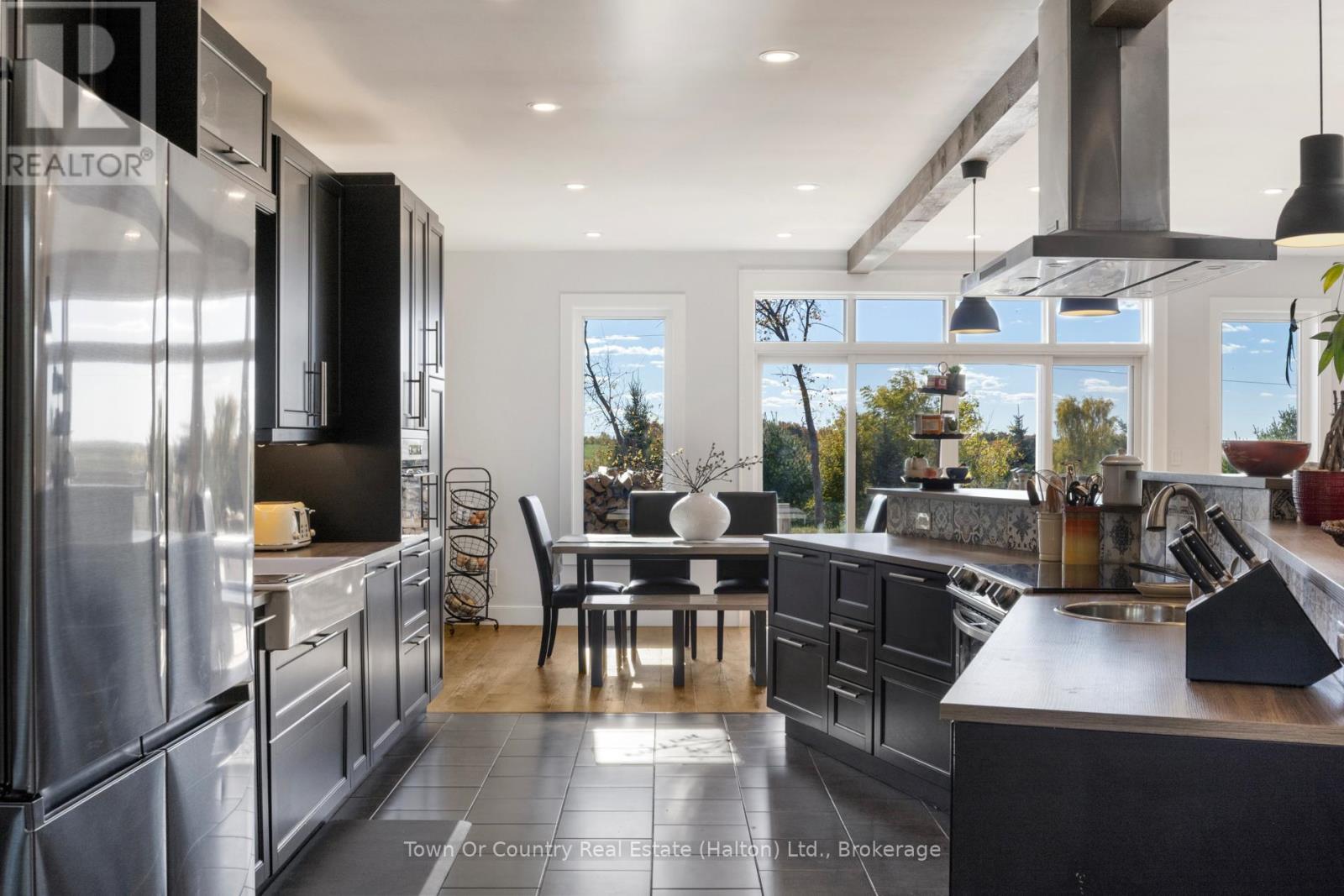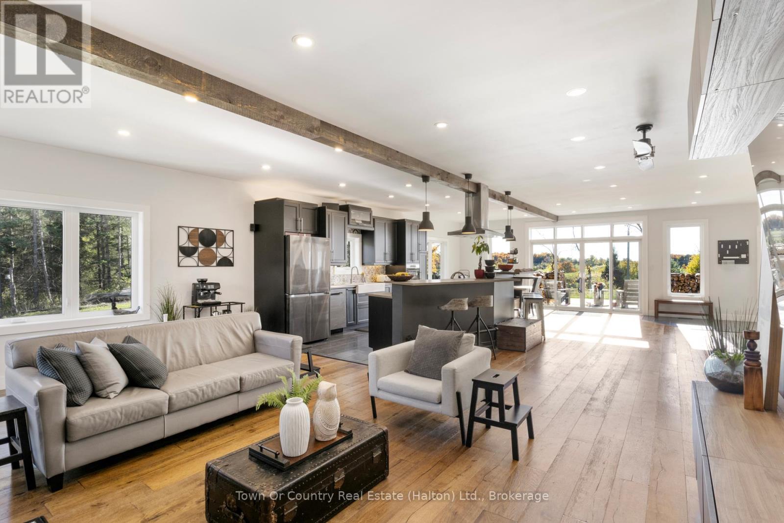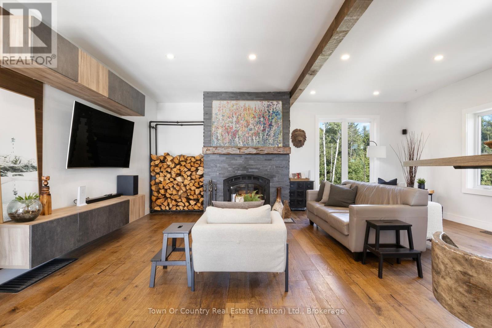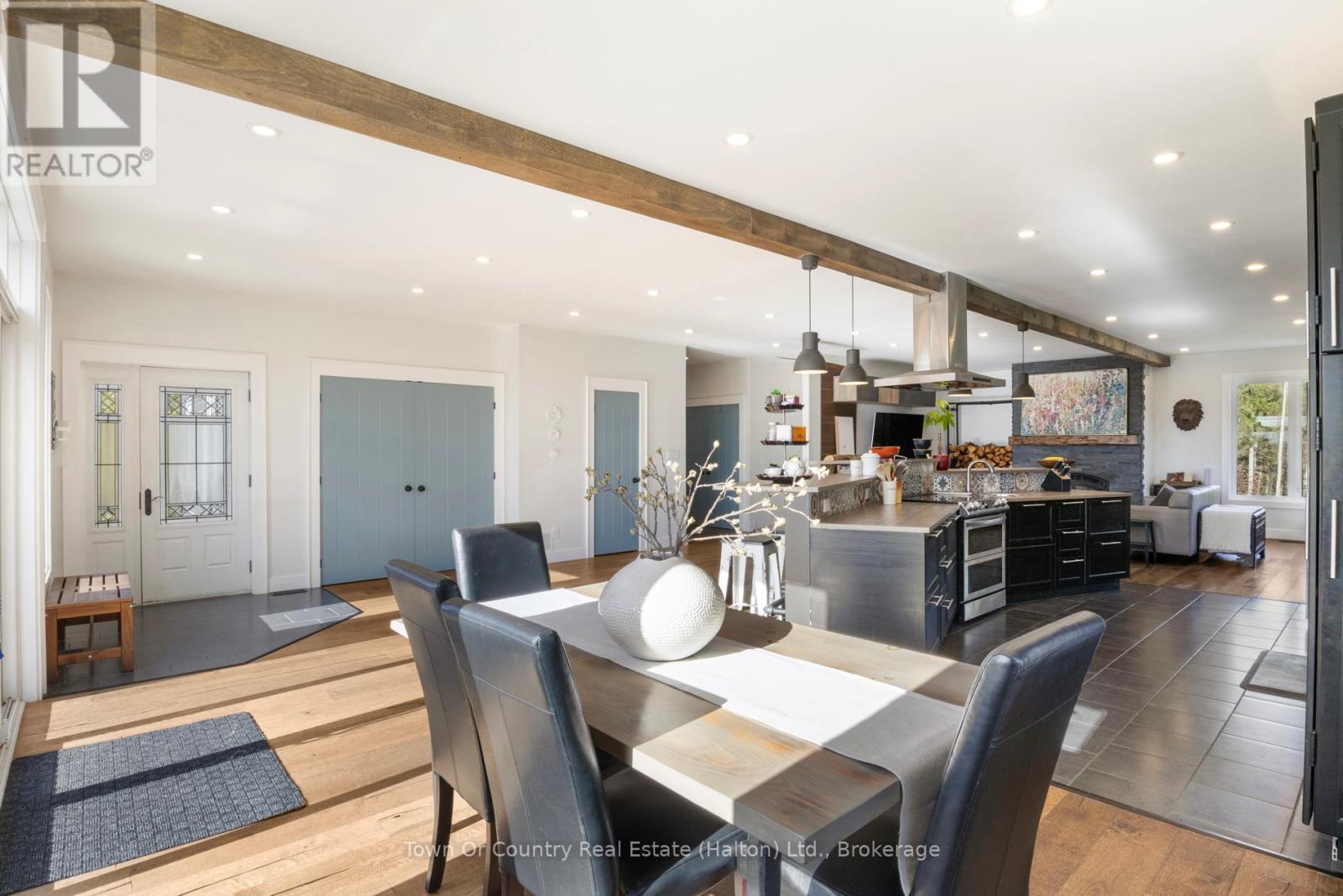 Welcome to 5041 Third Line in the south end of Erin - A custom-built 2017 bungalow with a walk-out basement leading to a professionally landscaped backyard featuring an inground pool with rock waterfall, set on a private 1.4-acre retreat surrounded by nature. Designed for both everyday comfort and effortless entertaining, this home offers a rare blend of space, privacy, and thoughtful design. The main floor bungalow layout is bright and open, with oversized windows that flood the home with natural light and frame peaceful views of the backyard. With 3 bedrooms, a dedicated office, and 3.5 bathrooms, the floor plan balances functionality with warmth. A striking floor-to-ceiling wood-burning fireplace, ducted into the central air system, adds both character and efficient heat. The kitchen and dining area are made for gatherings, featuring sleek appliances and room for a large family table. The fully finished walk-out basement extends the living space and functions like a second home. Complete with a family room, private office, generous storage, and a separate entrance to the side yard, it's ideal for multi-generational living, a future in-law suite, or relaxed game and movie nights. Step outside to your own resort-style escape. The landscaped pool with rock waterfall is the centre piece of a backyard designed for both entertaining and quiet moments. Stone interlock lounging areas, a firepit, terraced hardscaping, and mature trees create exceptional privacy and a true connection to nature. Additional highlights include a heated 3-car garage and a peaceful setting that feels worlds away - yet remains just 10 minutes to groceries, shops, trails, and Tim Hortons. Whether you're looking for a custom bungalow with a walk-out basement, a private property with a pool, or a home that adapts beautifully to changing life stages, 5041 Third Line offers a lifestyle that's hard to replace. (id:64974)