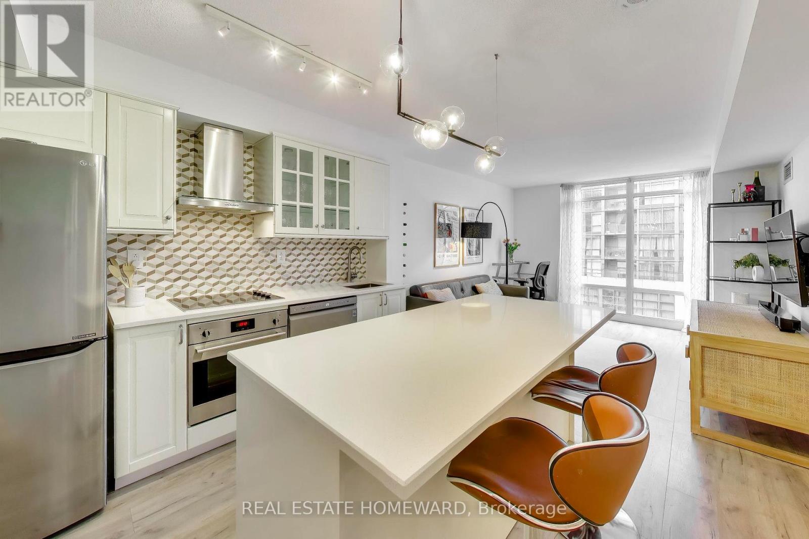 Welcome to an exceptional opportunity in the heart of CityPlace-where comfort, style, and convenience come together seamlessly.This 1-bedroom + spacious den suite offers an impressive layout that maximizes every square foot. The versatile den is large enough to function as a home office or nursery, perfect for modern urban living. The condo boasts custom closets throughout, offering ample storage space within the unit. The updated kitchen is a true highlight, featuring a generous island ideal for entertaining or casual dining, complemented by sleek quartz countertops and a stunning marble backsplash. Whether you're cooking or hosting, this space delivers both function and flair. Enjoy your balcony overlooking a peaceful, landscaped garden courtyard, a rare retreat from the city's energy, yet just steps from it all. Located in a quiet boutique-style building, residents benefit from a more intimate living experience while still enjoying access to world-class amenities including a pool, hot tub, party room, guests suites, gyms and more! Additional conveniences include a large private locker located on the same floor as the unit making additional storage easy and accessible. Step outside and find yourself moments from Toronto's most iconic destinations, including the waterfront, vibrant King West, CN Tower, Roger's Centre, top dining, entertainment, and family-friendly amenities. With excellent nearby facilities for kids and green spaces at your doorstep, this home offers something for every lifestyle. A perfect blend of tranquility and urban convenience-this is downtown living at its finest! (id:64974)