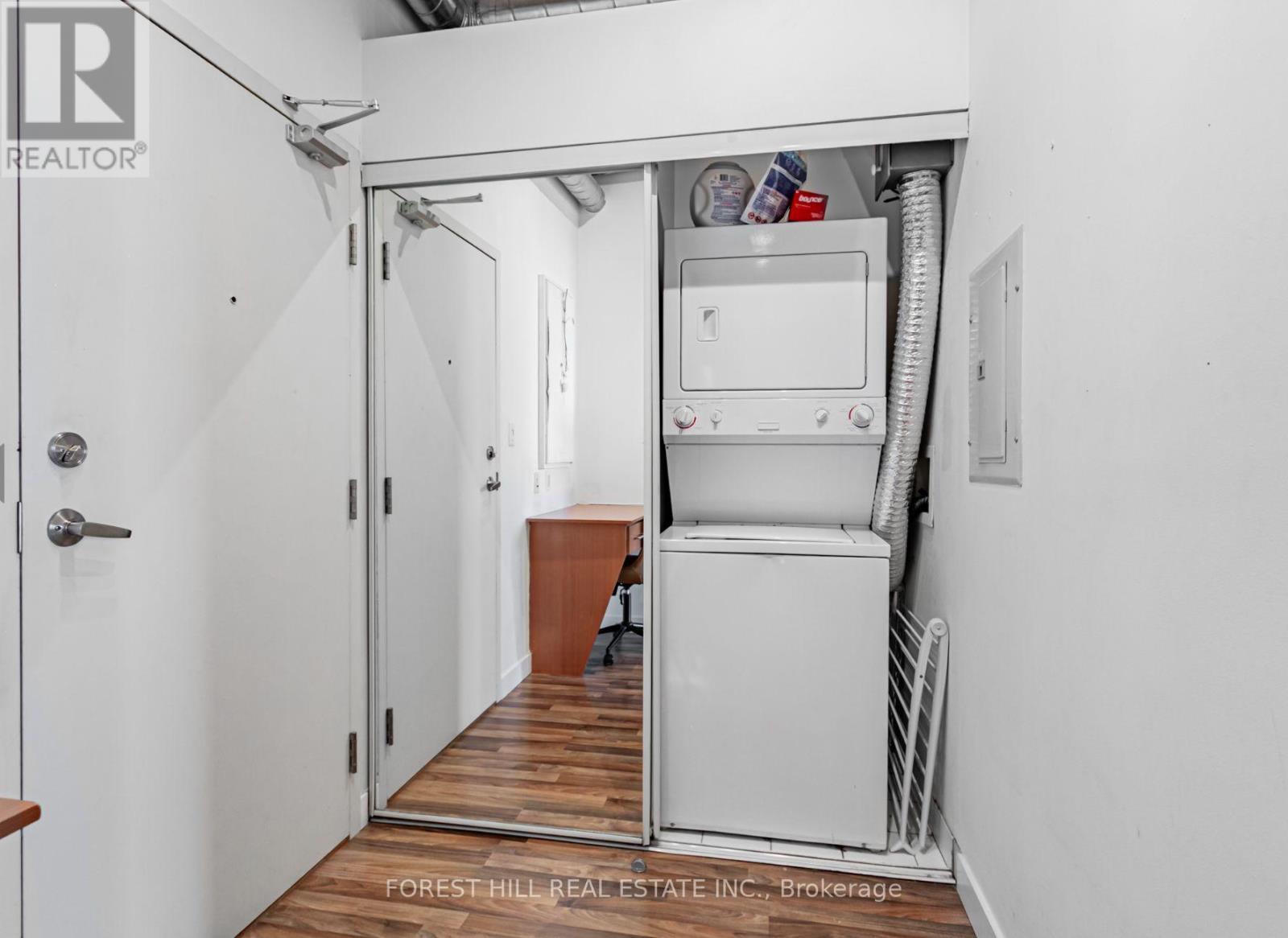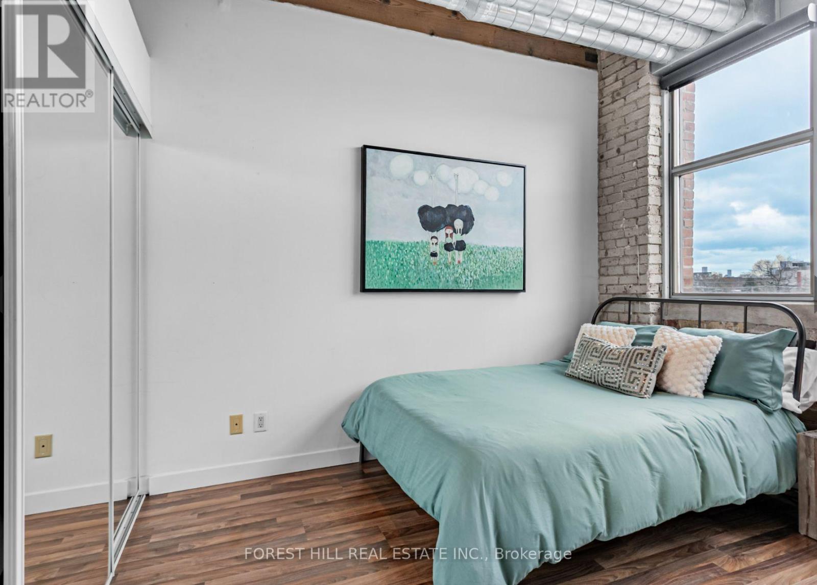 The Feather Factory Lofts boutique building features one of the rare the authentic Loft units in every sense. Take the opportunity to walk into the perfect mix of modern industrial & warmth with the urban lobby to tell you and your guests that you're about to walk into something special. Exposed brick and wood beams are just the beginning. South/East facing windows offers the framework for the natural art of a clear view of the downtown skyline. The view is as interesting in the day as the evening. Once inside you'll appreciate the open concept living space complete with the soaring ceilings. Picture yourself in the well-appointed kitchen that features full sized appliances that can handle any gathering. The whole kitchen is tied together with a stainless steel countertop. Sit up to the counter-height bar to enjoy a quiet morning with your coffee. The loft's bedroom blends the same elements of brick, wood, and natural light. Huge triple mirrored closet with organizers. Bathroom features a glass enclosed shower and storage cabinets. You'll find more storage in the main foyer mirrored closet that also contains the ensuite private washer/dryer. Now let's talk about the neighbourhood....Roncesvalles is steps away with a robust community of amenities, shopping, restaurants, bars, etc. High Park is an easy 15 min walk. Transit is a 7 min walk (500 m) to Dundas West Station which also has unique access to the UP Express train. (id:64974)