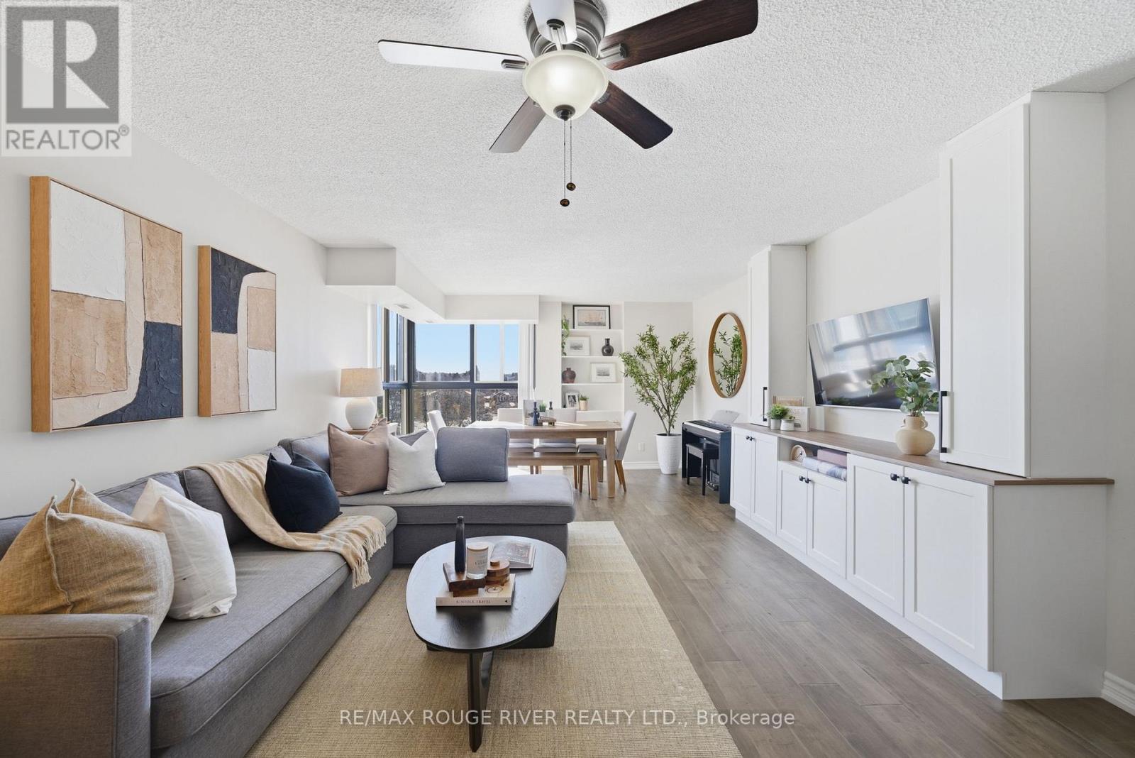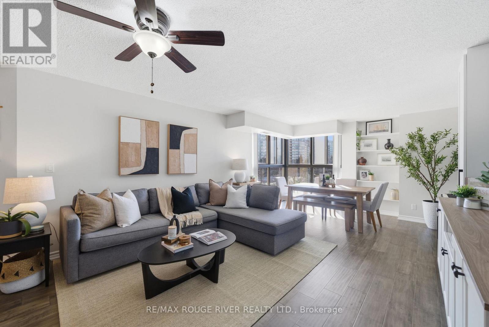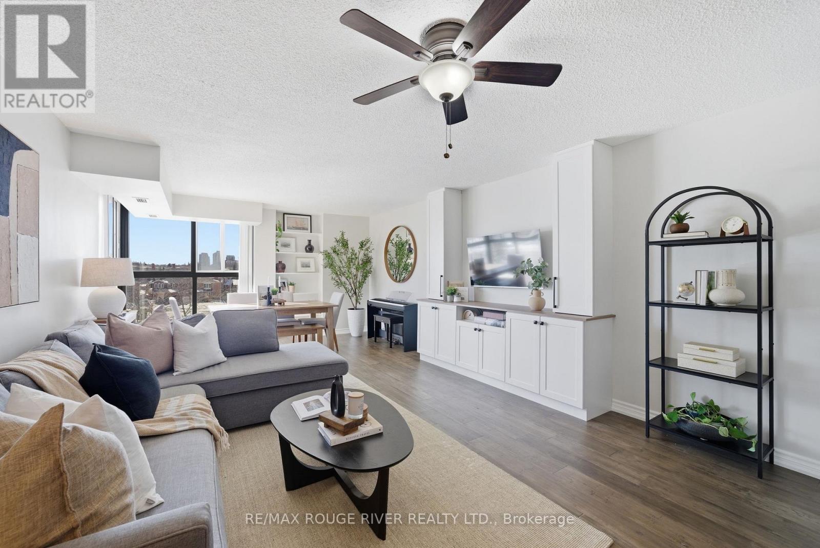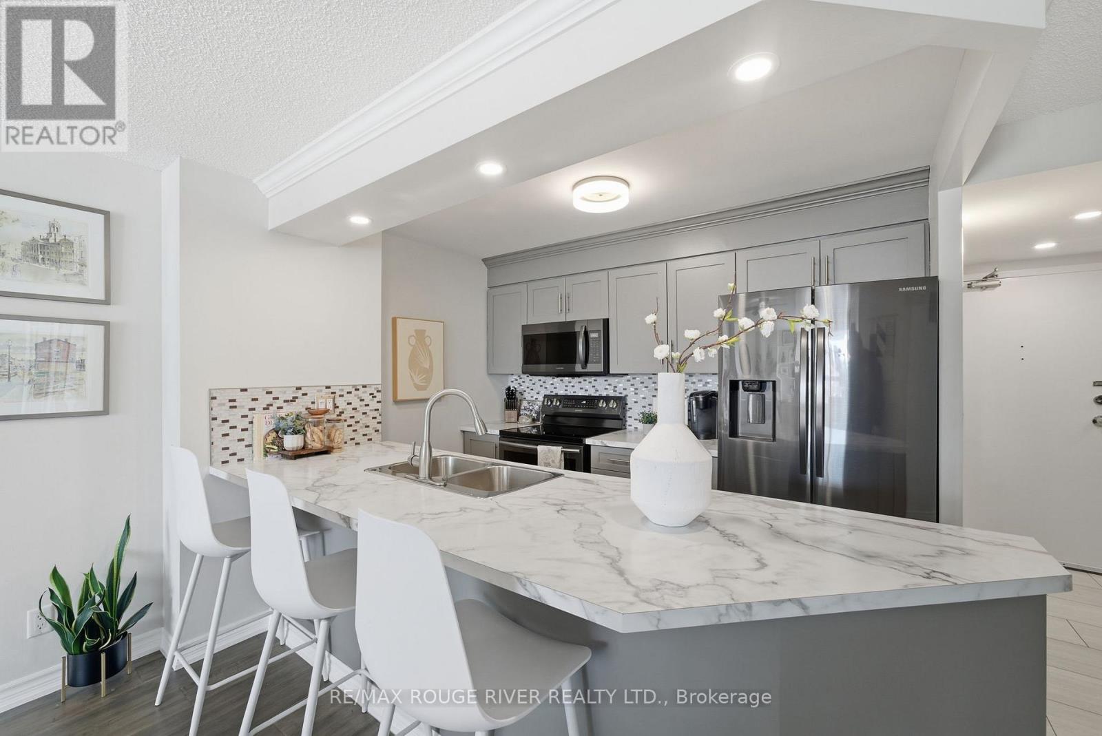 Step into 1,100 sq. ft. of bright, renovated condo living in this spacious 2-bedroom, 2-bath suite with a well-designed open-concept layout. Floor-to-ceiling windows, 9-foot ceilings, and south-facing, tree-lined views fill the living and dining area with natural light. The modern kitchen features ample cabinetry, functional counter space, and new Samsung appliances, complemented by new in-suite laundry for turnkey convenience. The generous primary bedroom easily fits a king-sized bed and includes double closets and a private ensuite. The second bedroom is ideal for guests, a home office, or family use, while a flexible work-from-home area and library or pantry add versatility. Includes one owned underground parking space, a locker, and abundant visitor parking. Enjoy luxury building amenities including concierge, indoor pool, sauna, gym, party room, billiards, and games room. Ideally located minutes from Guildwood GO Station, Lake Ontario, trails, transit, shopping, and everyday amenities-this is a must-see opportunity. (id:64974)