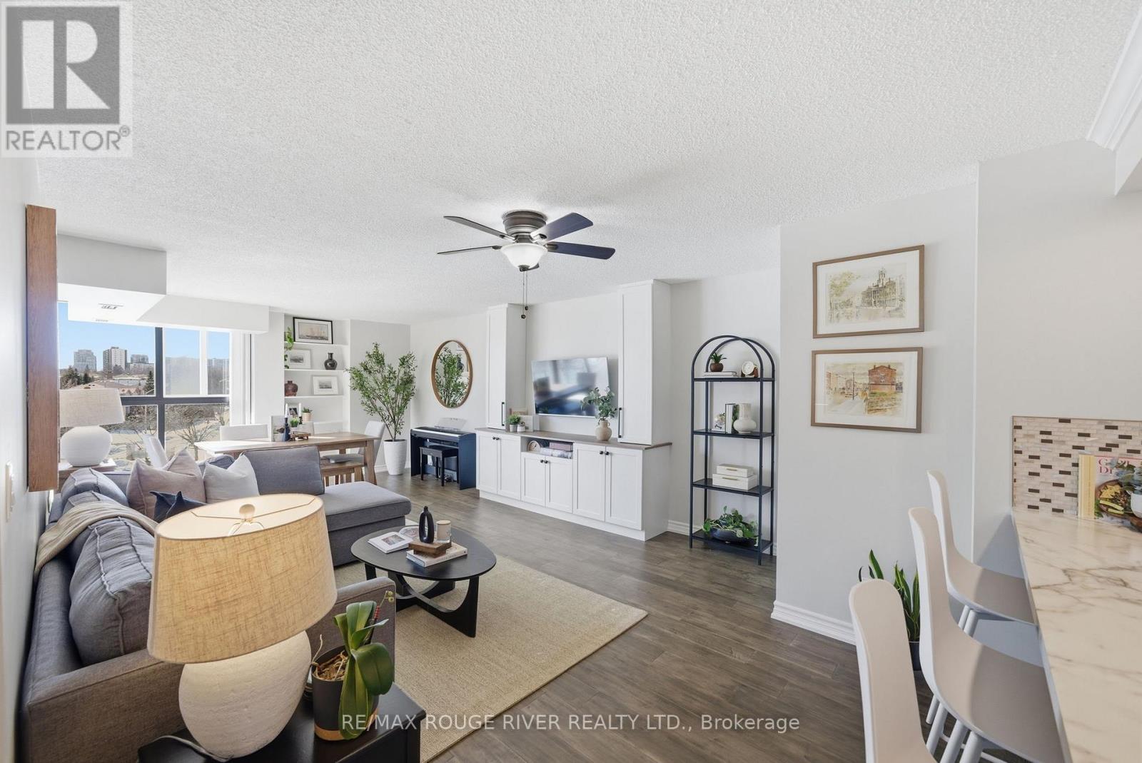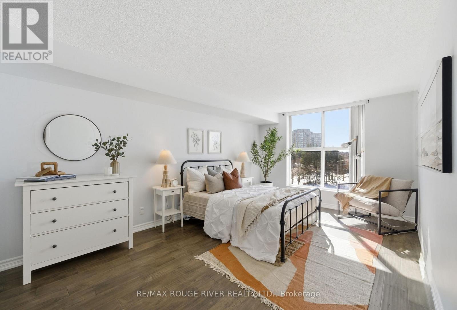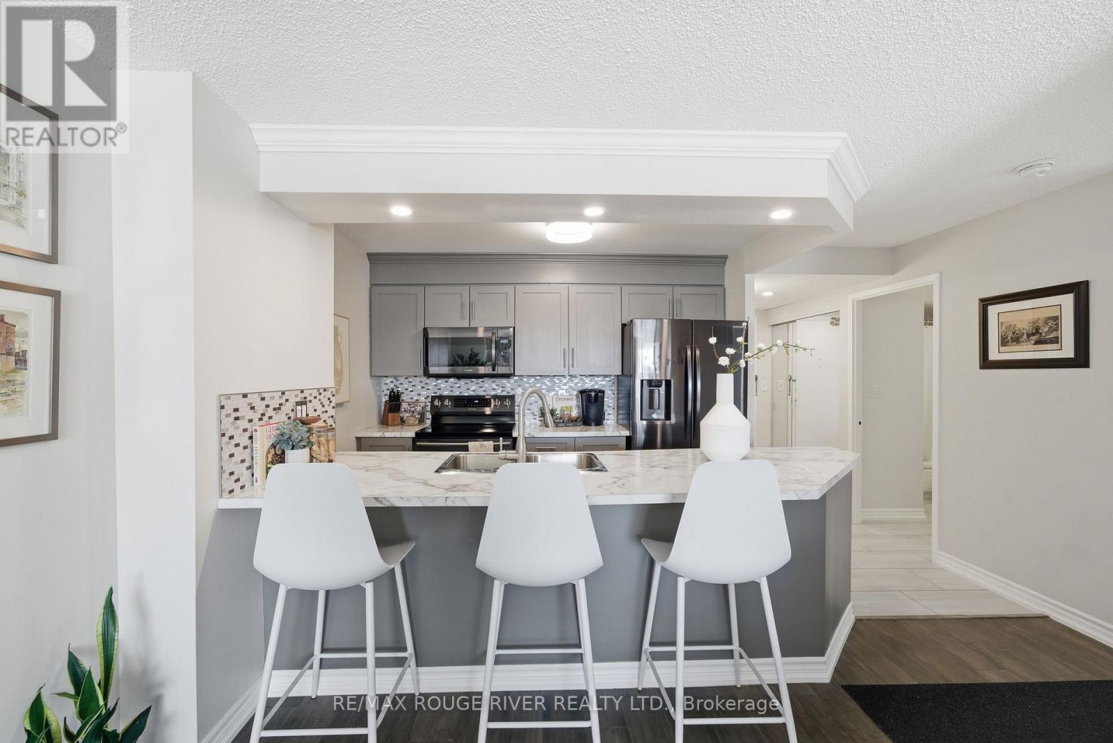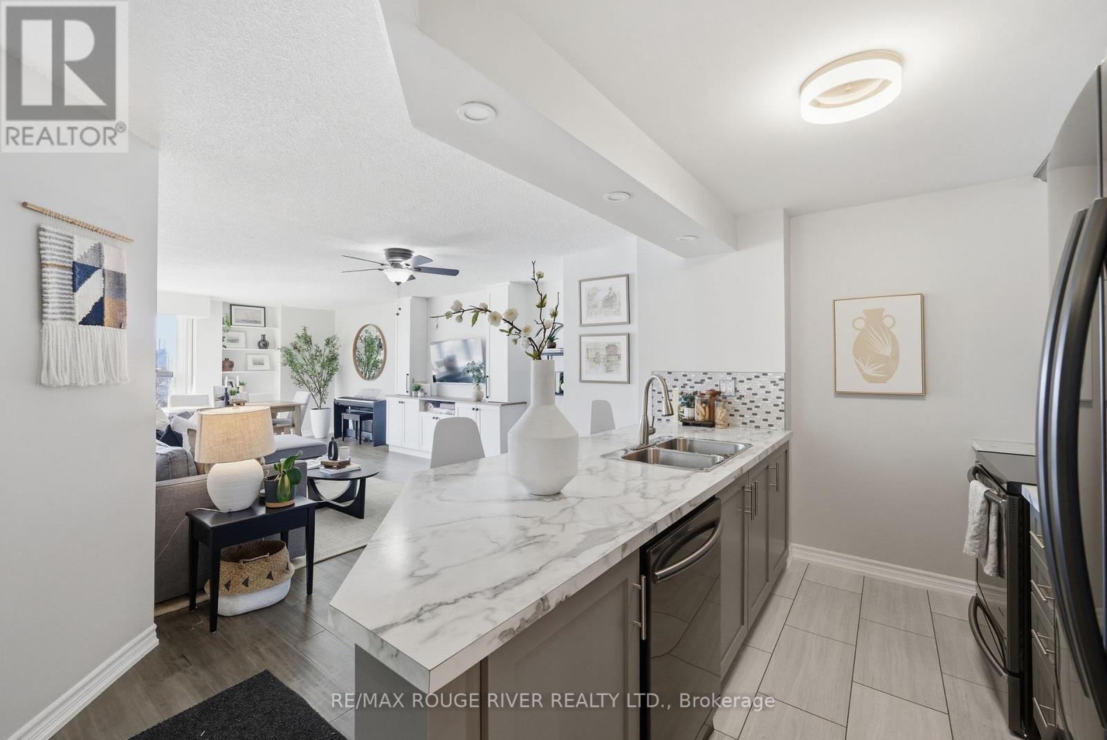 Step into 1,100 sq. ft. of bright, renovated condo living in this spacious 2-bedroom, 2-bath suite with a well-designed open-concept layout. Floor-to-ceiling windows, 9-foot ceilings, and south-facing, tree-lined views fill the living and dining area with natural light. The modern kitchen features ample cabinetry, functional counter space, and new Samsung appliances, complemented by new in-suite laundry for turnkey convenience. The generous primary bedroom easily fits a king-sized bed and includes double closets and a private ensuite. The second bedroom is ideal for guests, a home office, or family use, while a flexible work-from-home area and library or pantry add versatility. Includes one owned underground parking space, a locker, and abundant visitor parking. Enjoy luxury building amenities including concierge, indoor pool, sauna, gym, party room, billiards, and games room. Ideally located minutes from Guildwood GO Station, Lake Ontario, trails, transit, shopping, and everyday amenities-this is a must-see opportunity. (id:64974)