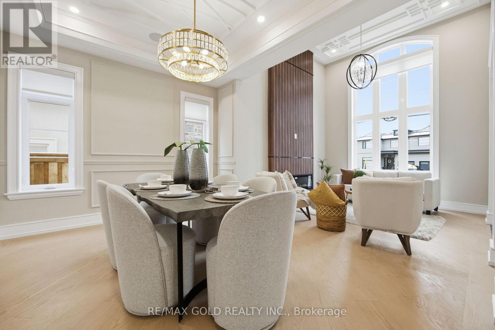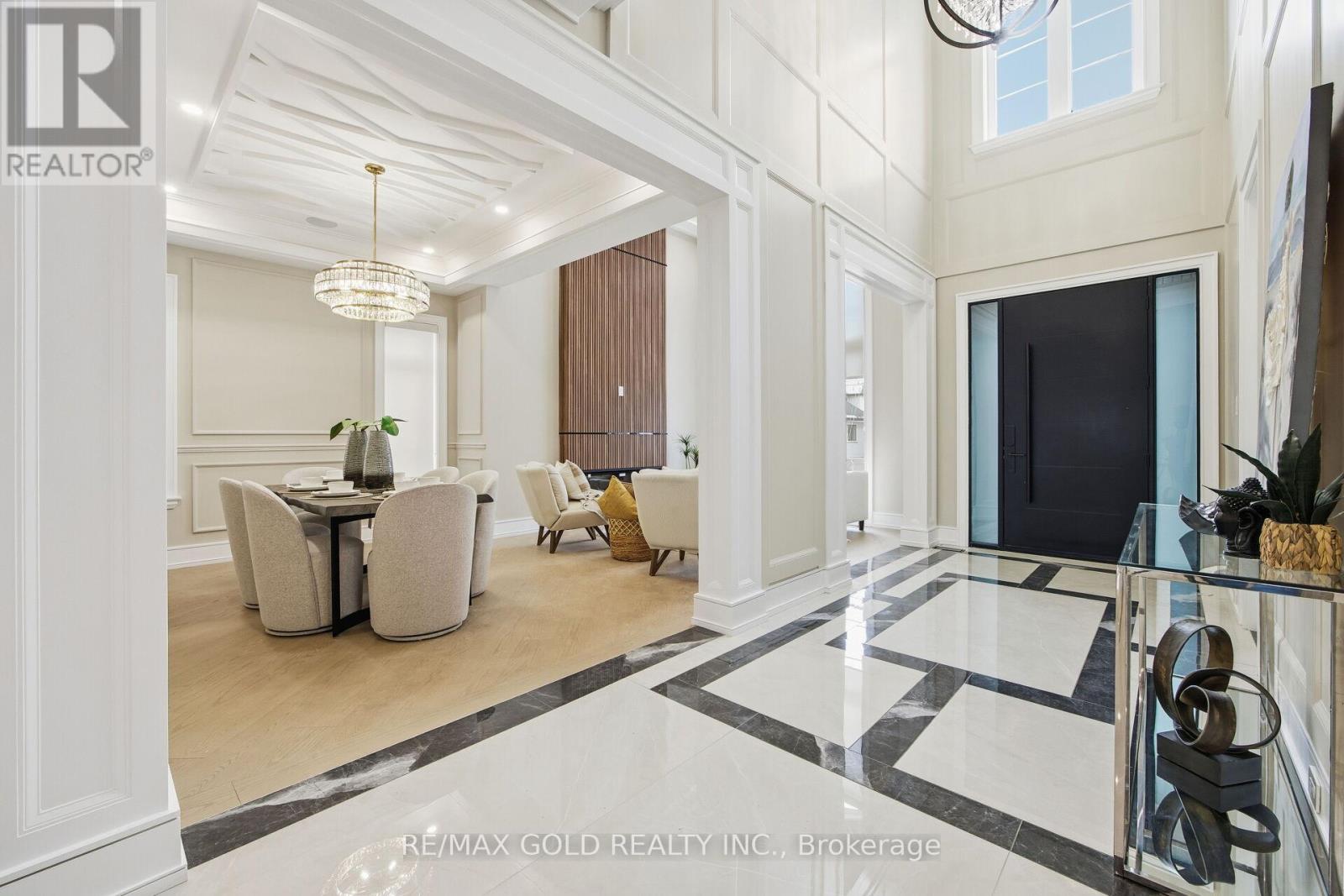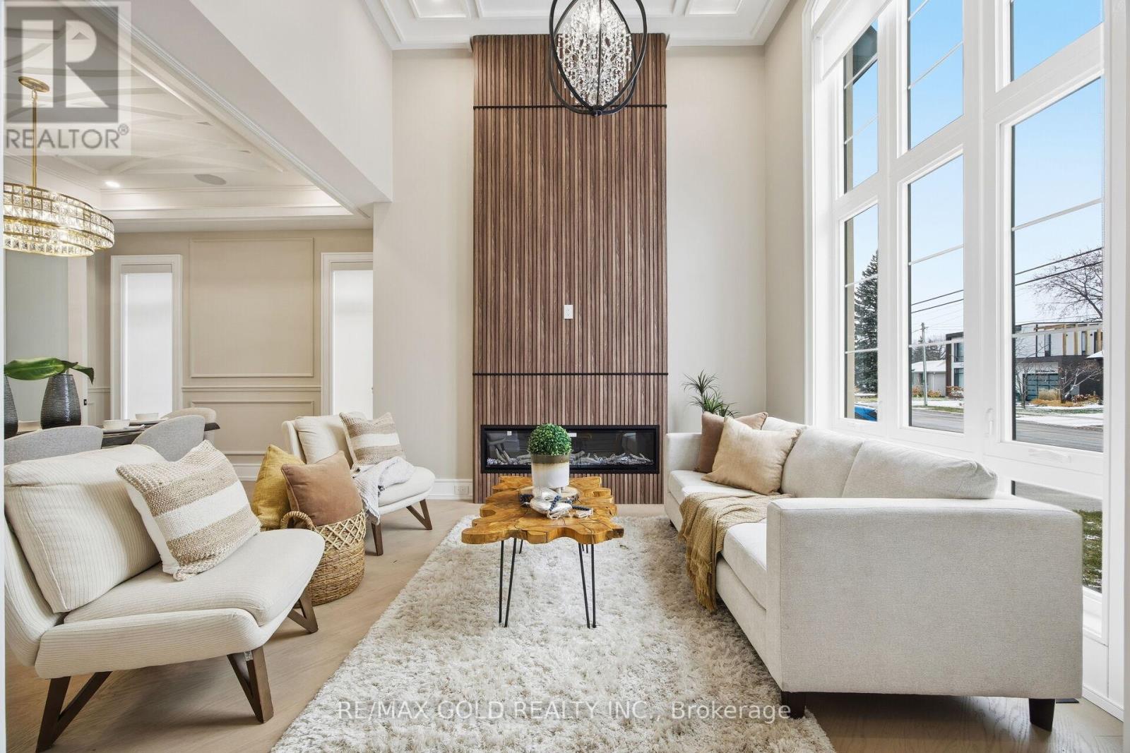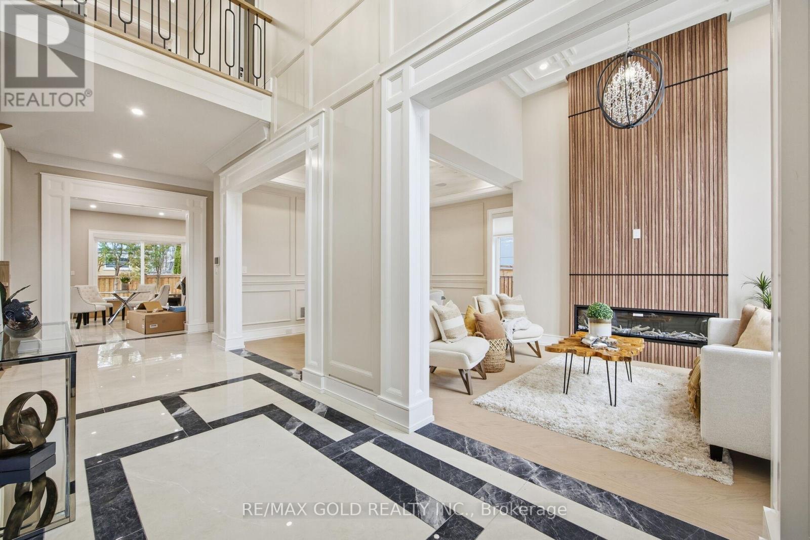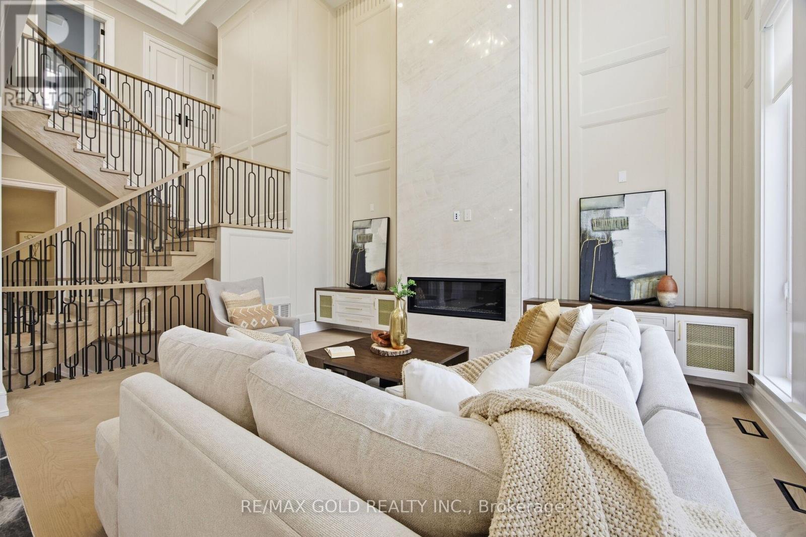 Welcome to an exceptional custom-built luxury residence, where inspired architecture, thoughtful design, and superior craftsmanship come together to create a home that is both elegant and functional. The grand foyer sets the tone, offering an impressive welcome into this truly distinguished home. Light & architectural impact, the interior features a dramatic skylight that fills the home with natural light. The show-stopping 20' family room is highlighted by a stunning floor-to-ceiling porcelain fireplace, sophisticated yet inviting atmosphere. The formal living room features 14' ceilings and expansive front-facing windows. The open-concept main level is enhanced by 10' ceilings, modern pot lighting, and floor-to-ceiling windows, allowing sunlight to pour into every corner. Elegant wainscoting and custom wall panelling throughout the foyer, living room, family room, and staircase showcase the exceptional detail and craftsmanship found throughout the home. At the heart is a chef-inspired kitchen, designed for both everyday living. It features panel-ready Miele appliances, including refrigerators & other appliances, offering a seamless, built-in aesthetic. This well-planned kitchen provides an outstanding layout, premium finishes, and a functional flow that opens to the backyard through sliding doors. Step outside to a covered rear patio, accessed from the kitchen, creating the perfect space for outdoor enjoyment. The fenced backyard ensures privacy, while the beautifully designed interlocked driveway and wrap-around hardscaping enhance curb appeal and durability. Car enthusiasts and active families will appreciate the extra-wide garage, designed to comfortably accommodate larger vehicles. A secondary rear garage door allows convenient access to the backyard-ideal for motorcycles or pets. The fully finished basement continues the luxurious living experience, with large window wells for enhanced natural light, a stylish wet bar & full bath. Extra-wide garage Doors. (id:64974)