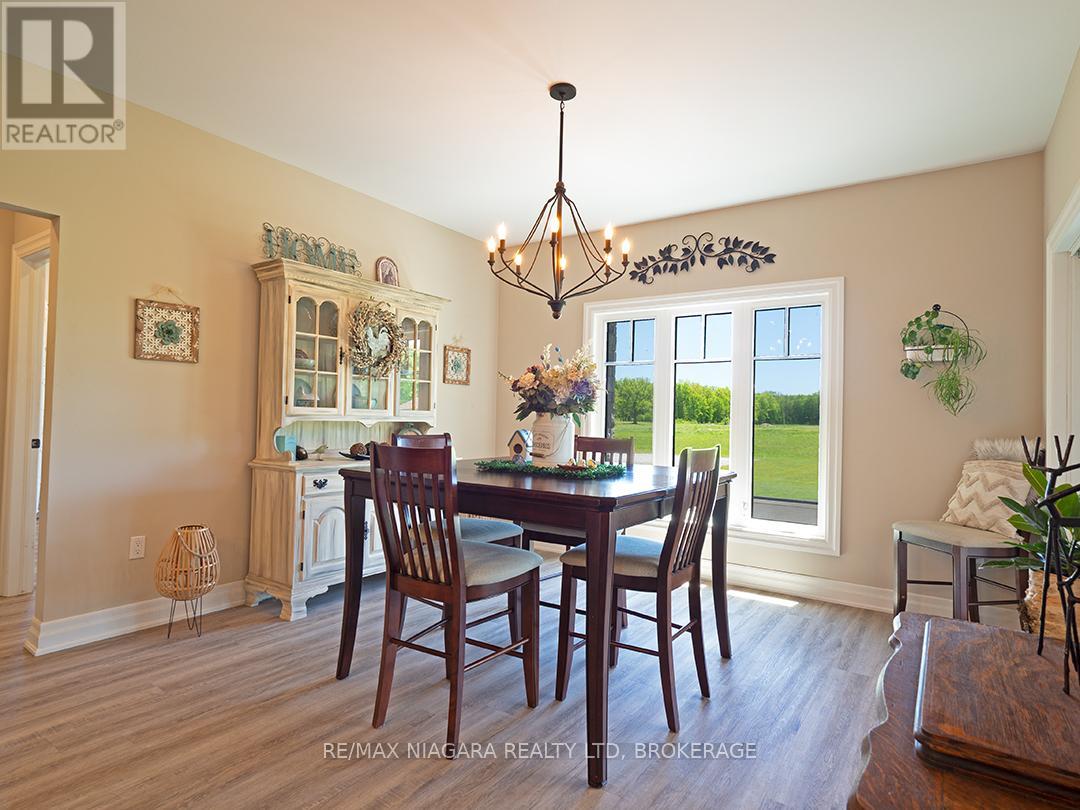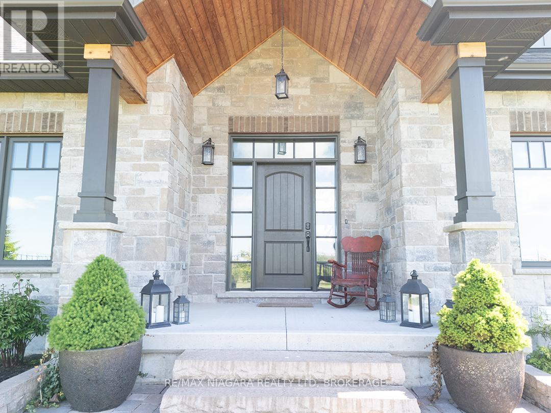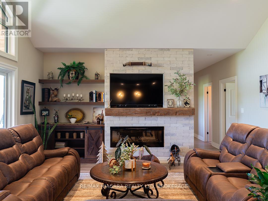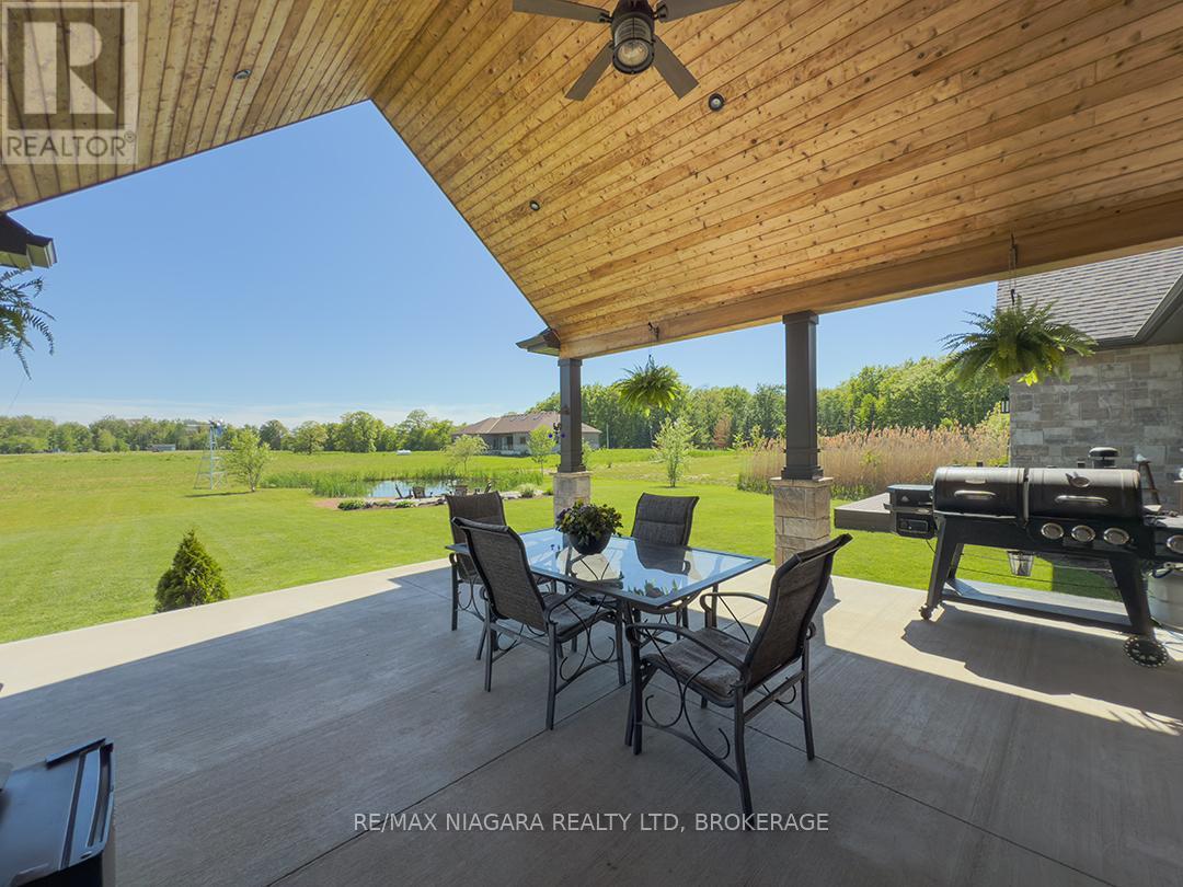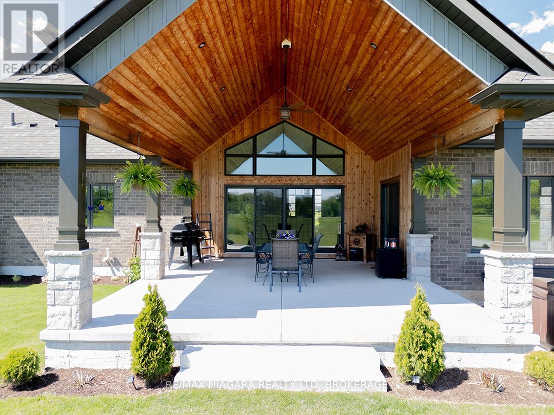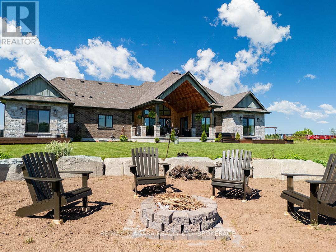 Carefully designed, custom-built bungalow offering nearly 3,000 sqft of main floor living with 4 bedrooms, 3 bathrooms, and a full, unfinished basement on beautifully landscaped 2.11 Acre lot. A 32' x 40' detached garage/workshop that's fully outfitted with an auto hoist, compressor and airlines, overhead heater, concrete floor, and 200 Amp service is an added bonus! The home's layout was purposefully planned with two distinct living areas-an east wing & a west wing. The east wing features the primary suite, complete with a large walk-in closet, luxurious five-piece ensuite, and direct access to the backyard deck and hot tub. The west wing functions as a fully self-contained in-law suite with its own separate front entrance, spacious living room with kitchenette, bedroom with sliding doors to the backyard, laundry closet, and a three-piece bathroom with a zero-entry walk-in shower. At the heart of the home is an expansive open concept kitchen, dining, and living area that ties everything together. The Oakridge Premium kitchen is outfitted with granite counters and opens onto a bright dining room with sweeping backyard views. The living room is anchored by a stone fireplace and features vaulted ceilings with dramatic two-storey, floor-to-ceiling windows that lead out to a stunning covered pavilion designed to match the interior vaulted ceiling profile. An attached double garage leads into a large, bright laundry and mudroom with plenty of storage. Accessibility was top of mind in the home's design, with wide 36" doorways and 48" hallways throughout. Energy efficiency is another standout feature, with triple-pane windows, double-pane sliding doors, and on-demand hot water. The outdoor space is just as impressive, with extra parking, a landscaped sandy firepit area overlooking a serene pond with windmill aeration, and the kind of quiet country setting that's hard to find yet close to everything - offering central access to all points in Niagara, Haldimand, and Hamilt (id:64974)