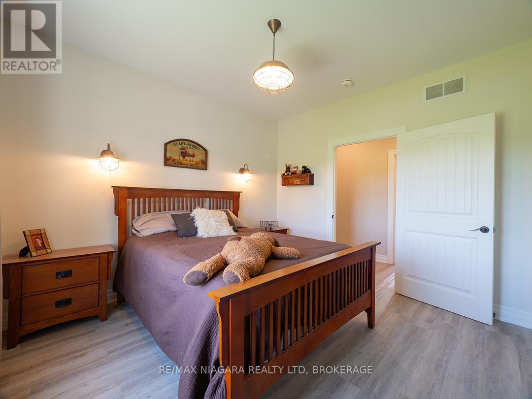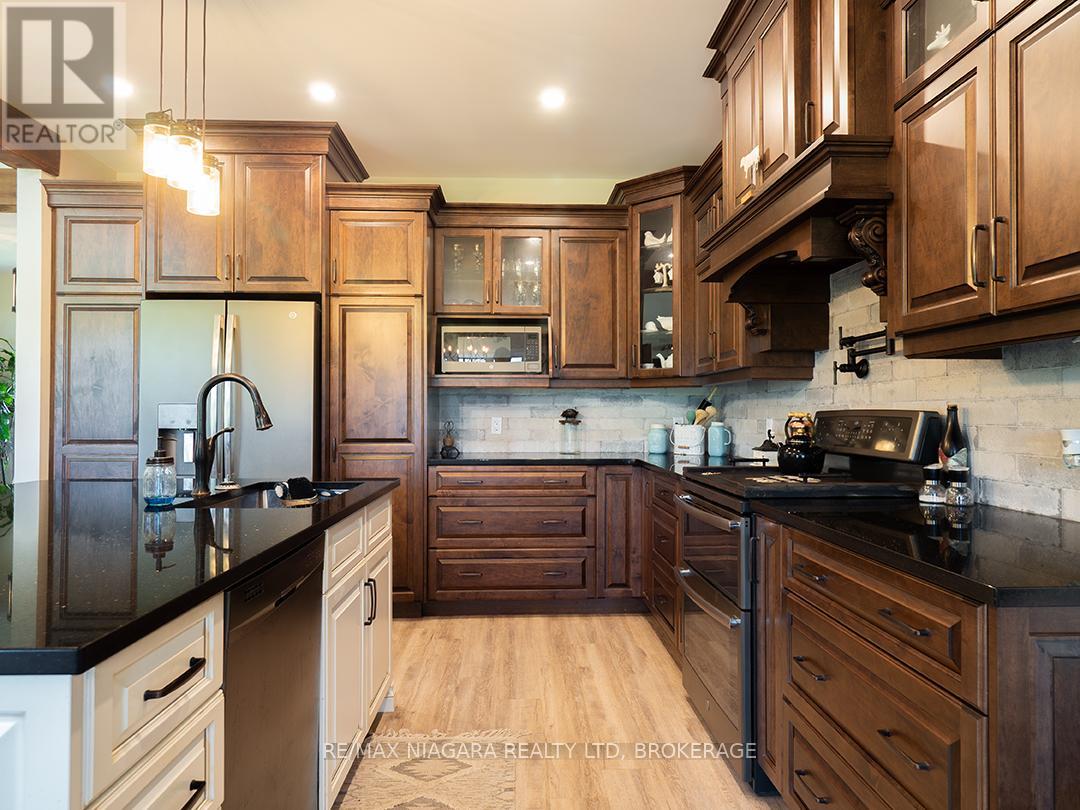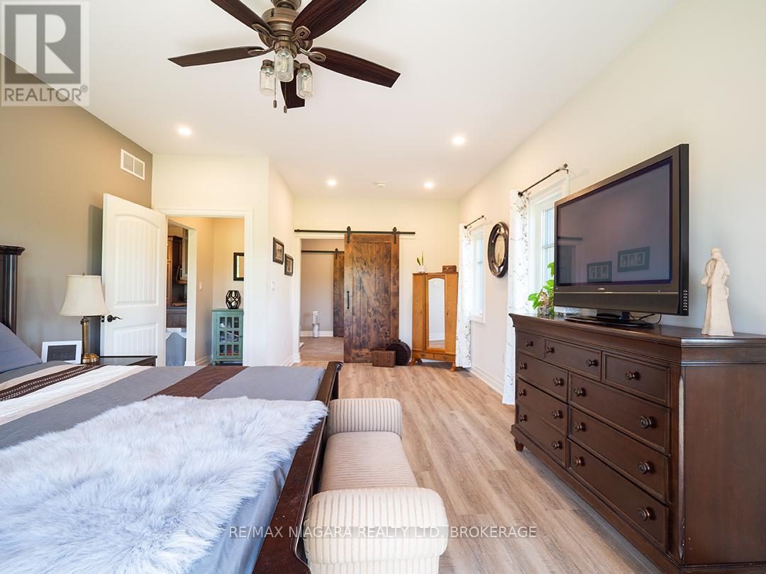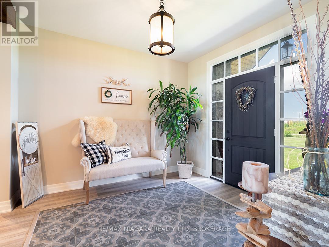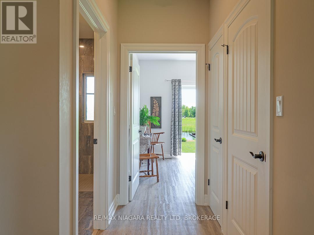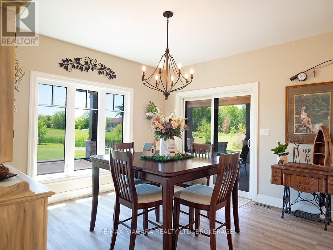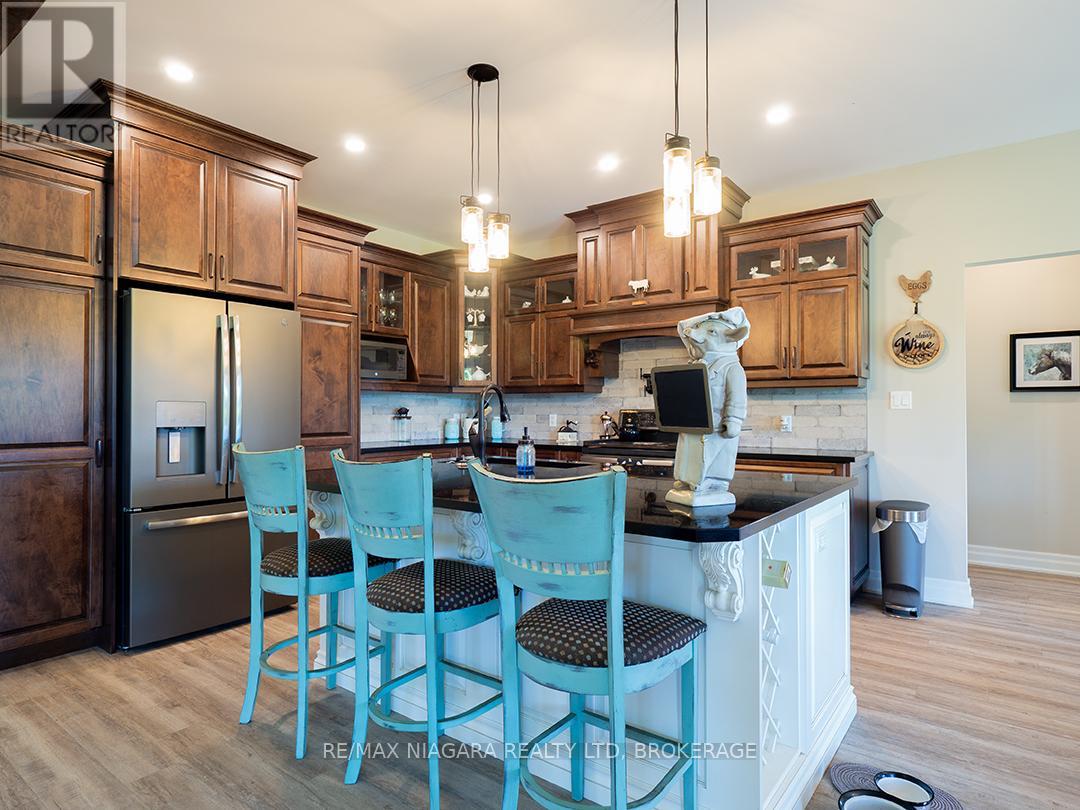 Carefully designed, custom-built bungalow offering nearly 3,000 sqft of main floor living with 4 bedrooms, 3 bathrooms, and a full, unfinished basement on beautifully landscaped 2.11 Acre lot. A 32' x 40' detached garage/workshop that's fully outfitted with an auto hoist, compressor and airlines, overhead heater, concrete floor, and 200 Amp service is an added bonus! The home's layout was purposefully planned with two distinct living areas-an east wing & a west wing. The east wing features the primary suite, complete with a large walk-in closet, luxurious five-piece ensuite, and direct access to the backyard deck and hot tub. The west wing functions as a fully self-contained in-law suite with its own separate front entrance, spacious living room with kitchenette, bedroom with sliding doors to the backyard, laundry closet, and a three-piece bathroom with a zero-entry walk-in shower. At the heart of the home is an expansive open concept kitchen, dining, and living area that ties everything together. The Oakridge Premium kitchen is outfitted with granite counters and opens onto a bright dining room with sweeping backyard views. The living room is anchored by a stone fireplace and features vaulted ceilings with dramatic two-storey, floor-to-ceiling windows that lead out to a stunning covered pavilion designed to match the interior vaulted ceiling profile. An attached double garage leads into a large, bright laundry and mudroom with plenty of storage. Accessibility was top of mind in the home's design, with wide 36" doorways and 48" hallways throughout. Energy efficiency is another standout feature, with triple-pane windows, double-pane sliding doors, and on-demand hot water. The outdoor space is just as impressive, with extra parking, a landscaped sandy firepit area overlooking a serene pond with windmill aeration, and the kind of quiet country setting that's hard to find yet close to everything - offering central access to all points in Niagara, Haldimand, and Hamilt (id:64974)