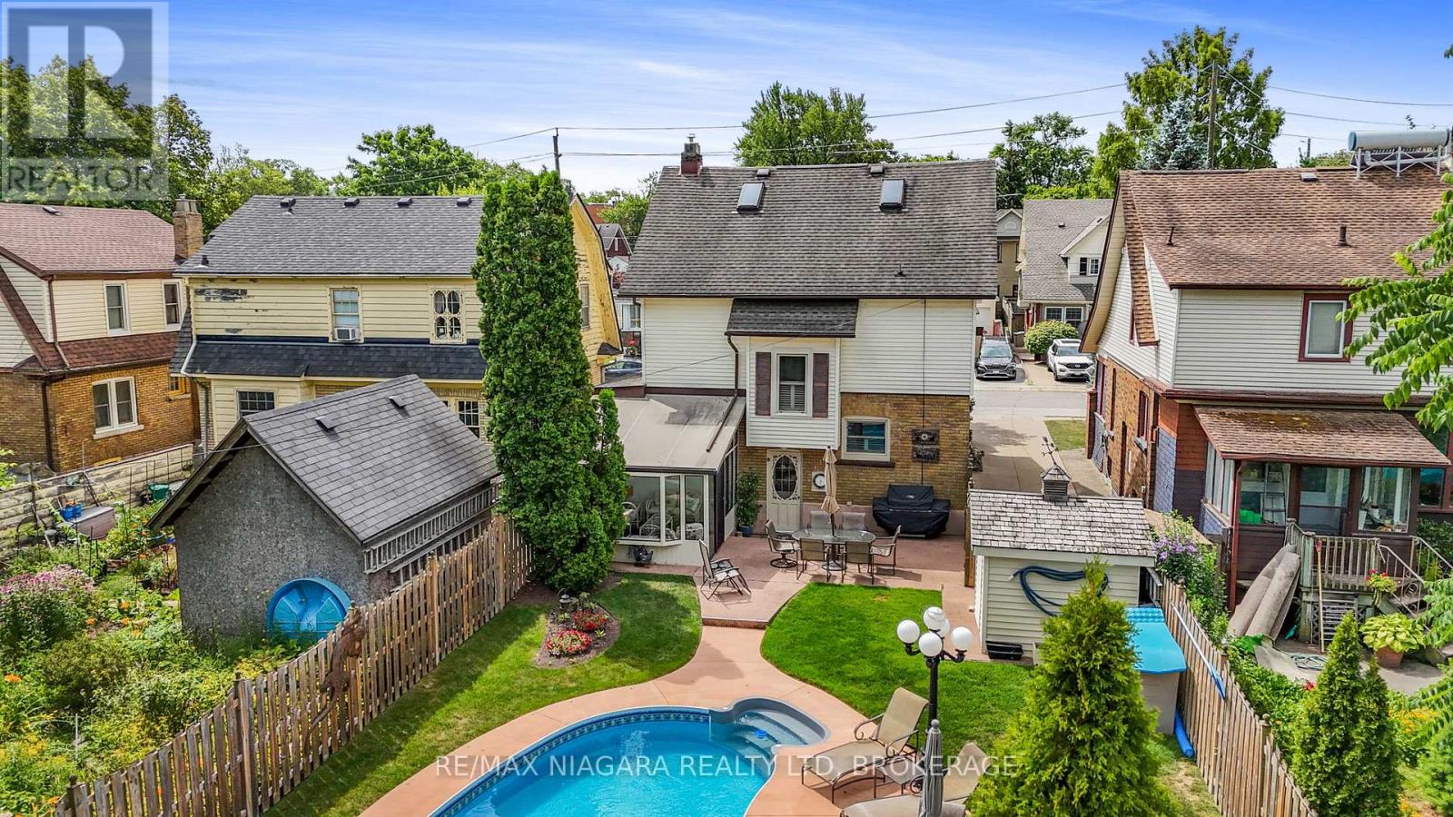 Welcome to a truly special home where timeless character and thoughtful upgrades meets exceptional outdoor living. Set on a beautifully landscaped lot,this property offers a private backyard oasis complete with a kidney-shaped inground pool, sunroom, extensive concrete work, and lush gardens-perfect for relaxing or entertaining all summer long. The impressive curb appeal is enhanced by Trillium Award-winning gardens. Inside, the main floor features a warm and inviting formal living room with hardwood floors, gas fireplace, and coffered ceilings, with patio doors leading to a charming front porch ideal for morning coffee or evening cocktails. The spacious eat-in kitchen offers an abundance of quality cabinetry, built-in appliances, island, and opens to a cozy family room designed for everyday living and entertaining. Upstairs, the second floor includes a massive primary bedroom, a 4-piece bath with jacuzzi tub and separate shower, an open den/office (easily converted back to a bedroom), and an additional walk-in closet. The finished third floor provides excellent bonus space for a guest suite, playroom, gaming area, or extra bedroom, along with additional storage. The finished basement features a rec/games room, 3-piece bath, laundry area, and workshop. Additional updates and features include furnace (2023), central air (2022), and a concrete driveway. Pool season will be here before you know it, don't miss out on a truly rare opportunity. (id:64974)