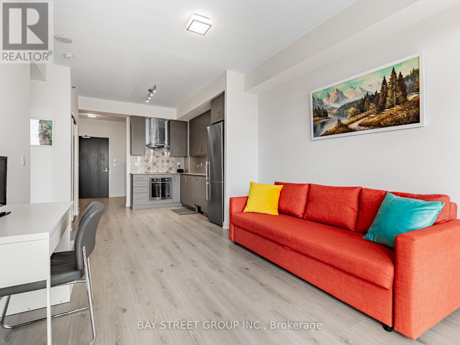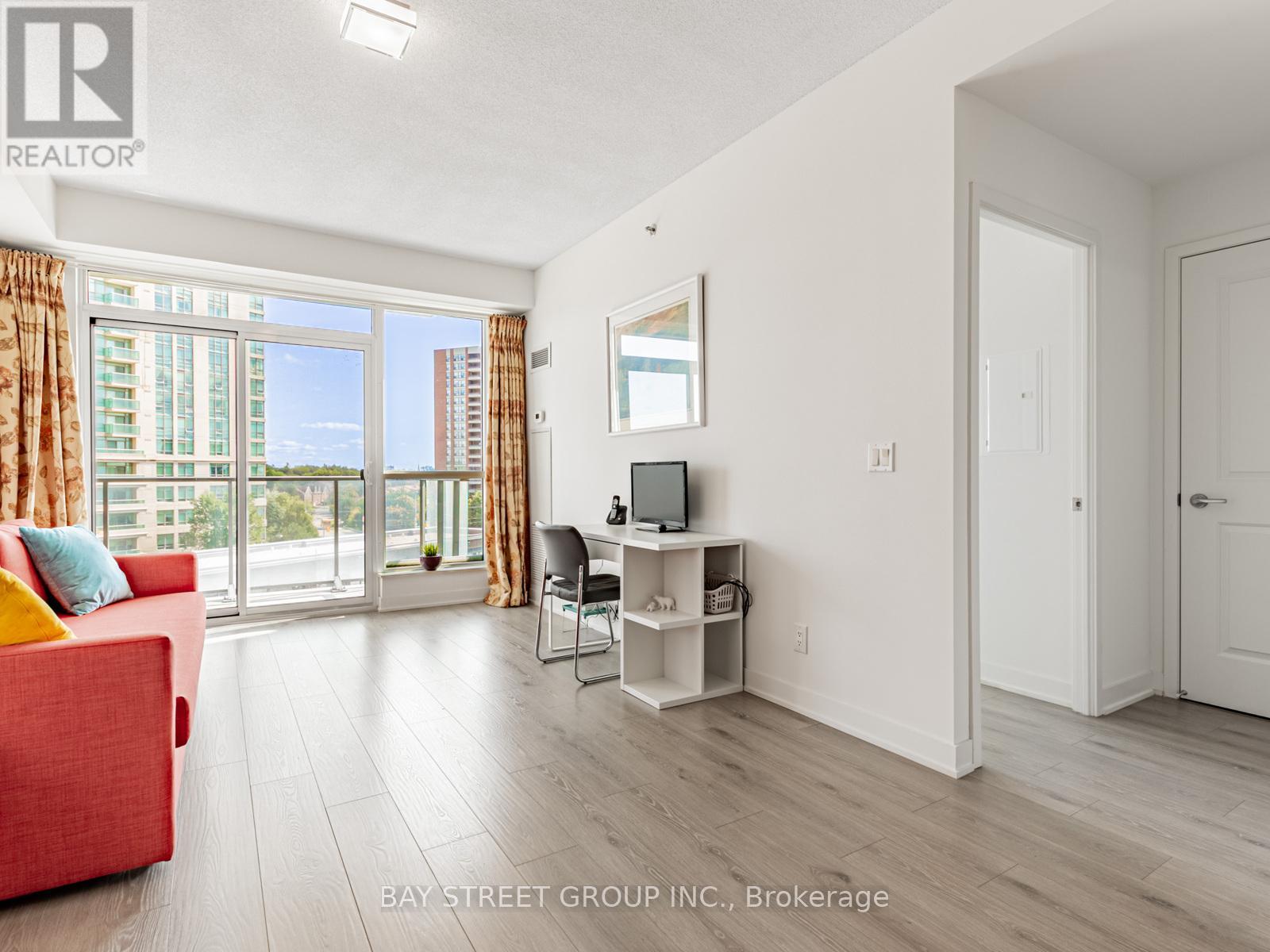 Large and Bright 1+den unit with large balcony. Open concept design w/ 9ft ceilings and Large Window. Laminate flooring throughout, kitchen with quartz counters and S/S Appliances. Close to 401, TTC, GO Station, Library and Shopping Mall. 24 hour concierge, gym and indoor pool. Parking space can be leased directly with the management office. (id:64974)