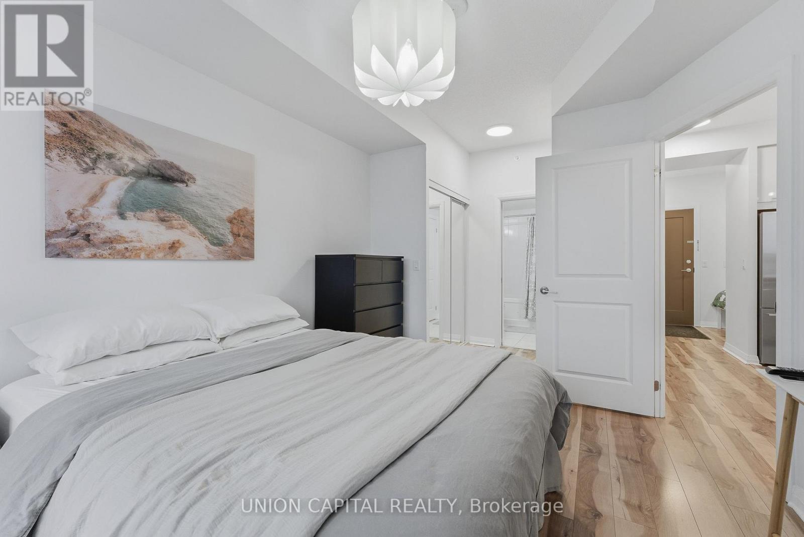 An INCREDIBLE DEAL for a first time homebuyer or an investor! Welcome to one of the BEST PRICED condo currently available in Mississauga! This bright and sunny south-facing 1 bedroom + den offers approximately 650 SQFT plus an OVERSIZED 125 SQFT TERRACE (WOW!) - a RARE OUTDOOR LIVING SPACE with no direct neighbours, making it quiet and private. This is the perfect spot to hang out as summer is approaching! Enjoy your morning coffee, alfresco dining, or relaxing evenings with a glass of wine with friends on your PRIVATE TERRACE. The thoughtfully designed layout features 9FT ceilings, new laminate flooring, upgraded light fixtures, and floor-to-ceiling windows that bathes the unit with natural light all day long. The UPGRADED KITCHEN features the highly desirable U-shaped layout rarely found in newer condo designs, complete with ample upgraded white gloss cabinetry, quartz countertops, modern grey subway tile backsplash, and full-size S/S appliances (High End Fisher & Paykel Fridge!) - super functional for everyday living and entertaining. The HUGE MASTER BEDROOM offers much-needed closet space with HIS/HER CLOSETS and convenient SEMI ENSUITE access to the 4PC bathroom, creating a comfortable private retreat. The SPACIOUS DEN offers flexible use as a home office, nursery, or a 2nd bedroom. An incredible opportunity for first-time buyers, professionals, or investors to own in a highly desirable Mississauga community just minutes to Square One shopping mall, all highways, GO transit, groceries, Celebration Square, Kariya Park, Community Centre and the new LRT. Enjoy TOP TIER CONDO AMENITIES (fully equipped gym, yoga studio, indoor pool with hot tub, dry saunas, theatre room, library with work-from-home stations, party room, outdoor BBQ area, sports lounge, library, party room, guest suites & more) (id:64974)