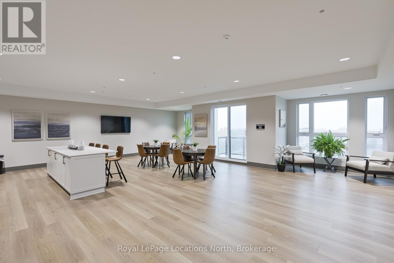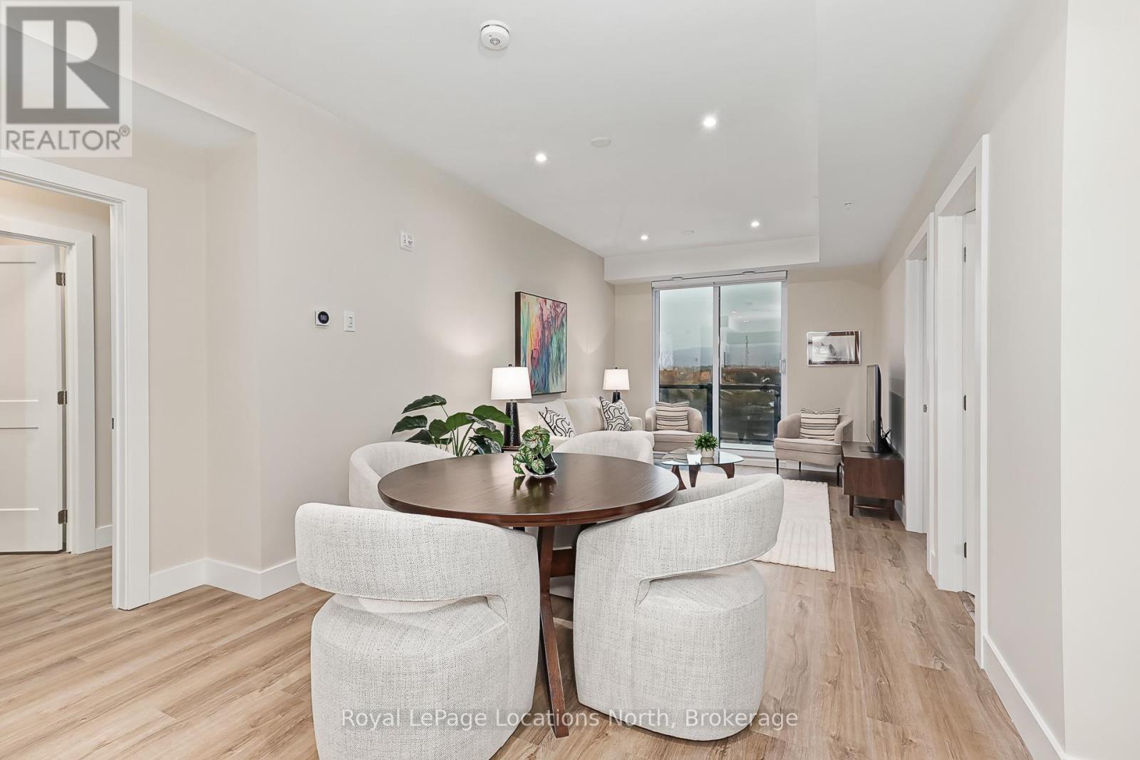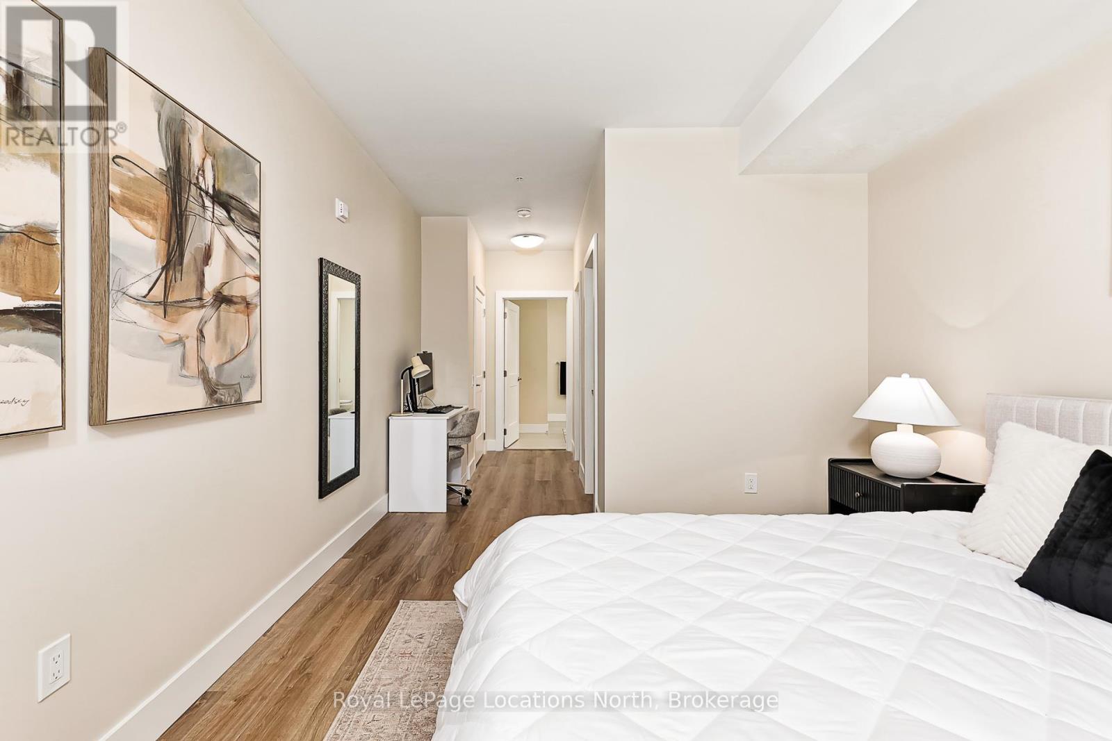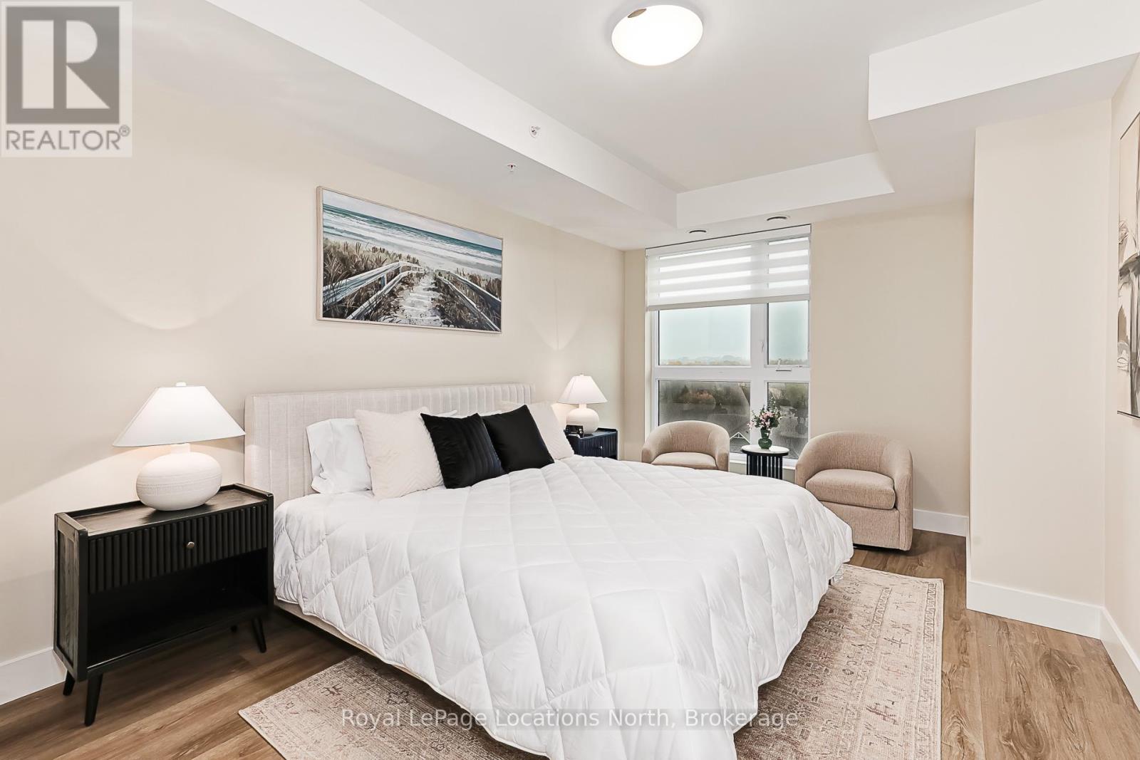 Welcome to Royal Windsor, one of Collingwood's most sought-after condo communities - where modern luxury meets active, carefree living. This spacious 2-bedroom + den suite offers breathtaking west-facing views of Blue Mountain and a thoughtfully designed, open-concept layout perfect for both relaxing and entertaining. The bright, contemporary kitchen features stainless steel appliances, quartz countertops, soft-close cabinetry and elegant pot lighting. The inviting living room opens to a large private patio - ideal for taking in sunset mountain views. The primary suite is a true retreat, featuring two walk-in closets and a 5-piece wheelchair-accessible ensuite, offering both comfort and sophistication. Remote blinds, luxury vinyl plank flooring and a neutral palette add to the refined atmosphere. An assigned underground parking space is included with this state-of-the-art condo, designed with convenience and lifestyle in mind. At Royal Windsor, residents enjoy a community built on wellness and connection. Amenities include a rooftop terrace with panoramic views of Blue Mountain, a party room and access to Balmoral Village's clubhouse, complete with a pool, fitness studio, games room and more. Experience maintenance-free living in an exceptional location close to downtown Collingwood, golf, trails, Georgian Bay and Blue Mountain. This is more than a condo - it's a lifestyle. (id:64974)