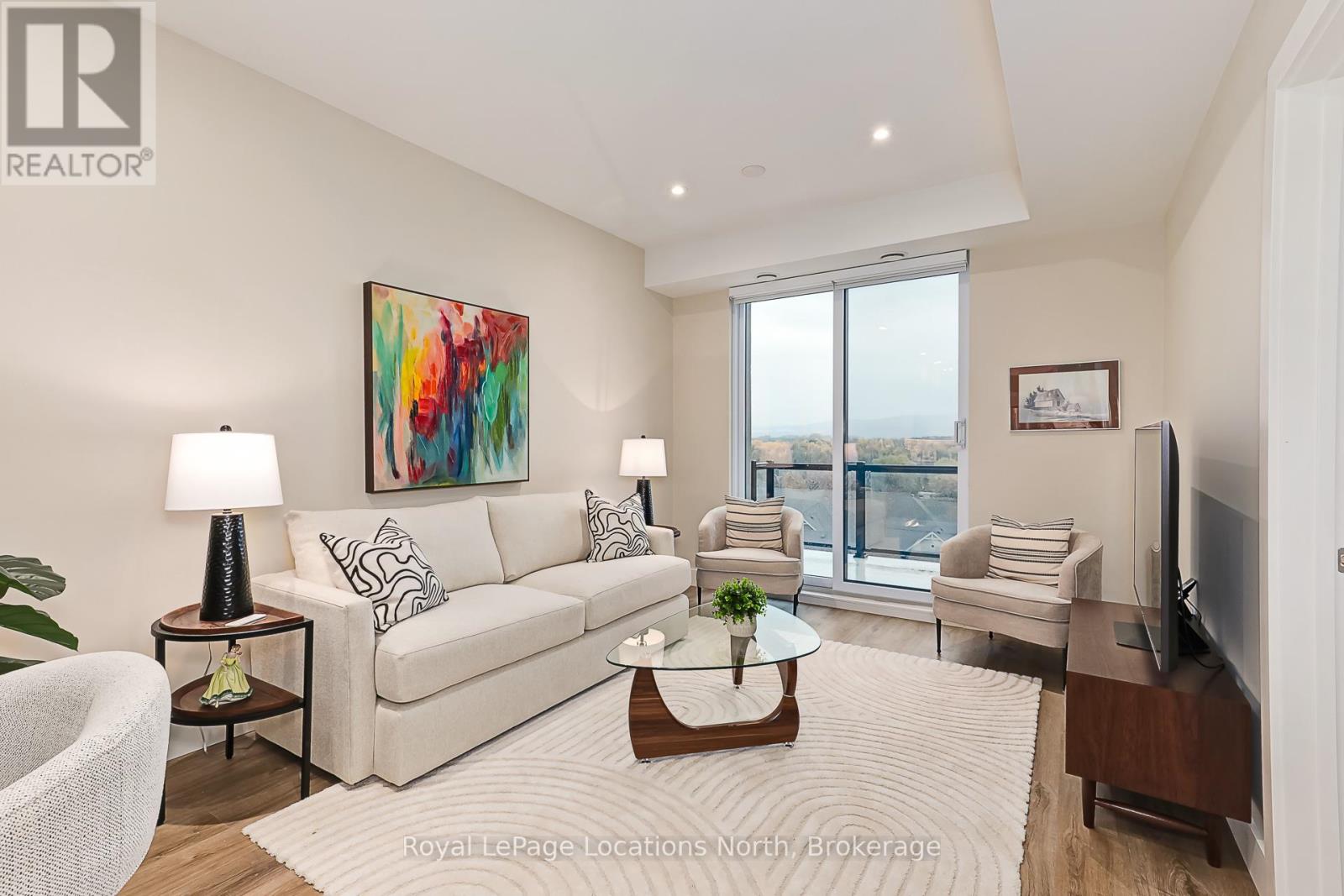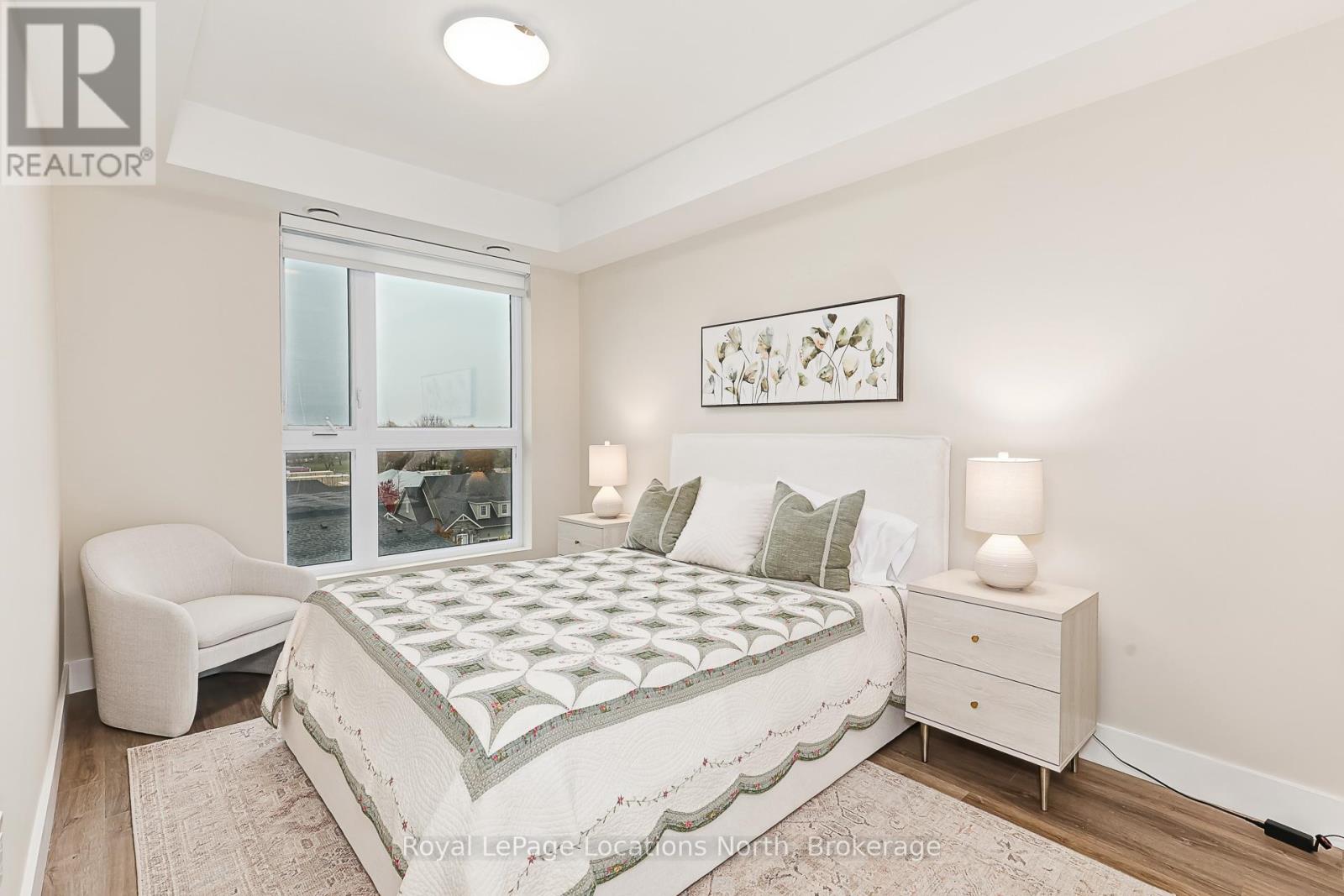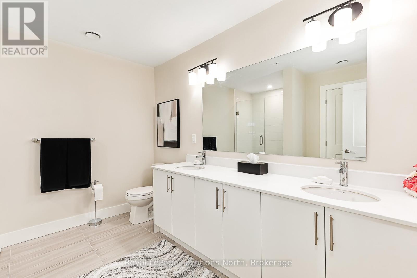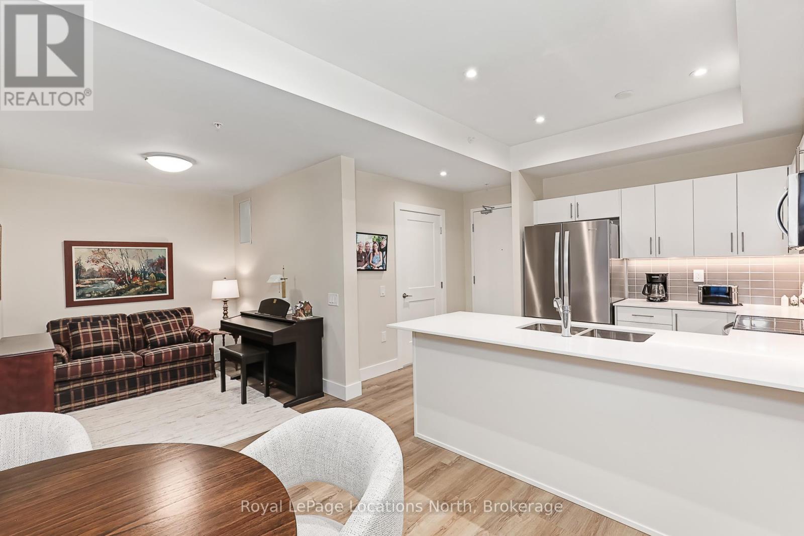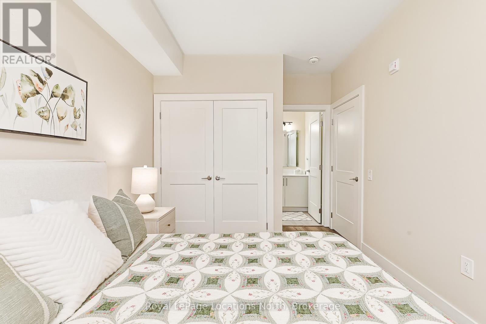 Welcome to Royal Windsor, one of Collingwood's most sought-after condo communities - where modern luxury meets active, carefree living. This spacious 2-bedroom + den suite offers breathtaking west-facing views of Blue Mountain and a thoughtfully designed, open-concept layout perfect for both relaxing and entertaining. The bright, contemporary kitchen features stainless steel appliances, quartz countertops, soft-close cabinetry and elegant pot lighting. The inviting living room opens to a large private patio - ideal for taking in sunset mountain views. The primary suite is a true retreat, featuring two walk-in closets and a 5-piece wheelchair-accessible ensuite, offering both comfort and sophistication. Remote blinds, luxury vinyl plank flooring and a neutral palette add to the refined atmosphere. An assigned underground parking space is included with this state-of-the-art condo, designed with convenience and lifestyle in mind. At Royal Windsor, residents enjoy a community built on wellness and connection. Amenities include a rooftop terrace with panoramic views of Blue Mountain, a party room and access to Balmoral Village's clubhouse, complete with a pool, fitness studio, games room and more. Experience maintenance-free living in an exceptional location close to downtown Collingwood, golf, trails, Georgian Bay and Blue Mountain. This is more than a condo - it's a lifestyle. (id:64974)