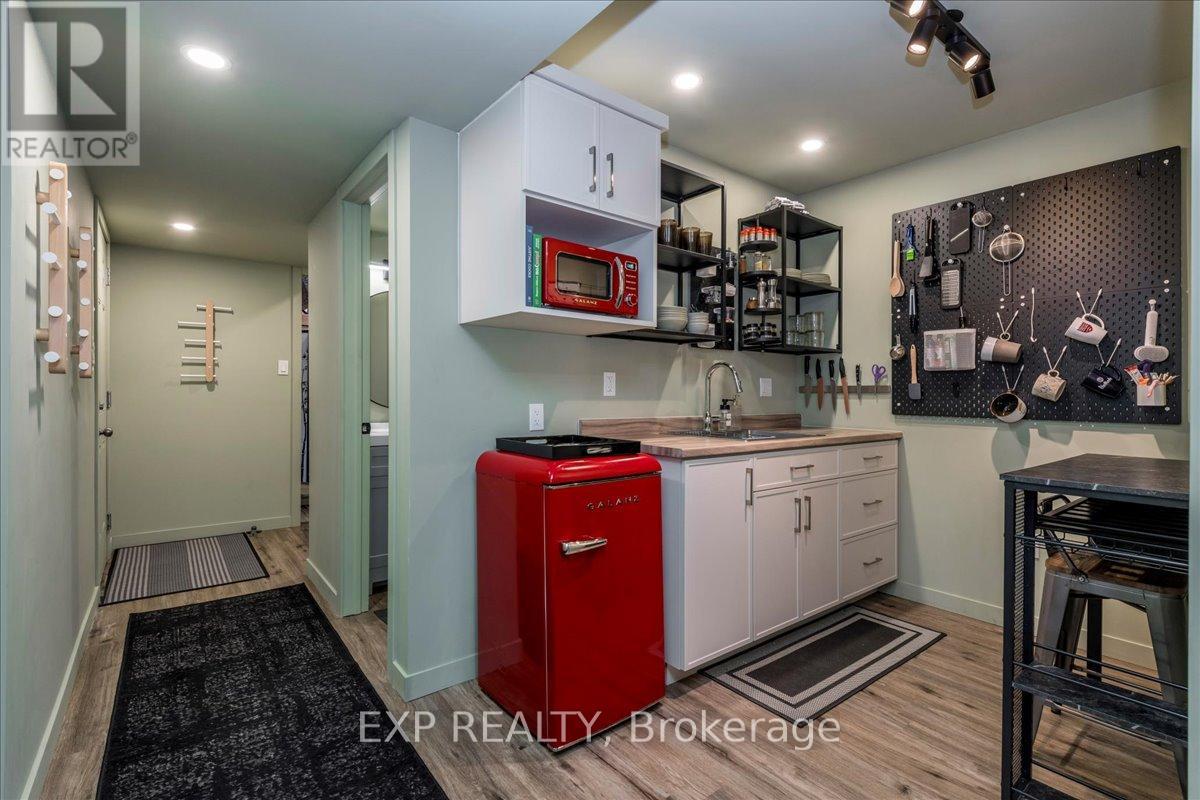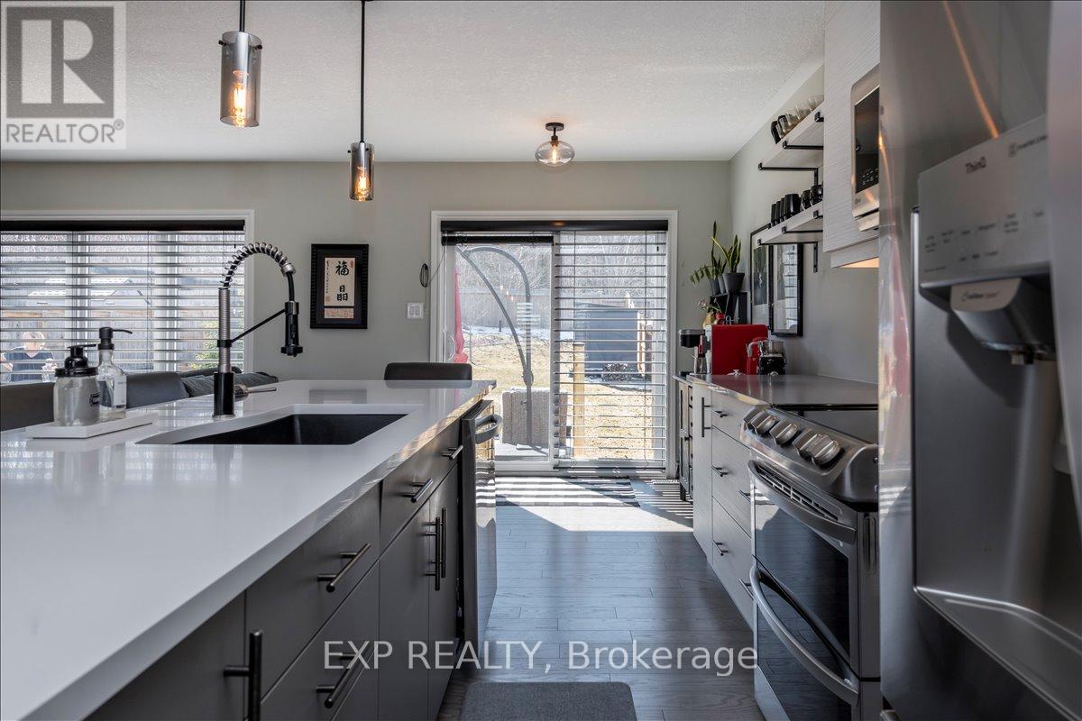Modern comfort meets small-town charm in this beautifully finished 3+1 bedroom, 3 bathroom home, built in 2020 and thoughtfully designed for both everyday living and entertaining. Set on a quiet, family-friendly court, this property offers a rare combination of style, functionality, and flexibility. The bright open-concept main floor features a sun-filled living space with a large picture window and upgraded lighting, flowing seamlessly into a stunning kitchen complete with ceiling-height cabinetry, quartz countertops, stainless steel appliances including a double oven, and a statement island with seating for four. A walkout to the backyard makes hosting effortless, while the adjoining dining area offers the perfect setting for both casual meals and special gatherings. The main floor primary suite provides a peaceful retreat with a walk-in closet and a private 3-piece ensuite, while two additional bedrooms share a well-appointed 4-piece bath. Convenient main floor laundry adds to the home's thoughtful layout. The lower level offers incredible versatility with a kitchenette, bright living space with electric fireplace, fourth bedroom, and full bathroom - ideal for an in-law suite, multi-generational living, or a private guest retreat. Outside, enjoy a fully fenced backyard with a deck and pergola, perfect for relaxing or entertaining, plus a handy storage shed. With a double car garage, parking for six, and just a short walk to Georgian Bay, this home delivers the lifestyle you've been waiting for - peaceful, connected, and move-in ready. (id:64974)