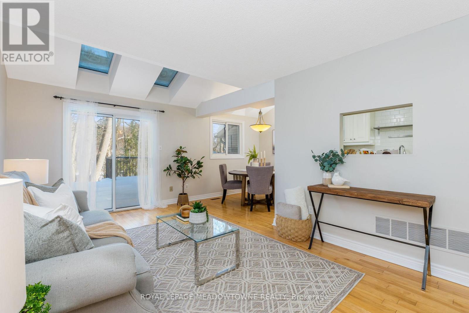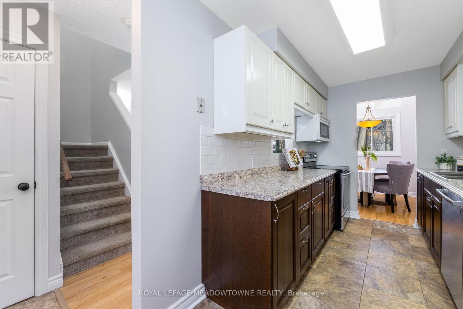 Ravine! Enjoy uninterrupted views of the Credit River. Move-in Ready 3 bedroom, 2 bathroom townhouse is all you really need. Do not underestimate the importance of a ground level entrance - important for those with kids and groceries or those with mobilty issues. And before stepping inside, take a moment to appreciate the stone porch and the curb appeal of the etched glass insert in the front door casting light into foyer. The living room with hardwood floors opens to a large deck guaranteed to provide an accessible happy place for meals and gatherings. The updated kitchen with a pass-thru, glass cupboards, white tile backsplash and stainless steel appliances leads to the dining area which is illuminated by skylights. Upstairs there are three freshly painted bedrooms and a semi-ensuite 4-piece bathroom adjacent to the large primary bedroom with wall-to-wall closets. The finished rec room provides additional space to relax and play. (id:64974)