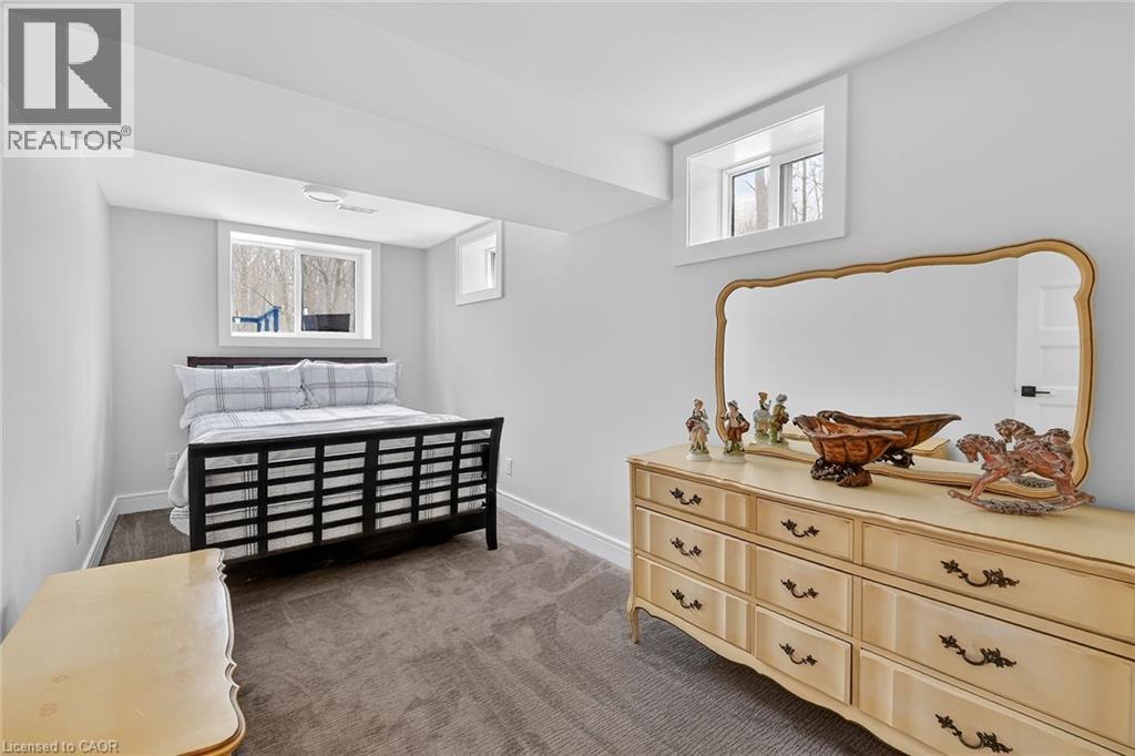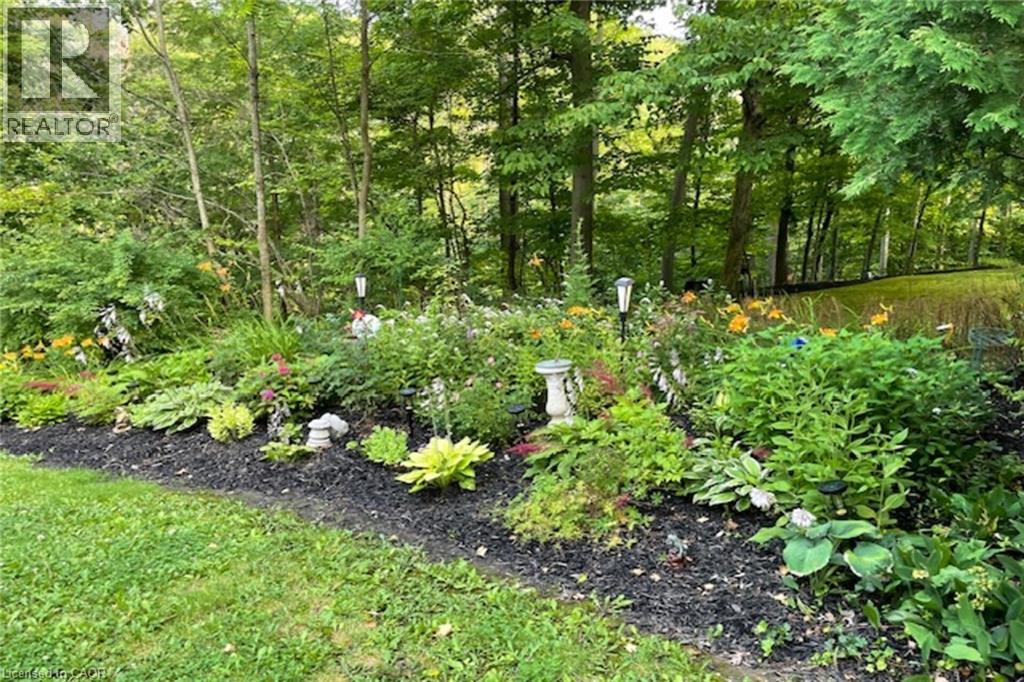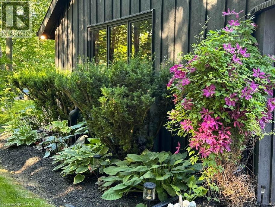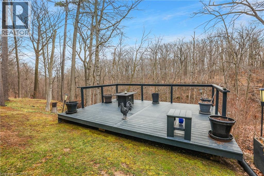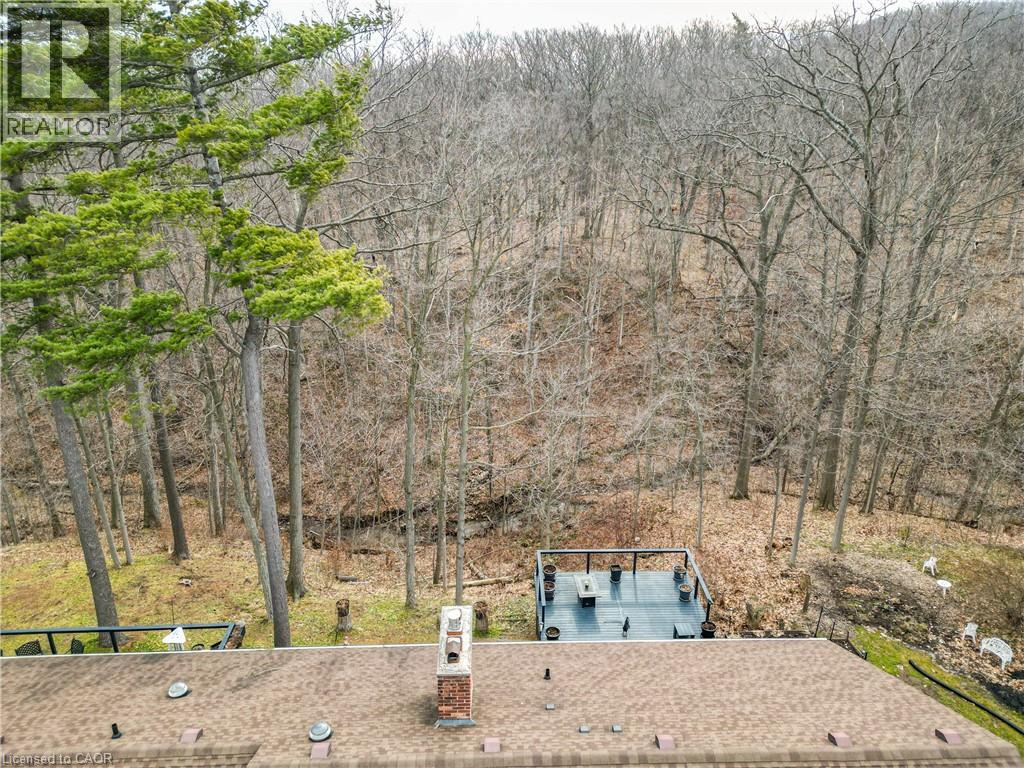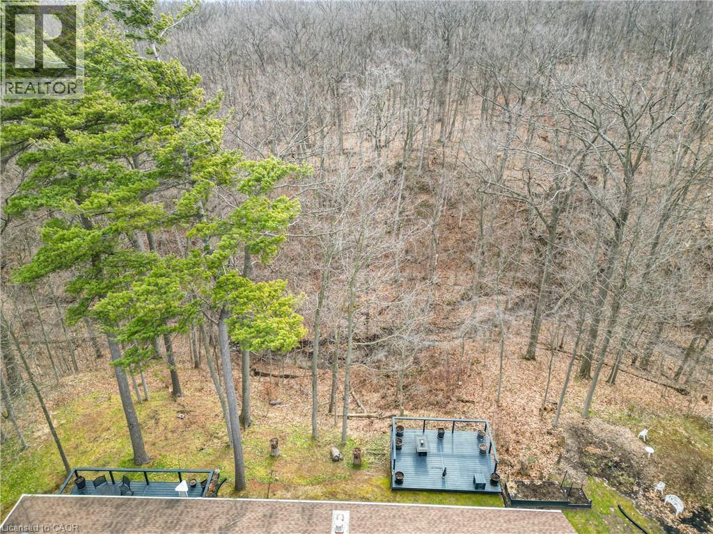 Luxury custom-built bungalow set on over 2 acres of private property, backing directly onto breathtaking woodland, a serene stream, and vibrant wildlife that brings the landscape to life. This fully renovated ranch-style home showcases high-end finishes and refined living in a truly picturesque setting near the Niagara Escarpment. A grand front foyer welcomes you with stunning views and an immediate sense of tranquility. The expansive, chef-inspired kitchen is a true showpiece, featuring heated floors, a large island, granite countertops, a premium Fulgor Milano 6-burner gas stove with double oven, and a walk-in pantry with built-in second oven. Custom cabinetry and millwork throughout highlight exceptional quality of the renovations. Gather around the gas fireplace or host in style at the elegant wet bar, complete with a black walnut countertop and bar fridge. Step out onto the upper deck to barbecue alongside your herb garden or simply unwind while taking in the surrounding natural beauty. The sunken living room showcases floor-to-ceiling windows overlooking the Escarpment and a second gas fireplace. Main-floor primary suite offers a luxurious 5-piece ensuite with heated floors and a walk-in closet, while two additional bedrooms each feature their own private 3-piece ensuites. Convenience is key with main-floor laundry and direct garage access. Fully finished lower level includes home office, exercise room, second kitchen and laundry, bar and games room, fourth bedroom, and a 3-piece bath, along with separate entrance—ideal for guests or multi-generational living. Extensive updates include newer windows and doors, fully redesigned kitchen, five beautifully appointed bathrooms, premium flooring throughout, custom trim and millwork, eavestroughs, decks, and garage doors with openers—offering peace of mind and turnkey luxury. An exceptional opportunity to own a custom-built home that seamlessly blends high-end craftsmanship, natural beauty, and in-town convenience. (id:64974)