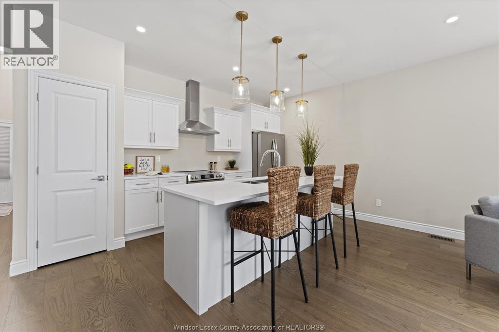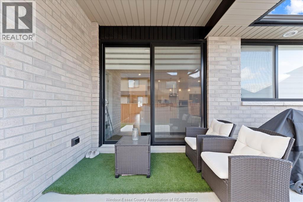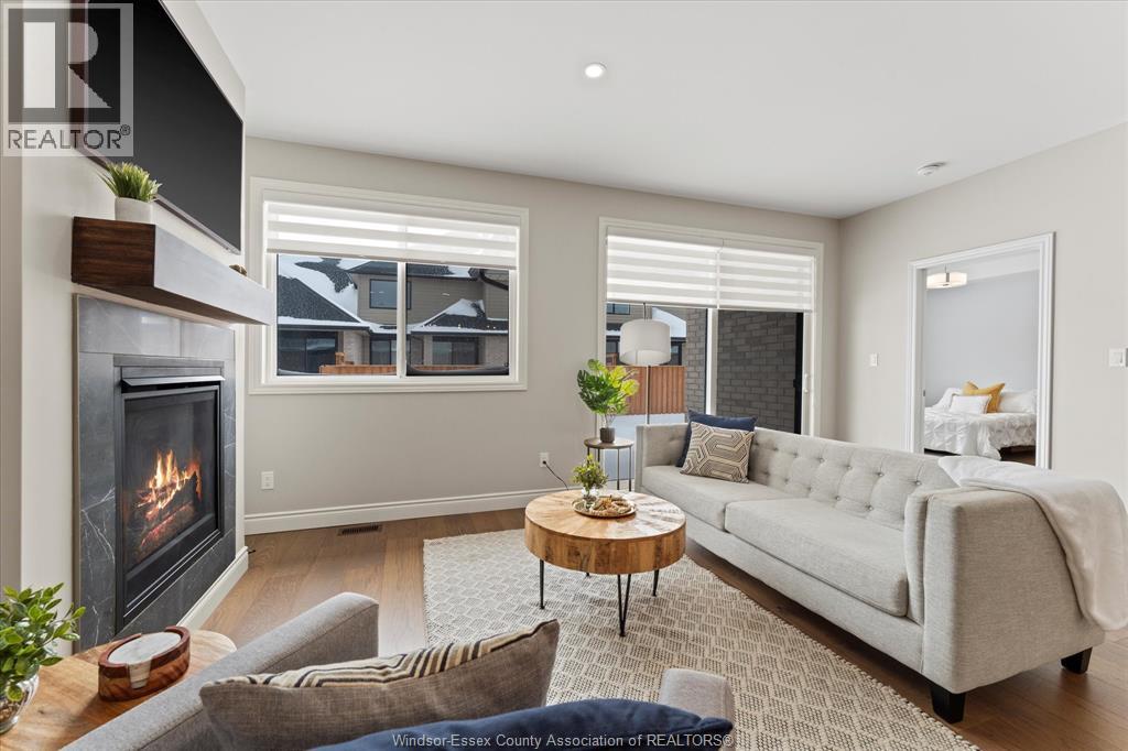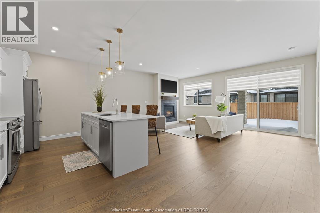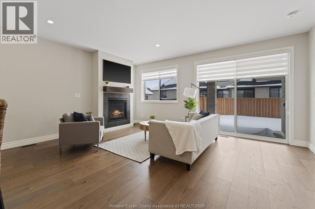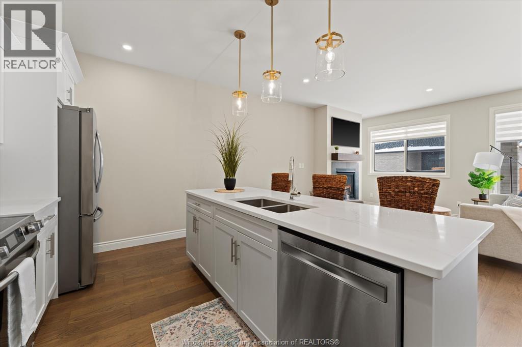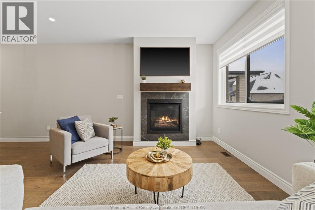 Quality built by Everjonge Homes, this townhome showcases luxury finishes and 9 ft ceilings!!! This beautifully landscaped, 3-year-new home offers 1,255 sq. ft. of thoughtfully designed living space, featuring 2 spacious bedrooms and 2 full bathrooms, including a private ensuite off the primary. Both bedrooms include walk-in closets for added convenience. Enjoy modern finishes throughout, from the bright white kitchen w/ upgraded hardware, quartz countertops and all stainless-steel appliances to the stylish fixtures, cabinetry, flooring and trim. The living room features a cozy gas fireplace w/ custom wood mantle and beautiful hardwood floors, creating a warm, inviting atmosphere. Step outside to both a covered patio and extended open patio with semi-private yard, perfect for relaxing or entertaining. The full basement offers endless potential with a rough-in bath and egress window. Just minutes to historical Amherstburg. (id:64974)