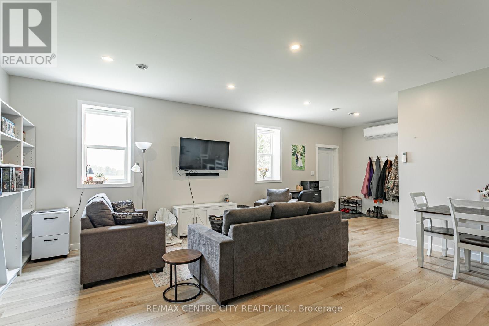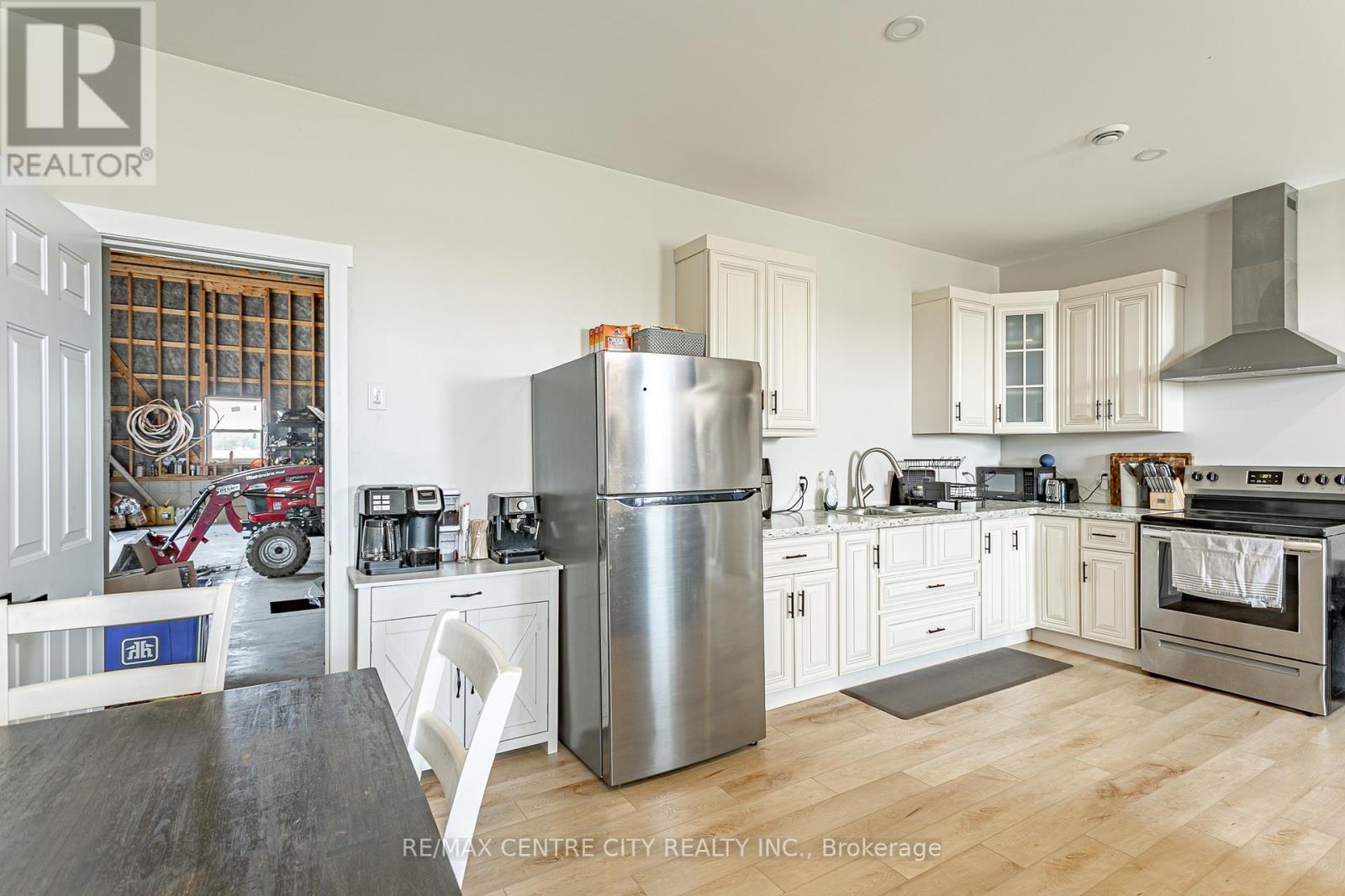 Experience elevated country living on this exceptional 10 acre retreat. Thoughtfully designed and beautifully maintained, this spacious 3+2 bedroom, 2+1 bath home offers a bright, open atmosphere filled with natural light. The primary suite provides a private retreat complete with an elegant ensuite featuring a relaxing soaker tub. Two cozy gas fireplaces add warmth and ambiance, while the convenient main floor laundry with 2 piece bath enhances everyday living. The double door heated garage and expansive concrete pad deliver both style and function, providing ample parking and year round comfort. Beyond the home, a remarkable 38' x 39' premium shop awaits featuring a large overhead door, side entrance. and in floor heat ready for hookup. At the rear, you'll find a beautifully 20' x 40' finished 2 bedroom, 1 bath in law suite with open concept design, in floor heating and radiant heating and cooling perfect for extended family, guests, extra income or private accommodations. Surrounded by peaceful countryside views and pristine open space, this stunning property blends rural charm with modern luxury. A rare opportunity to enjoy refined living, exceptional amenities, and complete tranquility on your own private 10 acre retreat. (id:64974)