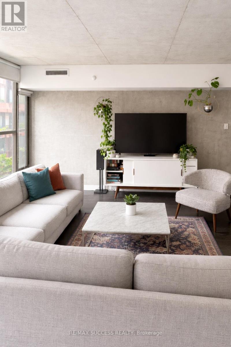 Rare opportunity to own a stunning 2-bedroom, 2-bathroom suite in the sought-after TEN93 Queen West boutique building, located in one of Toronto's most desirable communities. Offering 665 sq. ft. of thoughtfully designed living space, this bright and modern unit features 9-ft ceilings, upgraded herringbone flooring, and a designer open-concept kitchen with large centre island perfect for entertaining. Spacious living/dining area walks out to a private balcony facing Queen St W with unobstructed sunset views over the vibrant streetscape below. Enjoy the energy of the neighbourhood, then retreat to your nearly soundproof urban haven. Includes 1 parking space and 1 locker for added convenience. Exceptional building amenities include concierge, gym, party room, BBQ terrace, free visitor parking, and pet-friendly living. Steps to Trinity Bellwoods, The Great Hall, 24-hour TTC, boutique shops, cafés, restaurants, nightlife, markets, and every cuisine imaginable. A true lifestyle property in the heart of the city. (id:64974)
