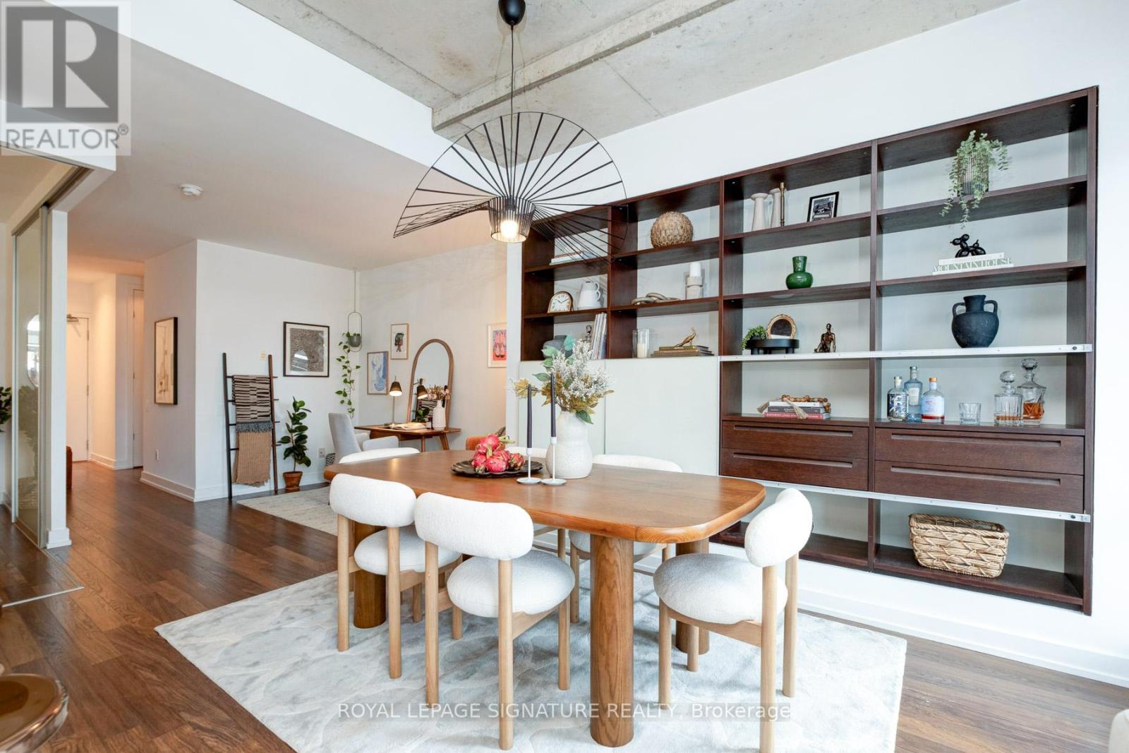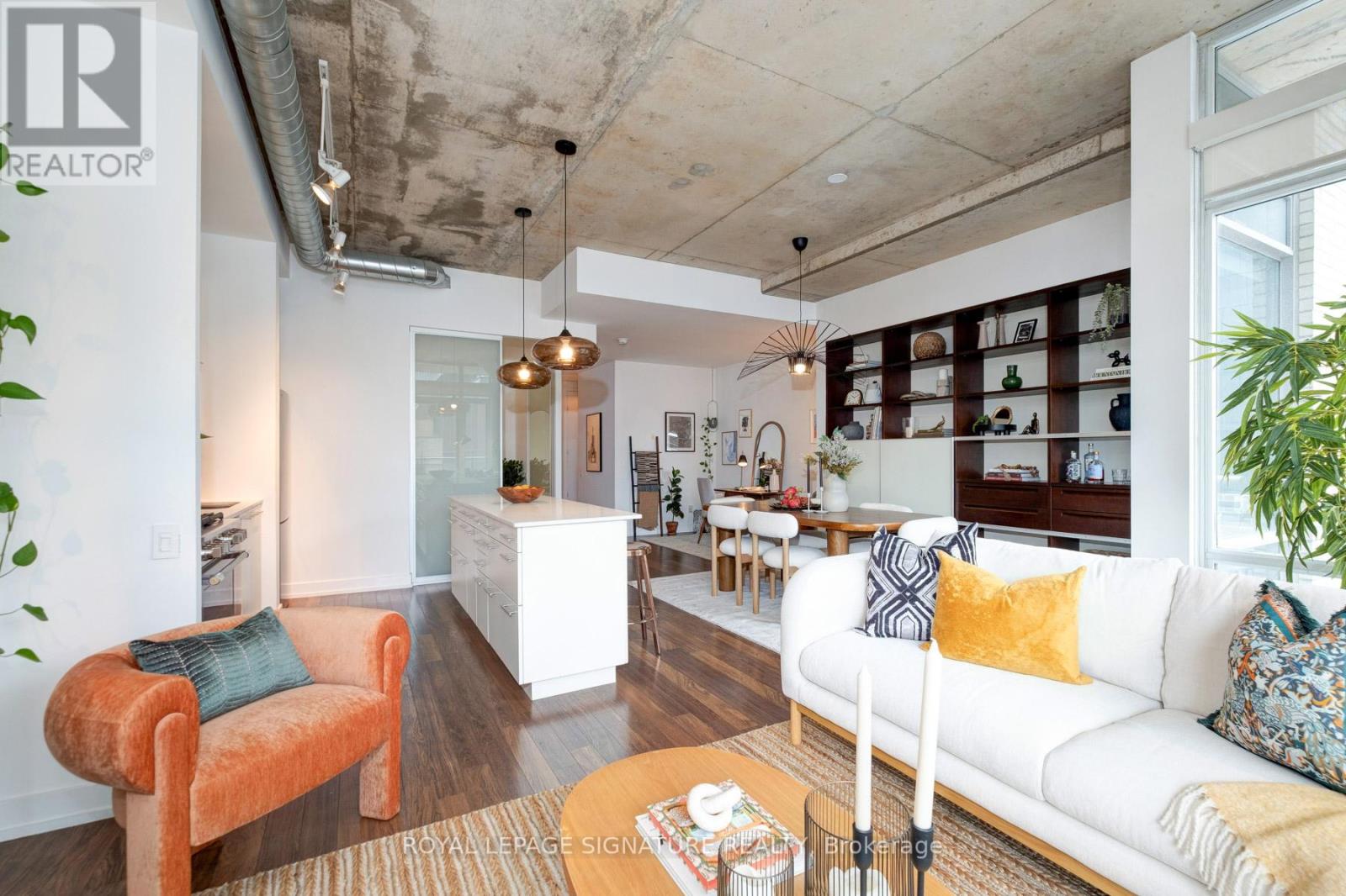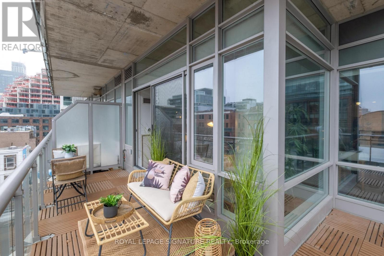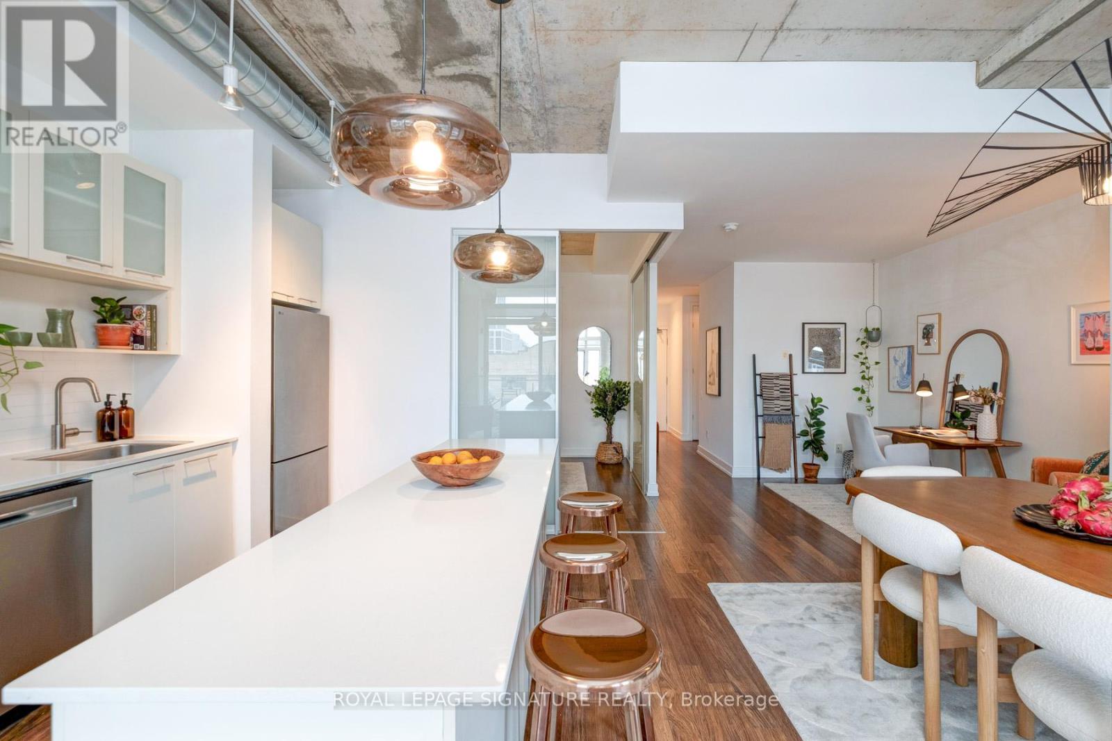 Where King West energy meets boutique loft living. A gorgeous suite designed for entertaining, relaxing, & enjoying the buzz of the city. Welcome to 66 Portland St Suite 513, a beautifully updated 1+1 bedroom, 2 bathroom loft offering 927 sqft. of thoughtfully designed living space in a prime boutique building. This industrial-chic yet warm & inviting suite offers the perfect balance of vibrant city living & peaceful retreat. Experience the best of both worlds - the vibrant energy of King West at your doorstep, with quieter neighbourhood streets just moments away. Designed for both entertaining and everyday living, the spacious layout showcases a true full-size dining area anchored by custom built-in shelving, creating the perfect setting for hosting. The beautifully updated kitchen features an oversized island, new appliances including a gas stove, & excellent storage. A separate, full-sized living room framed by floor-to-ceiling windows opens directly onto a large 130 sqft. balcony complete with a gas line for BBQing, creating a seamless indoor-outdoor flow. Whether entertaining friends or enjoying a quiet evening outside, the balcony feels like a natural extension of the living space. The generous den functions beautifully as a large home office, ideal for today's work-from-home lifestyle. The primary bedroom comfortably accommodates a king-sized bed & features a walk-in closet with custom built-ins & a private ensuite. A rare second bathroom adds convenience for guests which is a rare & standout feature. Thoughtful upgrades throughout include custom built-in storage in both the hallway closet & walk-in closet, along with window coverings, maximizing both functionality & style. This suite is complete with prime parking & a large locker. With its generous square footage & rare layout offering a full dining area, spacious kitchen, & separate living room, this suite truly lives like a home in the sky. A King West opportunity that you need to see for yourself. (id:64974)
