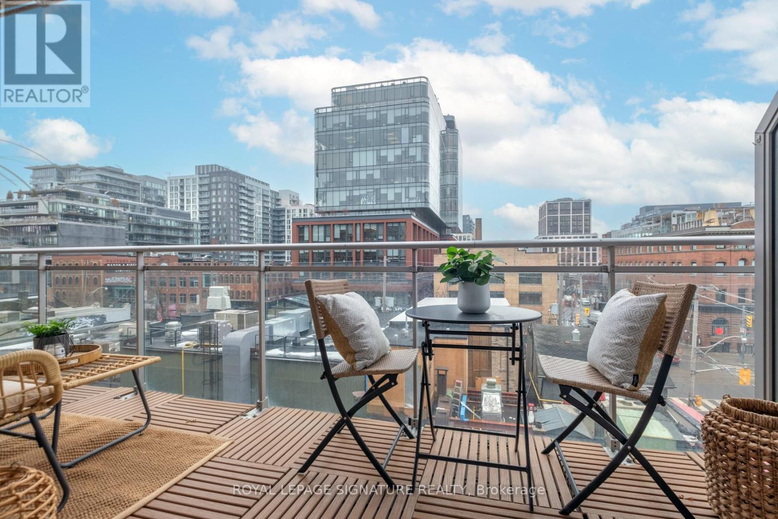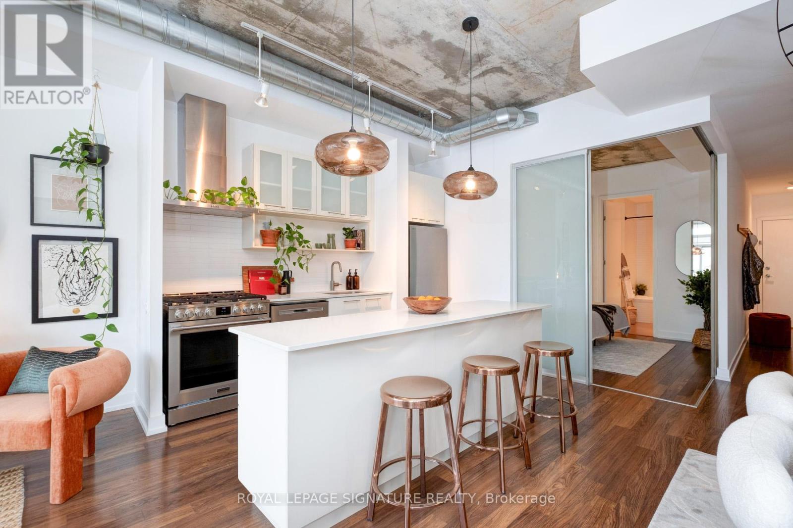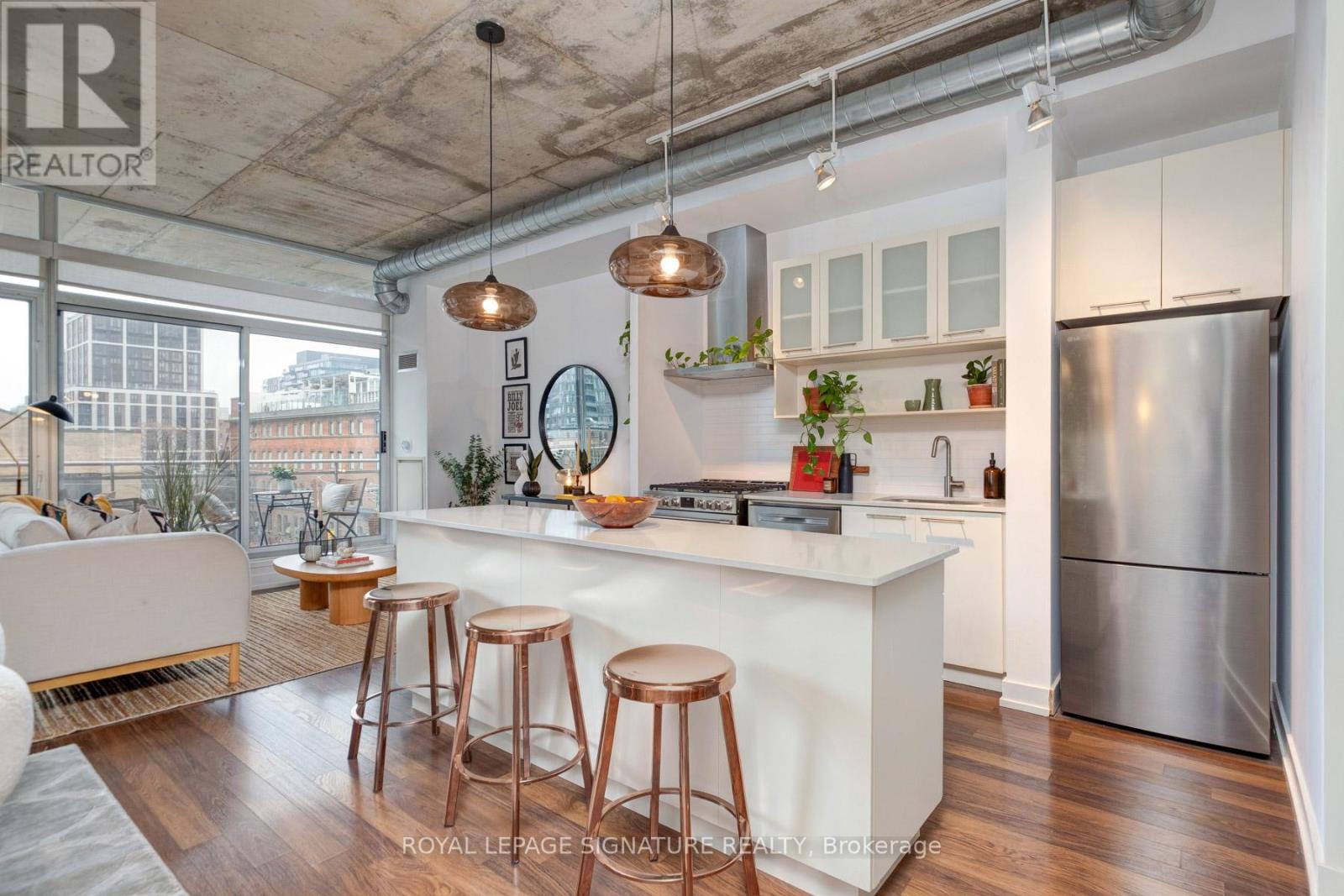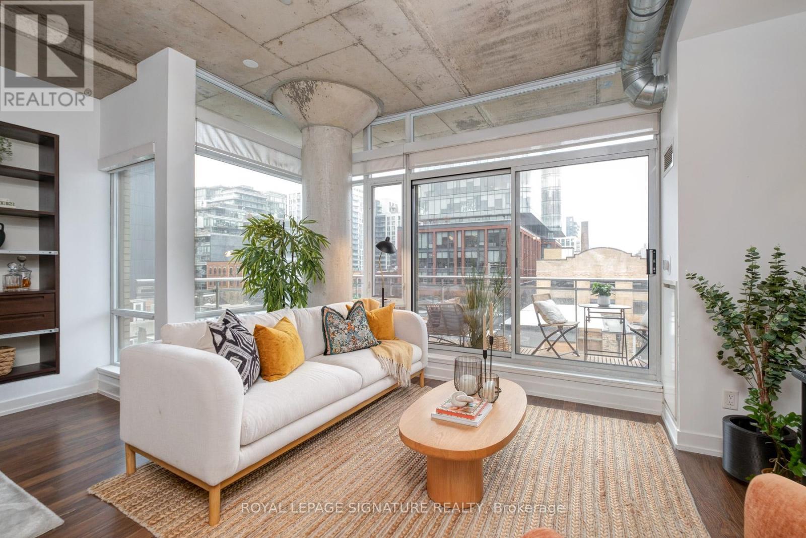 Where King West energy meets boutique loft living. A gorgeous suite designed for entertaining, relaxing, & enjoying the buzz of the city. Welcome to 66 Portland St Suite 513, a beautifully updated 1+1 bedroom, 2 bathroom loft offering 927 sqft. of thoughtfully designed living space in a prime boutique building. This industrial-chic yet warm & inviting suite offers the perfect balance of vibrant city living & peaceful retreat. Experience the best of both worlds - the vibrant energy of King West at your doorstep, with quieter neighbourhood streets just moments away. Designed for both entertaining and everyday living, the spacious layout showcases a true full-size dining area anchored by custom built-in shelving, creating the perfect setting for hosting. The beautifully updated kitchen features an oversized island, new appliances including a gas stove, & excellent storage. A separate, full-sized living room framed by floor-to-ceiling windows opens directly onto a large 130 sqft. balcony complete with a gas line for BBQing, creating a seamless indoor-outdoor flow. Whether entertaining friends or enjoying a quiet evening outside, the balcony feels like a natural extension of the living space. The generous den functions beautifully as a large home office, ideal for today's work-from-home lifestyle. The primary bedroom comfortably accommodates a king-sized bed & features a walk-in closet with custom built-ins & a private ensuite. A rare second bathroom adds convenience for guests which is a rare & standout feature. Thoughtful upgrades throughout include custom built-in storage in both the hallway closet & walk-in closet, along with window coverings, maximizing both functionality & style. This suite is complete with prime parking & a large locker. With its generous square footage & rare layout offering a full dining area, spacious kitchen, & separate living room, this suite truly lives like a home in the sky. A King West opportunity that you need to see for yourself. (id:64974)