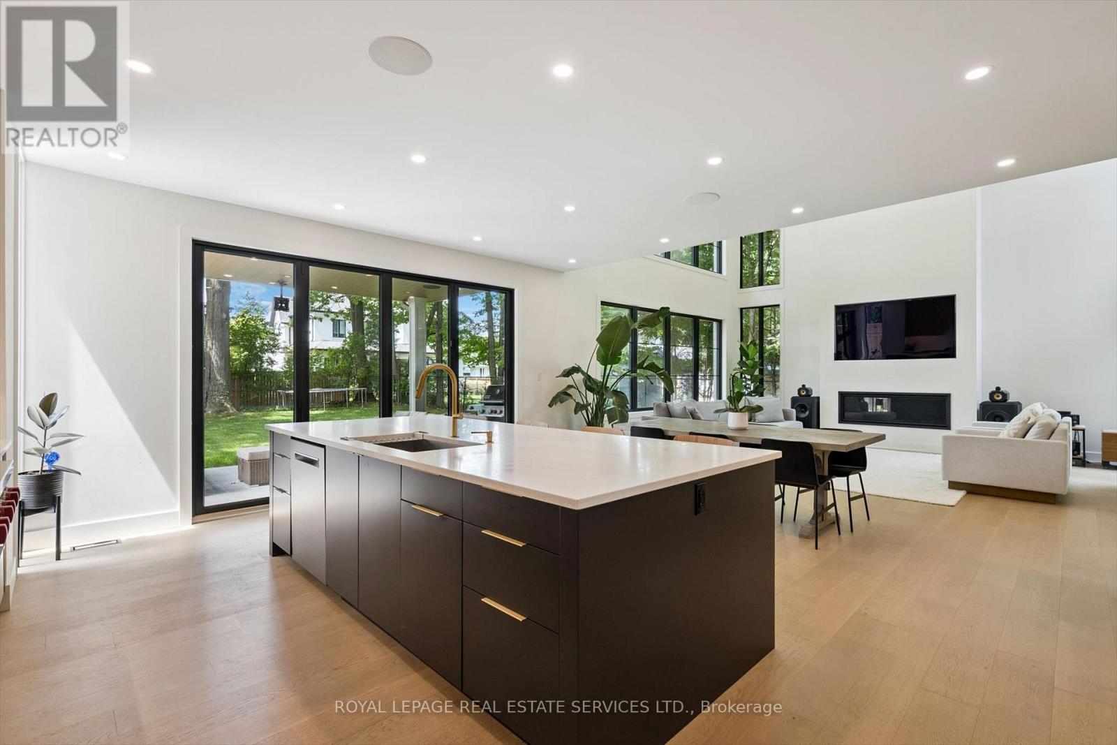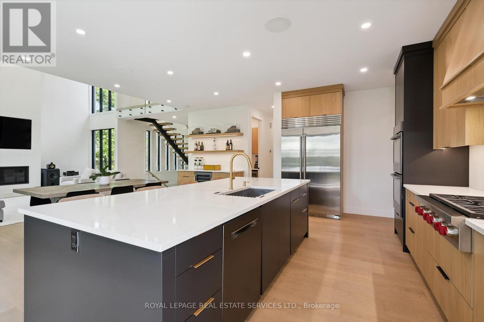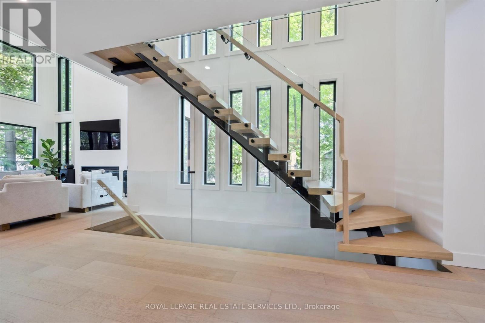 INSPIRED ENTERTAINING! A custom modern residence by acclaimed architect Jeff Cogliati (Bloom Architects), with striking architectural lines, large-scale windows, and a design tailored for everyday living and entertaining. Situated on a sprawling 0.22 acre lot, the home makes a striking first impression with its sculptural stone façade, dramatic sloped roofline, and cedar-clad insulated garage doors with EV charging outlet. Inside, expansive double-height slot windows flood the interior with natural light and frame a tranquil Zen Garden courtyard - the focal point of the main level. A floating mono-beam staircase with solid white oak treads anchors the space, leading to a stunning two-storey living room, dining area, and a chef-inspired kitchen designed for entertaining. Highlights include a large island, Sub-Zero fridge, Wolf six-burner gas cooktop, pot filler, double wall ovens, beverage fridge, and a prep kitchen with second dishwasher, instant hot water faucet, and additional beverage fridge. Custom millwork throughout the kitchen, vanities, and mudroom built-ins ensures exceptional craftsmanship and cohesive design. Accordion glass doors open to a covered terrace with built-in speakers, pot lights, and BBQ gas hookup for seamless indoor-outdoor living. Upstairs, the luxurious primary retreat features dual walk-in closets and a spa-inspired five-piece ensuite with heated floor. A junior primary suite offers heated flooring in the bedroom, dressing area, and ensuite, while two additional bedrooms share a beautifully appointed five-piece bath. Additional features include 7.5" engineered white oak floors, a private two-storey office overlooking the Zen Garden, an oversized mudroom with second powder room and backyard access, 4-zone in-ceiling speakers, and dual high-efficiency HVAC systems for optimal climate control. Ideally located near top-rated schools, shopping, dining, highways, and the GO Train. An architecturally distinct home in sought-after West Oakville (id:64974)