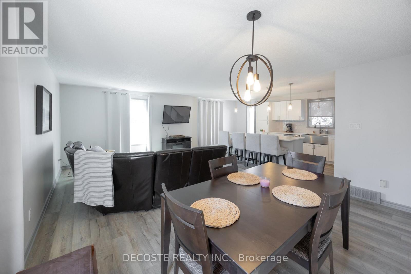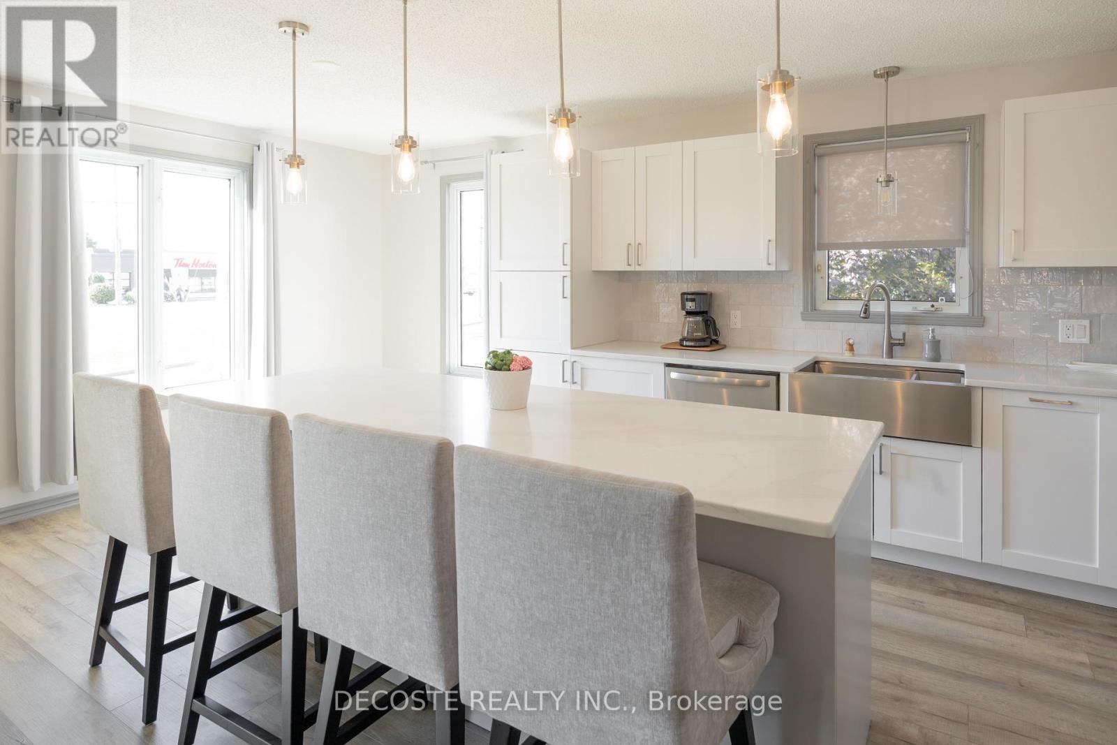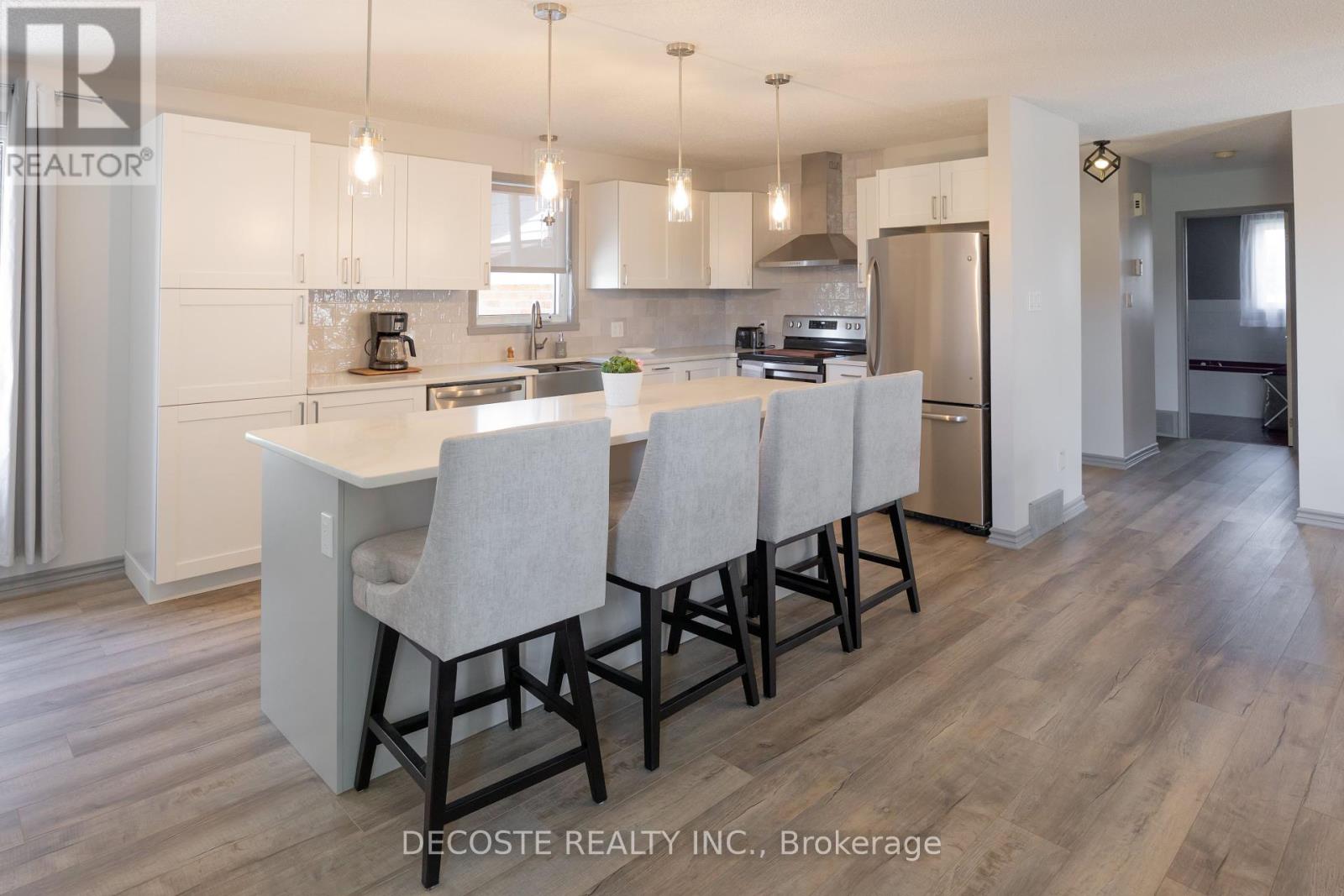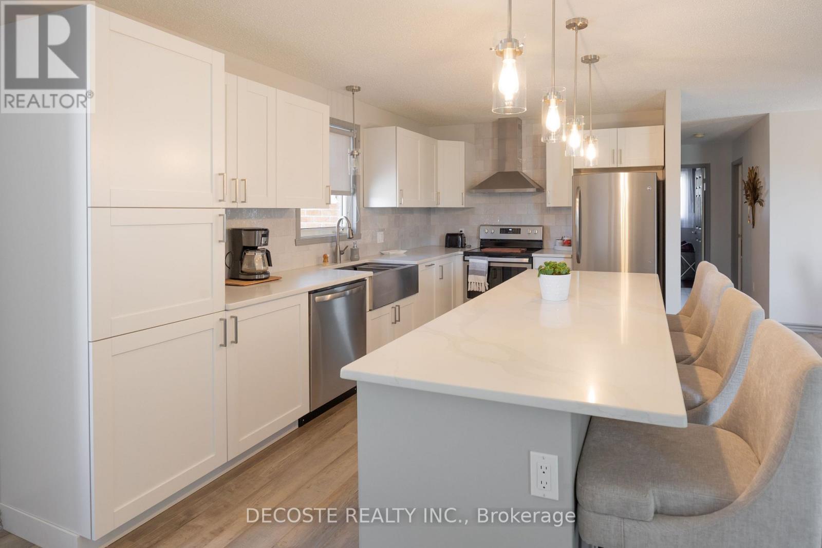 Beautiful Brick Bungalow! Located in the south end of Alexandria, this split-entry home offers a modern, open-concept layout that's bright, inviting, and perfect for entertaining. The updated kitchen features a large eat-in island with quartz countertops, stainless steel appliances, stylish backsplash, new light fixtures, and new flooring throughout the main level. You'll find two good-sized bedrooms and a 3-piece bathroom on the main floor. The fully finished basement adds two additional bedrooms, a second updated 3-piece bathroom, and a cozy family room ideal for kids or movie nights. Step from the main floor bedroom onto the rear deck overlooking a private backyard with no rear neighbors. The attached garage is a welcome bonus during the winter months, and the interlock driveway adds a touch of class and curb appeal. Conveniently located just steps from Tim Hortons and major stores, let's make this your next home! (id:64974)