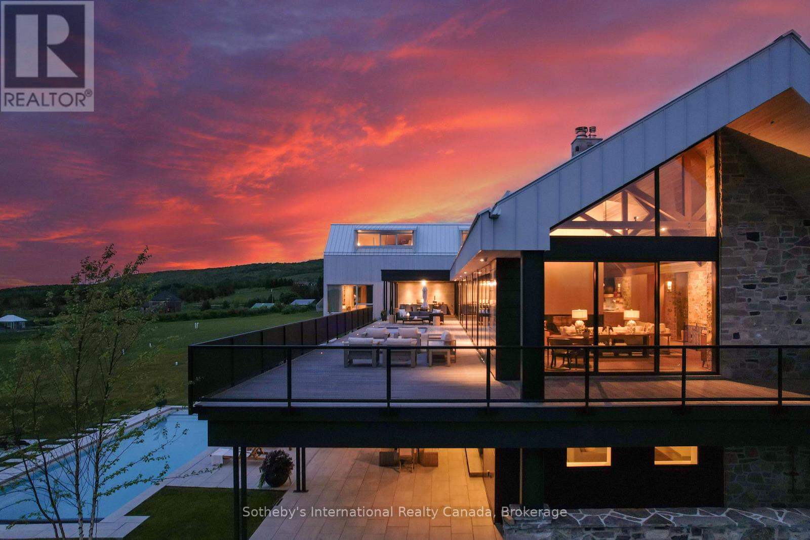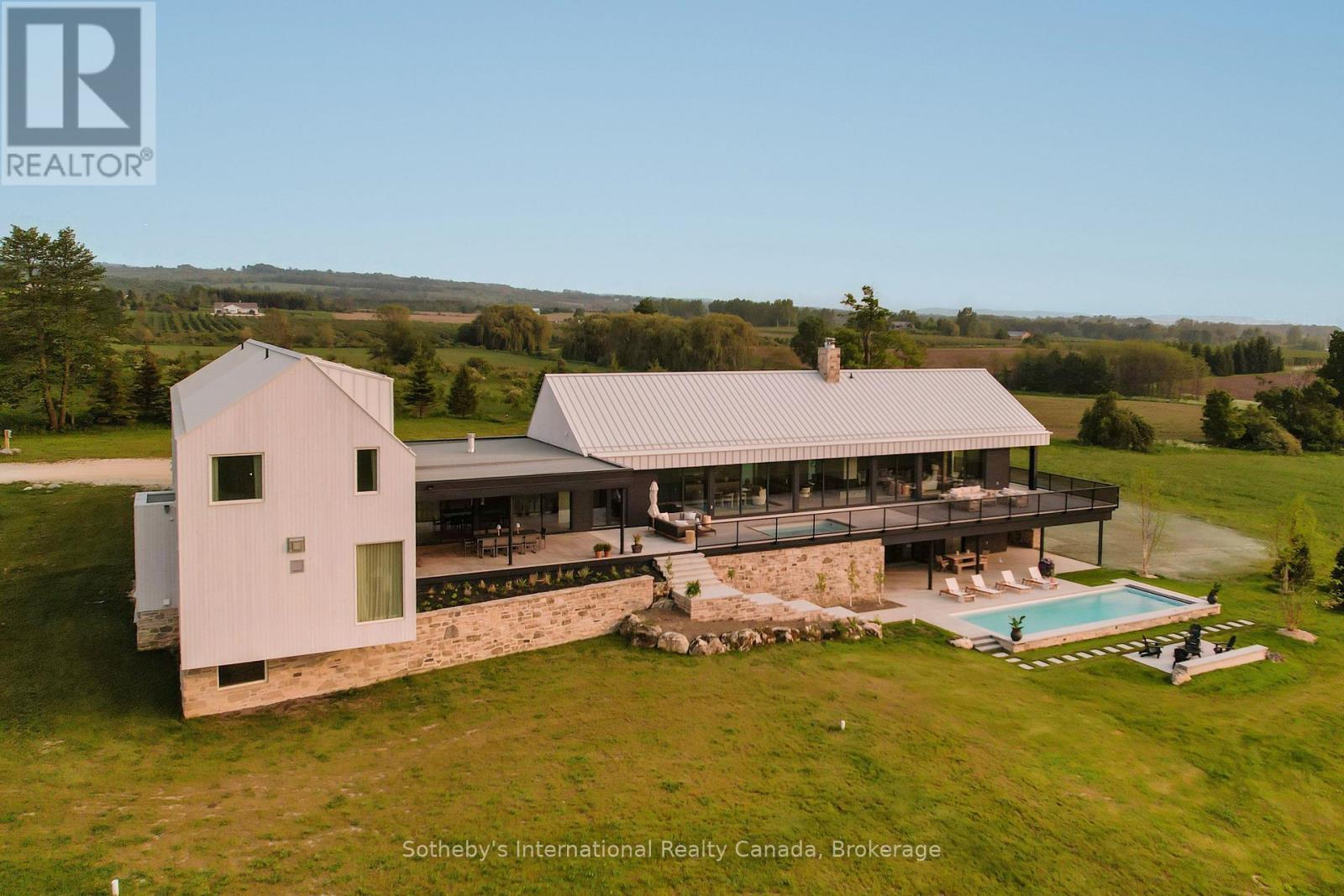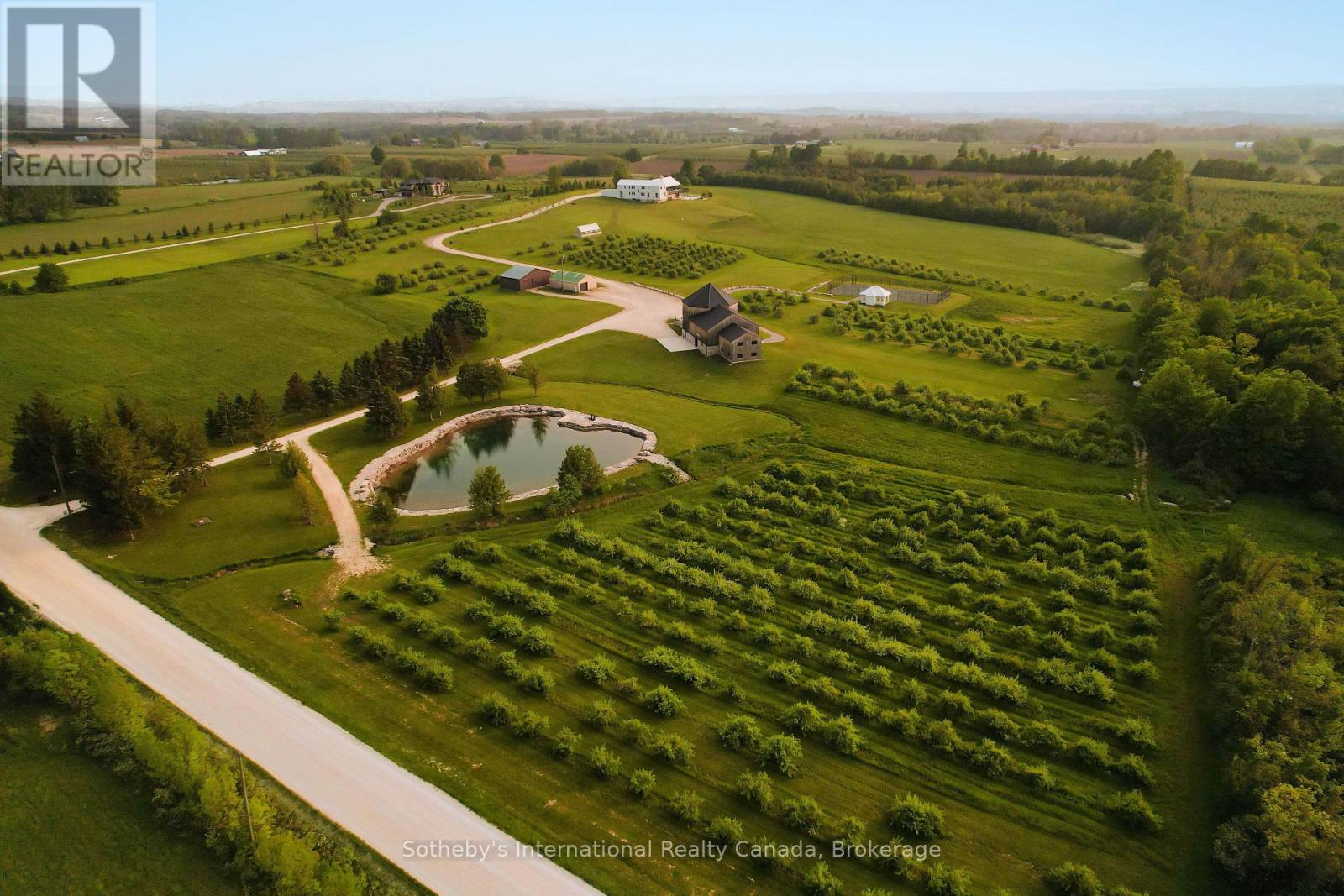 Never has there been an offering quite like this in the Blue Mountains. Welcome to Georgian Valley Farm, where world-class design meets the unspoiled beauty of nature and breathtaking sunsets. Set on 37 spectacular acres, this one-of-a-kind estate is anchored by an extraordinary 11,000 sq ft custom residence - a design landmark by Post Architecture Inc. and built by renowned builder David Eaton, Baylyn Construction. This property defines luxury recreational living, w/saltwater pool, Har Tru clay tennis court, orchard, pond, a Hartley Botanic Greenhouse - 'Grand Manor' imported from the UK and an incredible restored barn, ideal for entertaining. Perched high on 7th Line, the home presents commanding, panoramic views of the Niagara Escarpment and Georgian Bay from nearly every room. Scandinavian-inspired minimalism blends with refined country elegance, w/ Moncer European oak floors, soaring wood-clad ceilings, and a wall of floor to ceiling windows by Atek that frame the landscape. Chef's kitchen features a 12-ft marble island, appliances by Miele, Sub-Zero, and Lacanche, custom Barlow millwork, exquisite stonework and full butler's pantry. The dining room for 14 includes a concealed Barlow bar and a striking 2-way woodburning STUV fireplace shared with the living room. Thoughtful details are found throughout w/ designer lighting, imported tiles and hand-painted De Gournay wallpaper in the adult lounge, library, and powder room. A main floor primary sits behind double Egyptian doors and features a gas fireplace, luxurious ensuite, WIC, and sitting area. 4 upper bedrooms, all uniquely designed, feature beautifully curated ensuites with extensive tile/marble finishes, custom millwork and WIC. The lower level offers a golf simulator, gym, sauna, rec room, refreshment area, 200+ bottle Rosehill Wine Cellar, and w/o to the covered terrace and pool. Exceptional outdoor living offers a 2,520 sq ft deck, with a full Crown Verity kitchen, dining & lounge areas, and a hot tub. (id:64974)