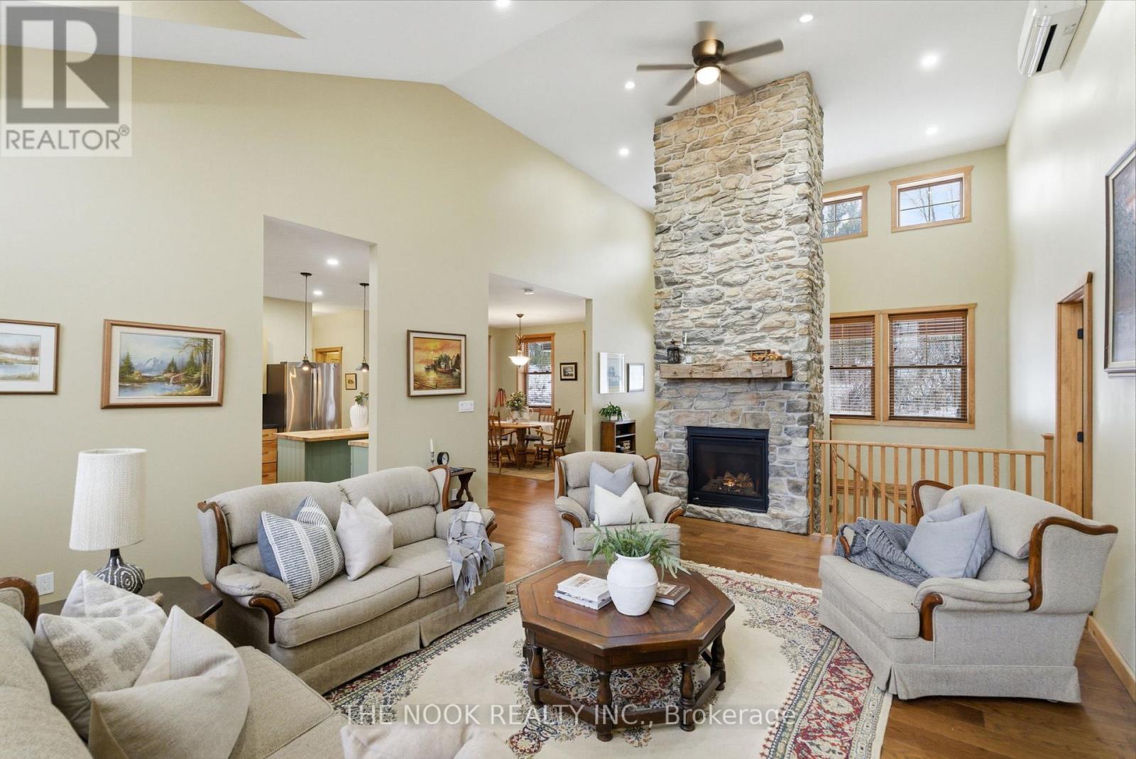 Set on just over half an acre in a quiet lakeside neighbourhood, this exceptional 4-year-old home offers stunning views of Rice Lake and an unparalleled indoor/outdoor lifestyle. A public dock and boat launch are conveniently located within 200 metres, making this an ideal property for boating and lake enthusiasts.Designed with a unique, sun-filled open-concept layout, the home offers approximately 2,400 sq ft of finished living space with 9' ceilings throughout and a dramatic 15' vaulted ceiling on the main floor. At the heart of the home is a massive central stone fireplace, complemented by a propane fireplace on the main level and a wood-burning fireplace in the lower level, creating warmth and character year-round.The main floor features a spacious primary bedroom with a private covered porch, a beautifully appointed ensuite, main floor laundry, and abundant storage and closet space. The finished walk out lower level offers two large bedrooms, a full bath, and additional living space ideal for family or guests. Hardwood and ceramic flooring flow throughout the home, adding timeless style and durability.Built for comfort and efficiency, the home boasts super-insulated walls and ceilings, in-floor hydronic heating on all levels, and a propane boiler providing both heat and hot water. Three mini-split units offer supplemental heating and air conditioning.Car, hobby, and recreational enthusiasts will appreciate the oversized four-car over/under garage, complete with a 9,000 lb Atlas two-post hoist, in-floor heat in the lower garage, propane radiant heat in the upper garage, air compressor plumbing on both levels, welder plug, RV hookups, and extensive storage for cars, boats, and campers.With covered front and rear porches, breathtaking lake views, and thoughtfully designed spaces throughout, this remarkable property offers comfort, functionality, and a lifestyle rarely found. (id:64974)