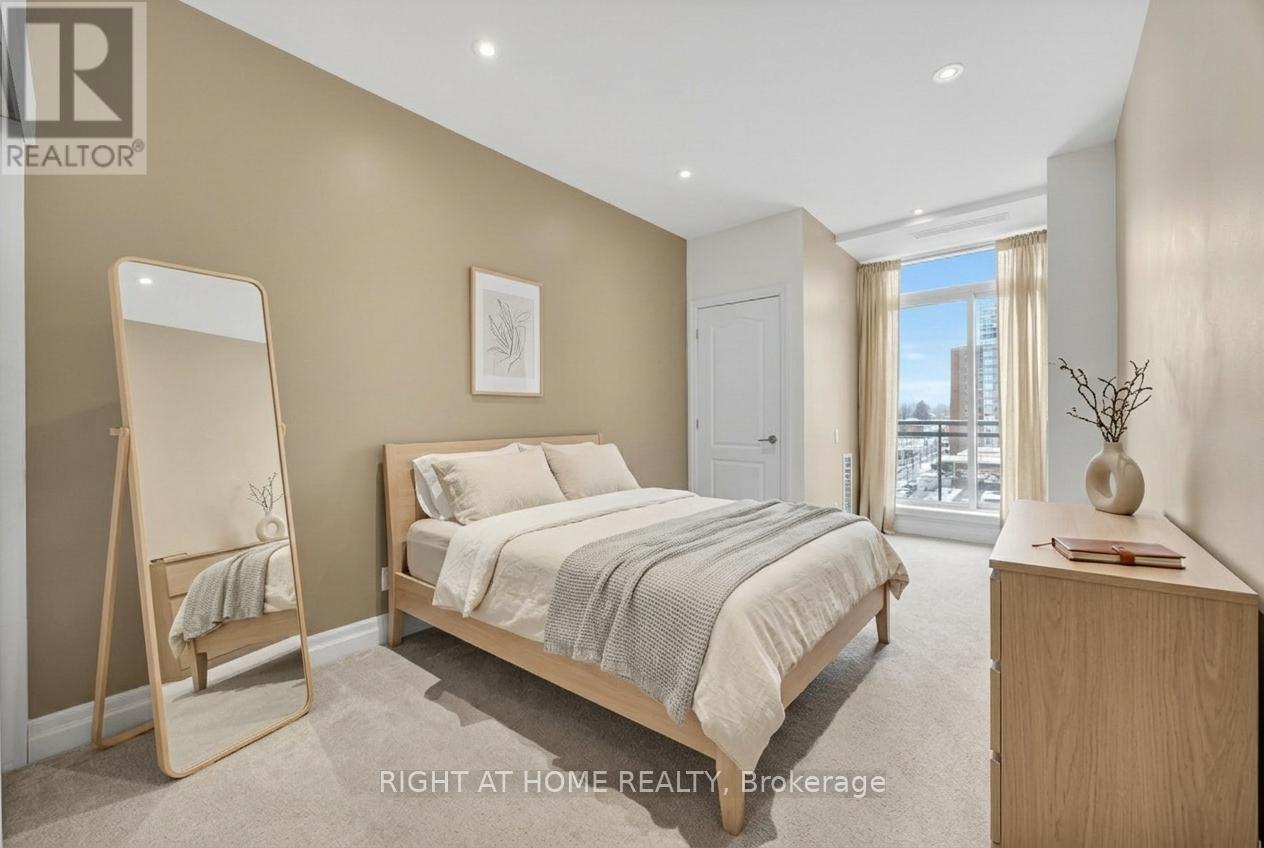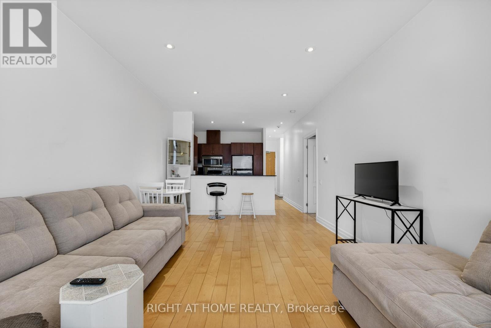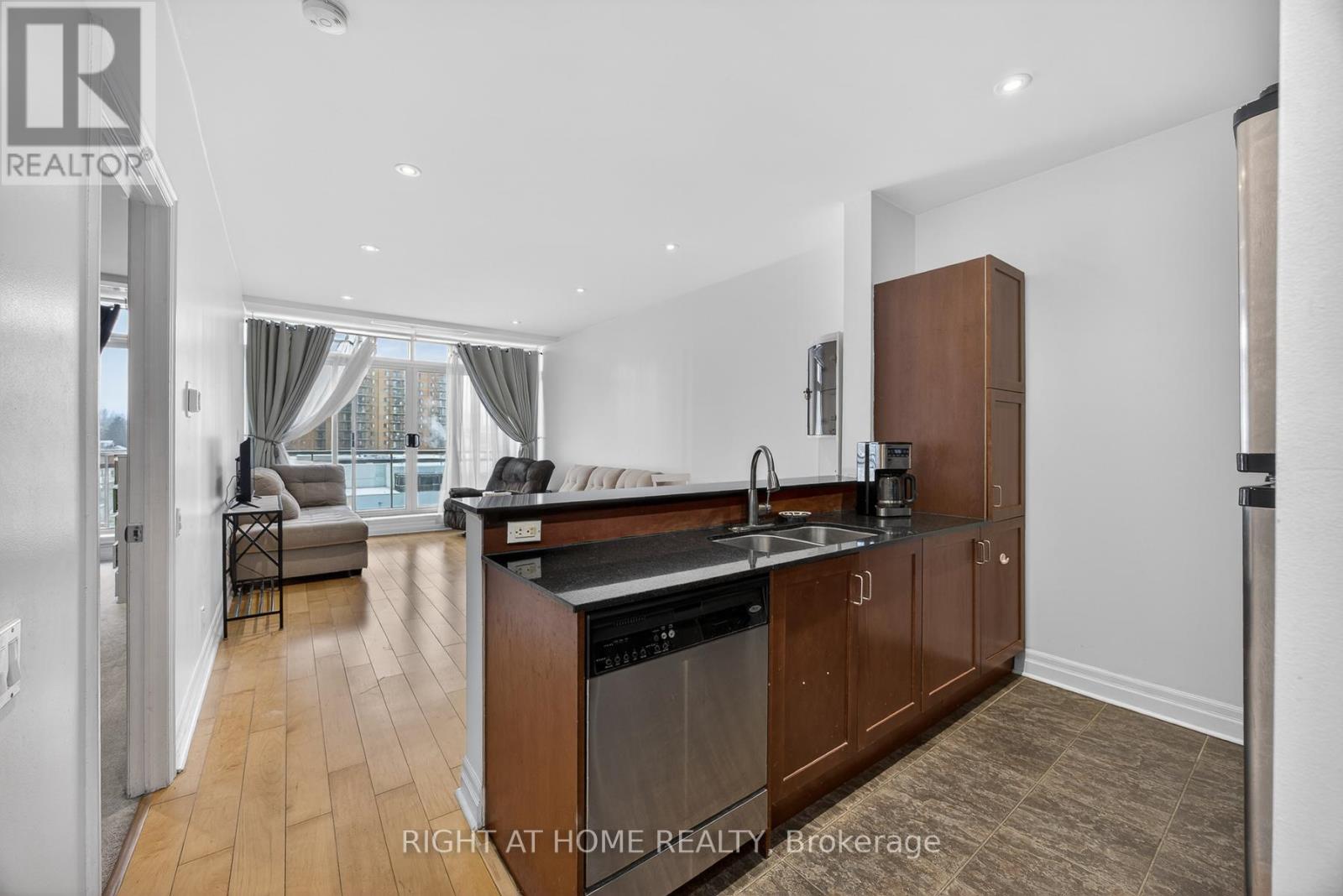 Welcome to this pristine, intelligently designed 1-bedroom plus den unit in the heart of Downtown Oshawa. Tucked away in a quiet corridor far from the noisy elevator banks, this unit is engineered for daily living. Unlike chopped-up floorplans that waste square footage, this bright, open-concept layout maximizes your primary living areas with 9-foot ceilings, pot lights, and fresh paint. The kitchen features stainless steel appliances and a breakfast bar, flowing seamlessly into an expansive living space. A versatile den works perfectly as a home office, nursery, or guest space. Step out onto the large, private balcony-accessible from both the living area and the bedroom-to enjoy unobstructed, glare-free North views. This quiet sightline completely avoids the heavy traffic noise. Highly efficient with low carrying costs, this unit simply performs well for first time home buyers, or investors. It includes one parking spot in the secure second-floor garage and one locker. Enjoy premium building amenities including a gym, sauna, party room, and meeting room. Conveniently located near Lakeridge Health Oshawa, Ontario Tech University, the GO Station, and transit right at your doorstep. Bonus: A planned dedicated transit lane for Bond Street will soon connect Oshawa directly to U of T Scarborough. (id:64974)