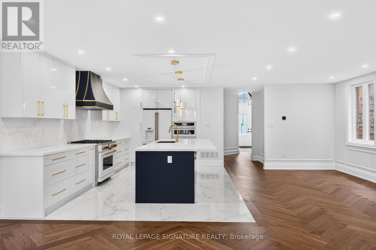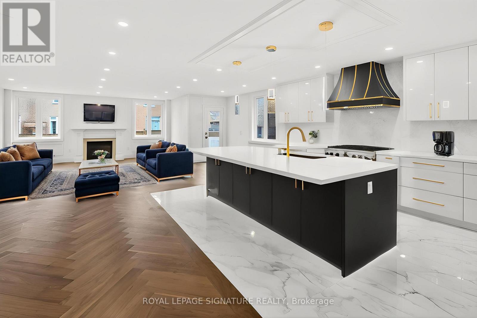 Luxury redefined in Churchill Meadows-5180 Littlebend Dr showcases over $450,000 in high-end upgrades with designer finishes throughout. A grand foyer with soaring ceilings and tile flooring leads to a bright open-concept main level with pot lights and chevron hardwood floors. The designer kitchen features panel-ready appliances, quartz countertops and backsplash, crown moulding, a large centre island, and elegant gold accents. The kitchen flows into the dining and living areas with wainscoting, fireplace, and walkout to a backyard deck-ideal for entertaining. Main floor laundry and powder room complete the level. Upstairs, a curved staircase leads to the primary retreat with a custom walk-in closet and spa-inspired5pc ensuite with soaker tub, glass shower, and dual vanities. Three additional bedrooms offer generous space, including a semi-ensuite and main bath. The finished basement adds flexibility with a 5th bedroom, full kitchen with stainless steel appliances and quartz counters, and a spacious rec area, perfect for extended family or entertaining. Fully fenced backyard. Some photos are Virtual Stager (id:64974)