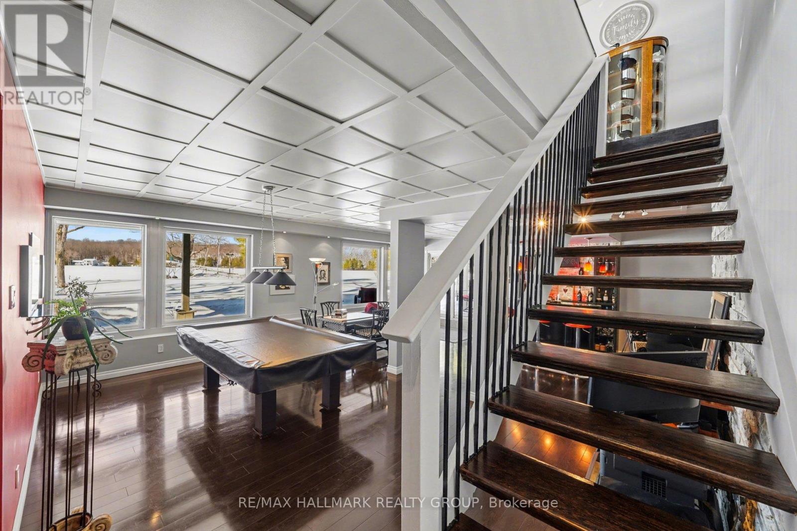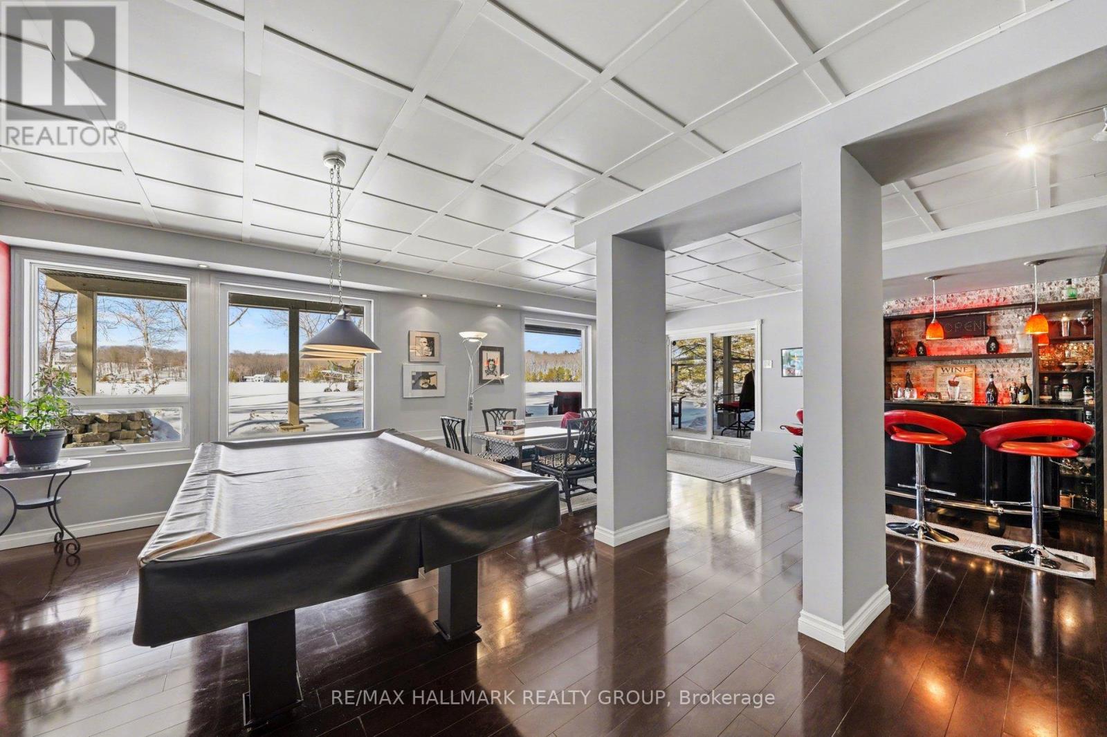 Escape to your perfect blend of home and cottage at 519 Parsons Lane, nestled in the beautiful Lanark Highlands. This waterfront sanctuary offers effortless water access and sweeping Western views from a large deck with a covered patio below, ideal for year-round enjoyment. The main level features bright, open-concept living with 20-foot ceilings and a propane fireplace in the living room that overlooks the dining area and modern kitchen, which includes an island, granite countertops, and a mirrored backsplash. Two bedrooms on the main level, one with laundry, plus a full family bathroom provide convenience and versatility. The second floor overlooks the main level and hosts a luxurious primary bedroom with a spa-like ensuite for ultimate relaxation. The lower walk-out level offers radiant floor heating in the cozy family room, a pool table, and a stylish bar with numerous windows framing lake views and manicured gardens. Outbuildings include an insulated two-car garage, a utility shed, and a toy shed closer to the lakefront. Meticulously landscaped grounds with lakefront access complete this rare offering-a true home and cottage in one, combining comfort, style, and waterfront serenity for weekend escapes or full-time living. (id:64974)