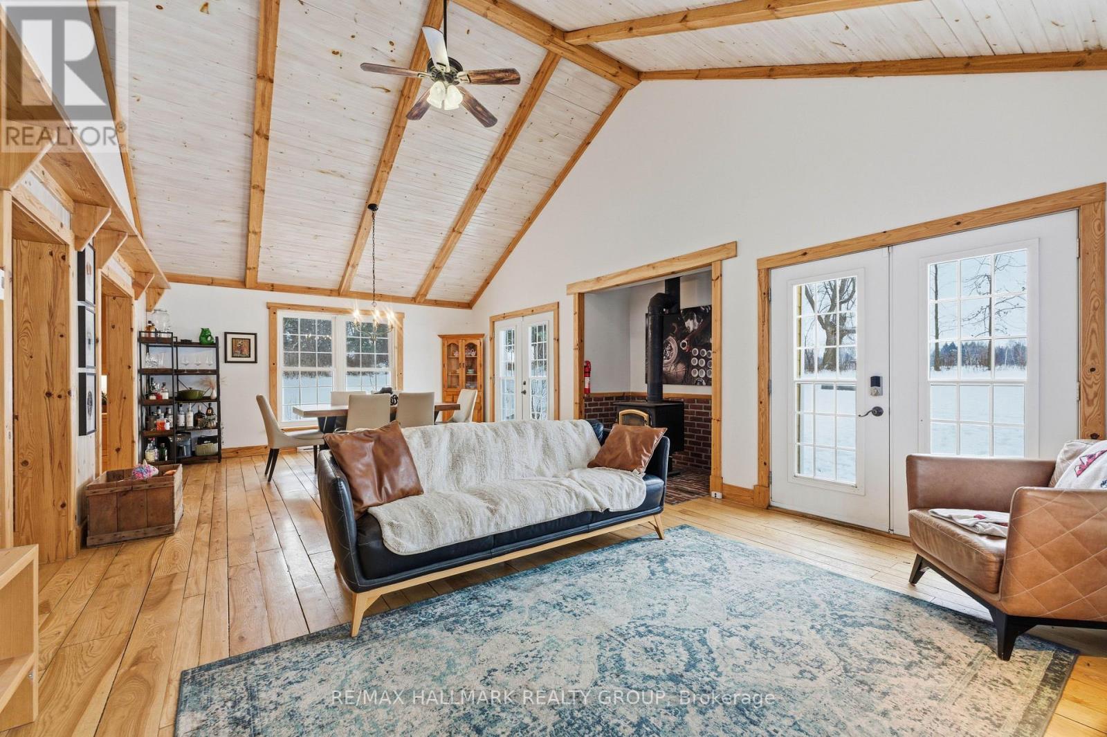 This charming warm and inviting home, thoughtfully renovated in 2014. Sitting on just under one acre of land, this property is perfect for anyone looking to escape the city and enjoy peaceful country living. Step inside and fall in love with the spacious open-concept living and dining area, highlighted by beautiful cathedral ceilings and exposed ceiling beams that bring warmth and character. This inviting space is filled with natural light thanks to Large windows and two French doors leading out to the backyard.The country-style kitchen features a large wood butcher-block island and a beautiful farmhouse sink, creating the perfect blend of charm, function, and style - ideal for cooking, entertaining, and everyday living.The main level also includes a bedroom, powder room and a laundry room for added convenience, while the second floor offers two additional bedrooms and full bathroom giving everyone space and privacy. The home also features two wood-burning stoves for cozy, efficient heat during the colder months. Unfinished Full basement gives plenty of space for storage or potential family room/ play room. If you're searching for charm, comfort, and the tranquility of the countryside, this property truly has it all. (id:64974)