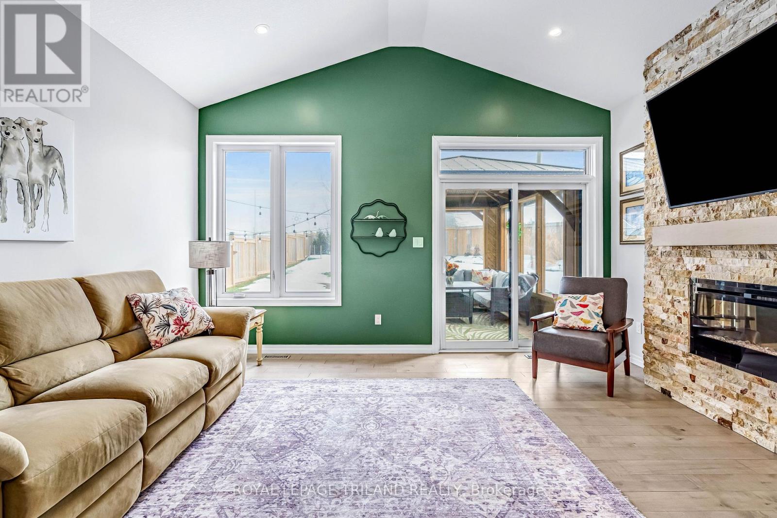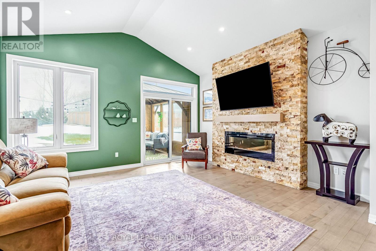 Welcome to 52 Charter Creek Court! This 3 bed 3 bath semi-detached home sits on a massive pie lot with no rear neighbours. This beautifully finished 1,784 sq. ft. semi-detached bungalow with a 1-car garage offers effortless main-floor living. The open-concept layout features a stunning kitchen with quartz island and pantry, flowing into a bright living room with vaulted ceilings and a cozy fireplace with brick accent wall. Hardwood floors highlight the main areas, while the two bedrooms and lower level are carpeted for maximum warmth. The primary suite includes a walk-in closet and private 3-piece ensuite. Just off the garage, you'll fine a convenient laundry/mudroom. The fully finished basement expands your living space with a large family room, additional bedroom, and 4-piece bath. The lower level features plenty of storage space and room enough for an additional bedroom. Outside, enjoy a gorgeous 3-season room off the living area, perennial gardens, and a fully fenced backyard. Don't hesitate - make 52 Charter Creek Court your new home today! (id:64974)
