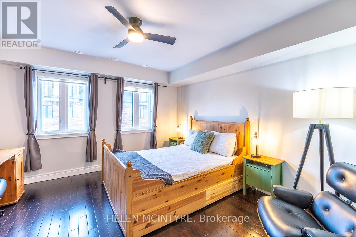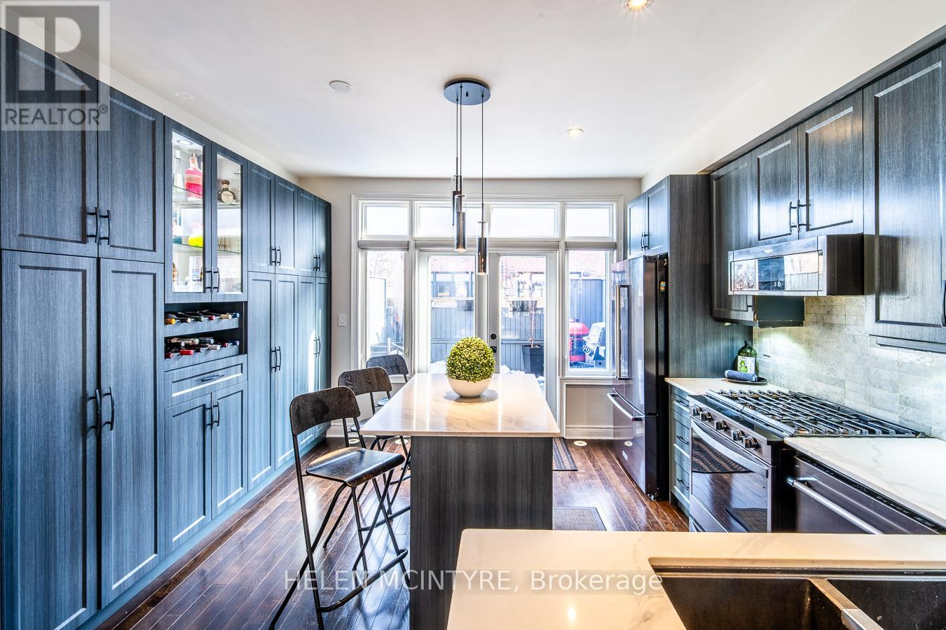 Welcome to this exceptional executive freehold townhome by Dunpar Homes, perfectly positioned in the heart of Mimico, just minutes to the QEW, Gardiner, 427 and Mimico GO.The classic stone and brick exterior leads into an exquisitely tiled foyer and a bright, open-concept main level featuring 9-foot ceilings, hardwood floors, crown moulding and modern pot lighting throughout. Large windows fill the space with natural light. The living area centres around a gas fireplace with custom built-ins and integrated surround sound, ideal for everyday living and entertaining.The upgraded designer kitchen is the heart of the home, featuring a spacious centre island and breakfast bar seating with quartz countertops, extended cabinetry, stainless steel appliances, under-cabinet lighting and built-in wine storage. A walkout from the kitchen leads to a large sunny south-facing deck with gas BBQ hookup and retractable awning, perfect for seamless indoor-outdoor living.The second level features two spacious bedrooms, a beautifully appointed 4-piece bathroom and a separate laundry room, both finished in striking high-end tile.The entire third floor is dedicated to the primary retreat, complete with a private balcony, walk-in closet with custom organizers and a spa-inspired ensuite featuring double sinks, soaker tub and glass shower.The ground level offers a versatile flex space ideal as a bedroom or office, a 2-piece bathroom and direct access to the oversized tandem garage with parking for two vehicles. The home is also equipped with central vacuum throughout for added convenience.Visitor parking is located directly across the street, adjacent to the park, offering exceptional convenience for guests. Surrounded by parks, schools, shops and community amenities, this home delivers the perfect balance of comfort, design and location.A rare opportunity in one of Mimico's most desirable enclaves. (id:64974)