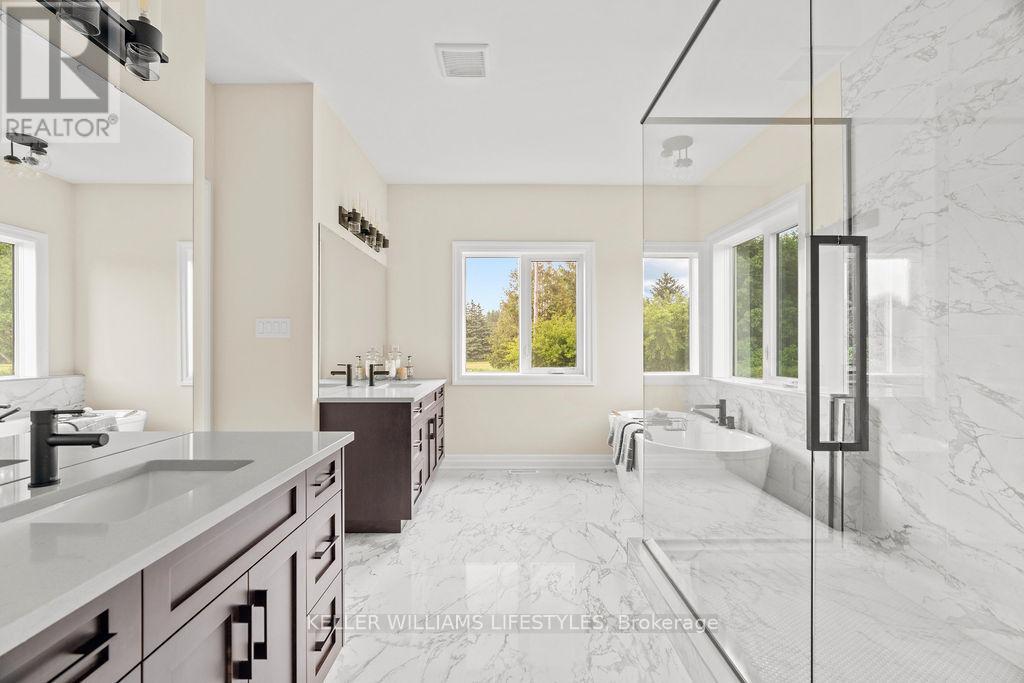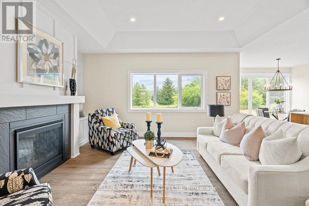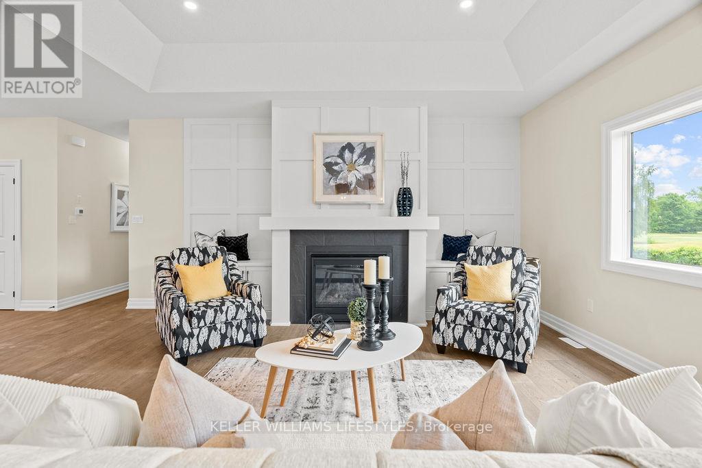 Welcome to the Remington by Banman Developments, a stunning 2,642 sq ft bungalow designed for luxurious, functional living. This beautifully crafted home features 3 spacious bedrooms, 2.5 bathrooms, a formal dining room, and an open-concept layout that blends elegance and comfort. The great room, anchored by a gas fireplace, flows seamlessly into the gourmet kitchen complete with custom cabinetry, quartz countertops, and a large island - perfect for entertaining and everyday living. The primary suite is a true retreat, offering dual walk-in closets and a spa-inspired ensuite with dual vanities, a soaker tub, and a glass and tile shower. Two additional bedrooms share a well-appointed bath, providing ideal space for family or guests. A thoughtfully designed layout and triple car garage add everyday convenience. Situated on a prime lot backing onto Arkona Fairways Golf Course, this home offers beautiful views and a sought-after setting. Enjoy the opportunity for quick possession, or choose your preferred lot and build this model or one of many other available plans to create your dream home - you can even bring your own builder. Built with high-end finishes including engineered hardwood and tile flooring, the Remington blends quality craftsmanship with modern functionality. Price includes HST. Property tax & assessment not set. Price reflects HST rebate. To be built, sold from floor plans. (id:64974)