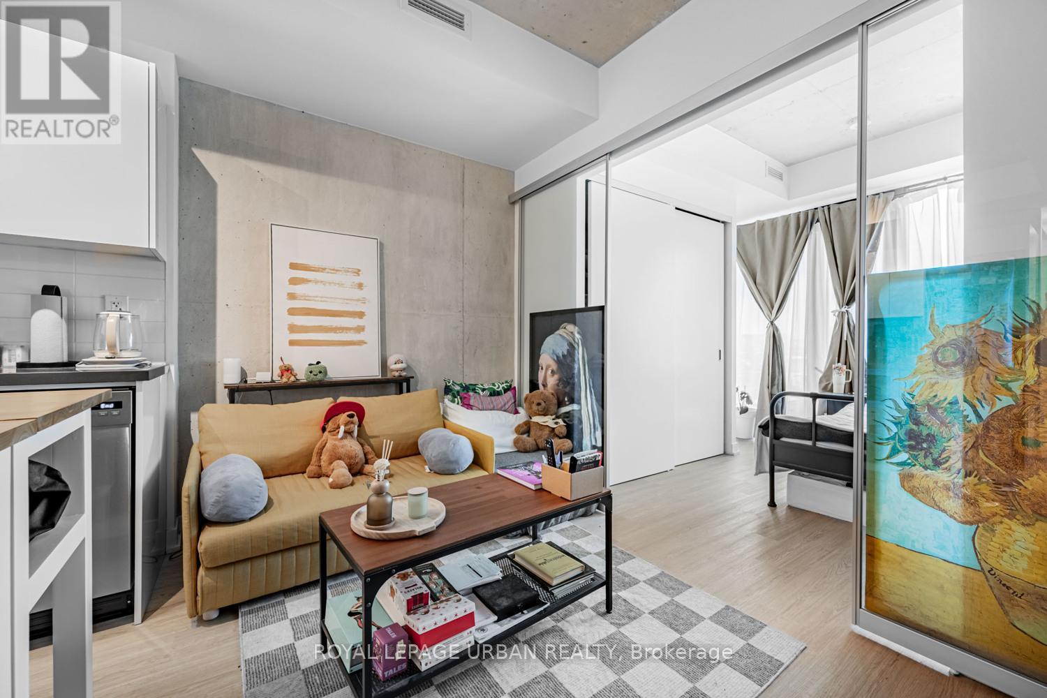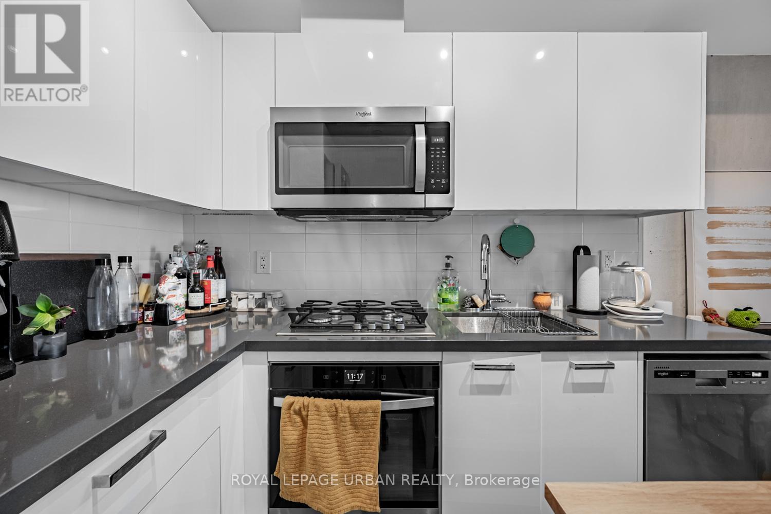 The Bread Company Condos by Lamb Development (2024). Bright and functional 1+1 bedroom offering stylish loft living with modern finishes throughout. Features exposed 9-ft concrete ceilings, open-concept layout, and west exposure with floor-to-ceiling windows and glass sliding doors that flood the space with natural light. The sleek kitchen offers ample storage and integrated stainless steel appliances, including a gas stove. Separate den provides flexible additional space for a home office or guest area. Spa-inspired four-piece bathroom showcases marble tile, soaker tub, and a large vanity with generous storage. PARKING INCLUDED. This convenient location truly has it all. Just steps to St. Patrick Station, the Dundas streetcar, University of Toronto, Queen's Park, Art Gallery of Ontario, Grange Park, Baldwin Village, Mount Sinai Hospital, Toronto General Hospital and SickKids Hospital. Minutes to Kensington Market, the Entertainment, Financial, and Fashion Districts. Surrounded by a vibrant mix of cultural restaurants, fitness clubs and gyms, chic cafés, upscale bars, and premier shopping in Queen West. (id:64974)
