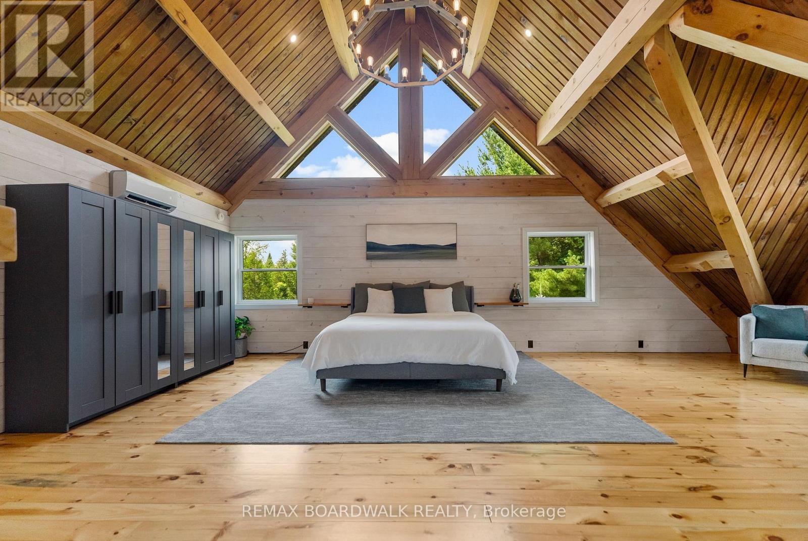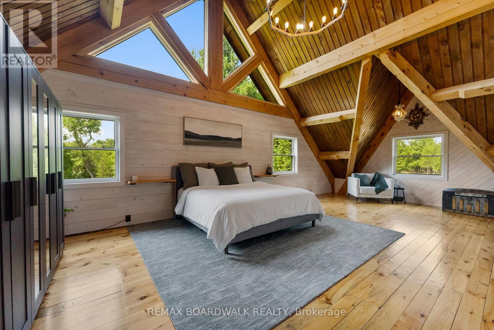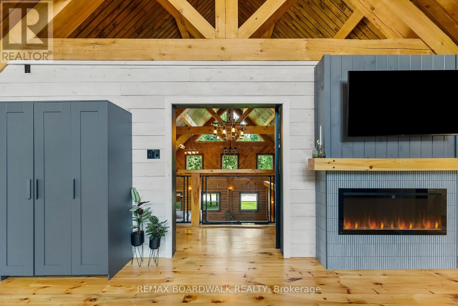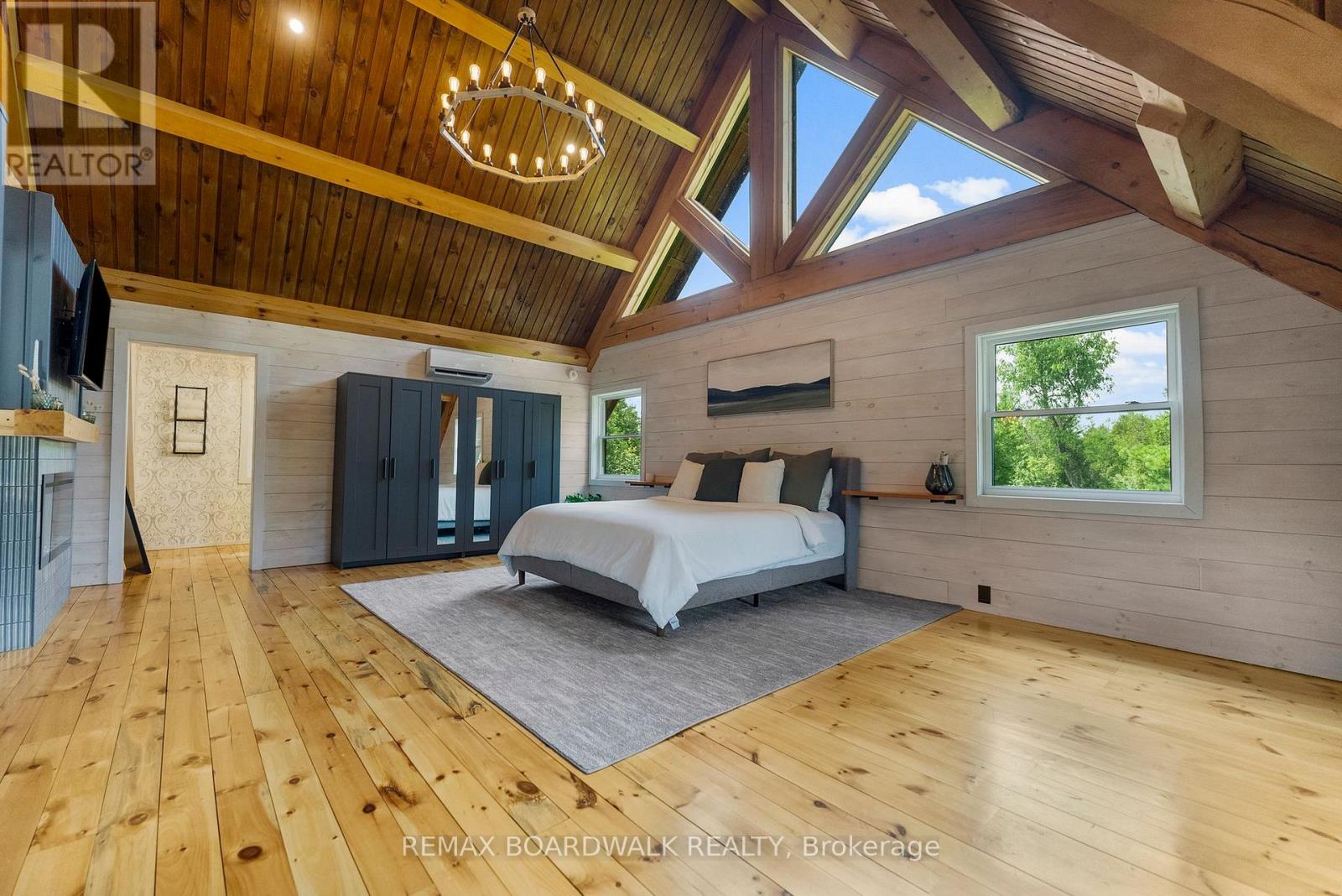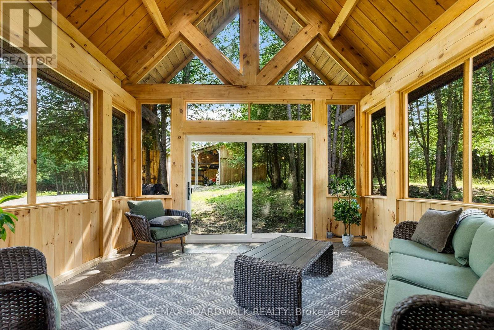 There's something unmistakably captivating about a true log home - the warmth of natural wood, the character in every beam, and the calm it creates the moment you step inside. Set on 2.4 private, tree-lined acres just minutes from the Village of Lanark, this custom-built 2013 home blends craftsmanship, comfort, and individuality.A striking timber-frame entrance sets the tone, leading into soaring cathedral ceilings, exposed beams, and expansive windows that flood the home with natural light. The open-concept layout feels both impressive and welcoming, balancing rustic authenticity with modern living.Built for efficiency and ease, the slab-on-grade design features radiant in-floor heating and stamped concrete floors that are both durable and visually striking. The kitchen offers tiled countertops, ample storage, and timeless finishes, while both bathrooms showcase quartz surfaces and quality fixtures. The second level overlooks the great room below and leads to a private primary suite complete with an electric fireplace and a beautifully finished ensuite designed for relaxation at day's end. Thoughtful details throughout celebrate natural living while delivering everyday comfort. Enjoy quiet mornings on the covered porch or peaceful afternoons surrounded by trees. With a durable metal roof and low-maintenance exterior, this is a home meant to be enjoyed, not maintained - a distinctive retreat defined by craftsmanship, character, and timeless appeal. (id:64974)