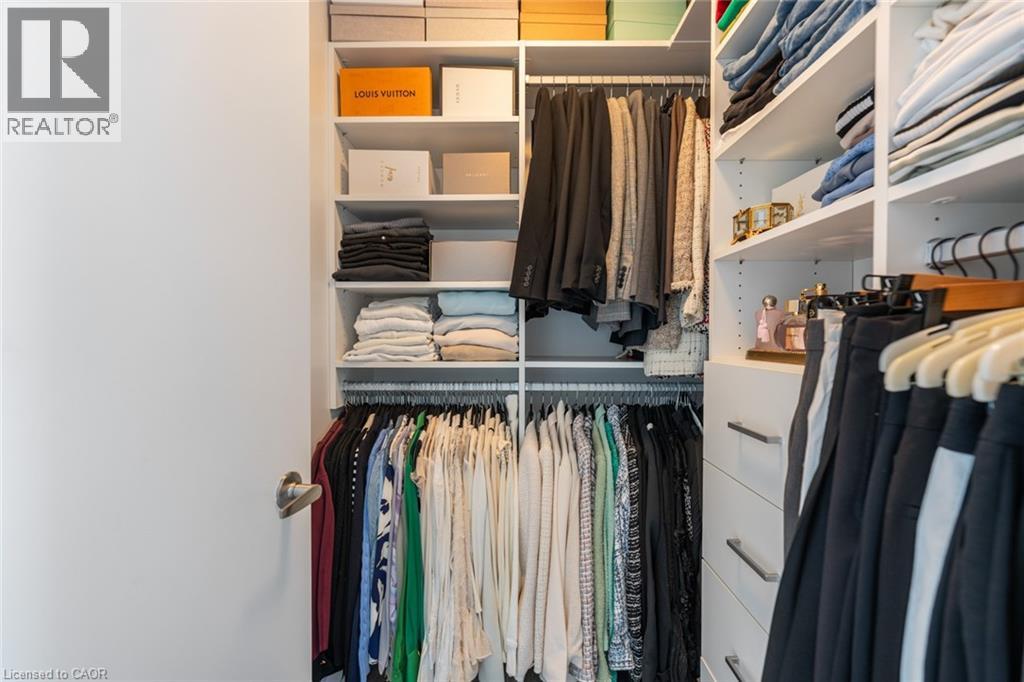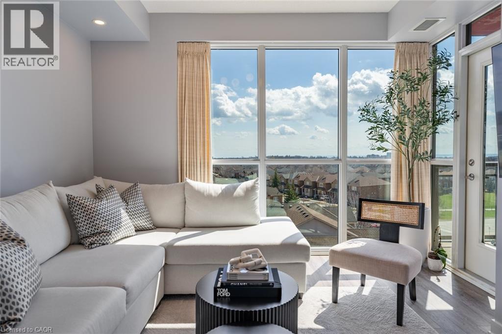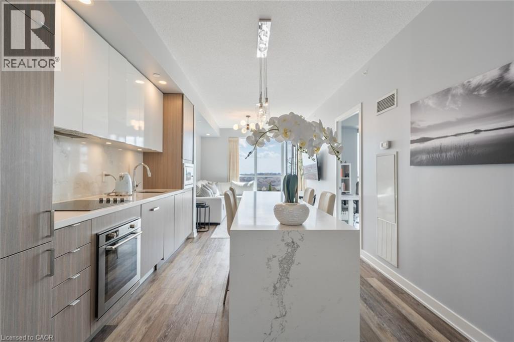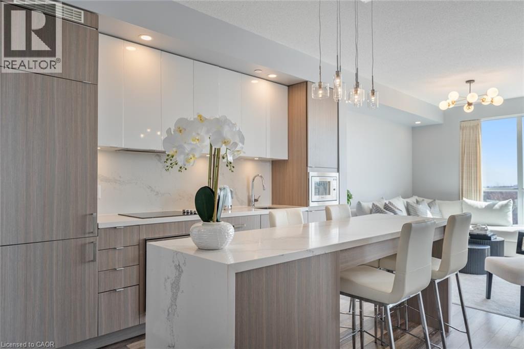 Welcome to unit 516 at 5220 Dundas St, a 2-bedroom, 2-bathroom condo in Burlington's sought-after Orchard community. This bright and spacious 831 sq ft unit features an open-concept layout with modern finishes, laminate flooring, upgraded lighting, and a sleek kitchen with stainless steel appliances, integrated fridge and dishwasher, and a large island with waterfall quartz countertops. In-suite laundry and a private balcony with views of the Niagara Escarpment round out the main living space. The primary bedroom includes a walk-in closet with custom organizers and a private ensuite bath, and the second full bathroom serves the second bedroom and guests comfortably. The building offers a full range of amenities including security, a gym, sauna, hot tub, party room, and a landscaped outdoor courtyard with BBQ area, plus private trail access leading to Bronte Creek Provincial Park. Ground-floor conveniences include a hair salon, barber, convenience store, pharmacy, and dental office all within the building. The unit also comes with one underground parking spot and a storage locker. Located in a quiet residential neighbourhood, just minutes from top-rated schools, parks, shopping, and with quick access to the QEW and 407, a great fit for first-time buyers, young professionals, or anyone looking for low-maintenance living in one of Burlington's most desirable communities. (id:64974)