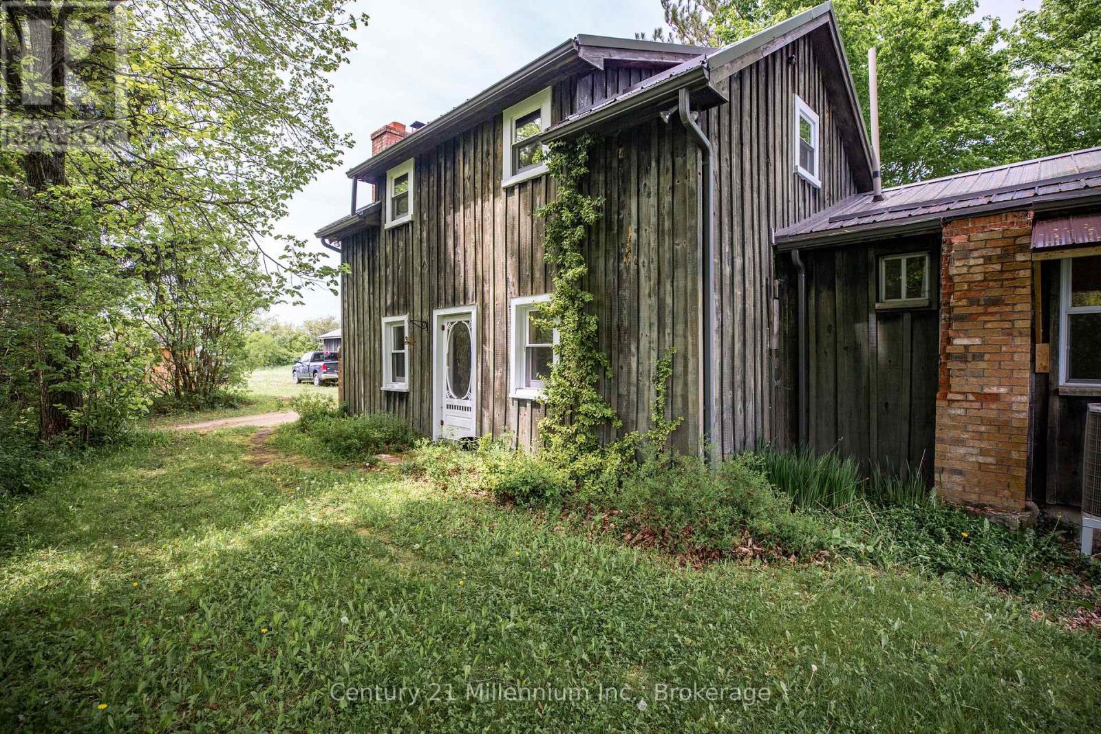 Set on 46 acres along the clean, cool waters of the Rocky Saugeen River, this log farmhouse is one of the last remaining century farms in Grey Highlands . Originally built in the 1880s and expanded in the 1970s, it combines historic features with modern upgrades. The main level of the home features an updated kitchen with a new garden door that brings in natural light. Upstairs, the primary bedroom offers wide plank floors, a walk-in closet, a 2-piece bathroom and could be converted back into 2 bedrooms. The home also includes a den that could be used as an office or guest room, and a modern laundry area with a new washer and dryer. Updates include a steel roof (2021), a 200-amp electrical panel, a generator plug, and a 2022heat/cooling pump with a backup electric furnace. A wood insert stove adds extra heat during the winter. The land includes approximately 25 workable acres currently seeded in regenerative hay crops. Approximately 15 acres are securely fenced and ready for hobby farming or equestrian pursuits. There are five paddocks with two electric outlets and one no-freeze hydrant for easy winter care. Original fence rows and walking trails lead to the Rocky Saugeen river. Outbuildings include a 60' x 88' board and batten barn built in 2020 with hydro and water, and a 30' x 50' detached garage/shop, also serviced with hydro and water. Additional structures include a chicken coop, woodshed, and a small animal shelter cat condo. Located just minutes from Markdale and a 35-minute drive to Owen Sound, this home places you in the heart of four-season recreation with skiing, hiking, fishing, paddling, snowmobiling, and more surrounded by the natural beauty of waterfalls, trails, and rivers. (id:64974)