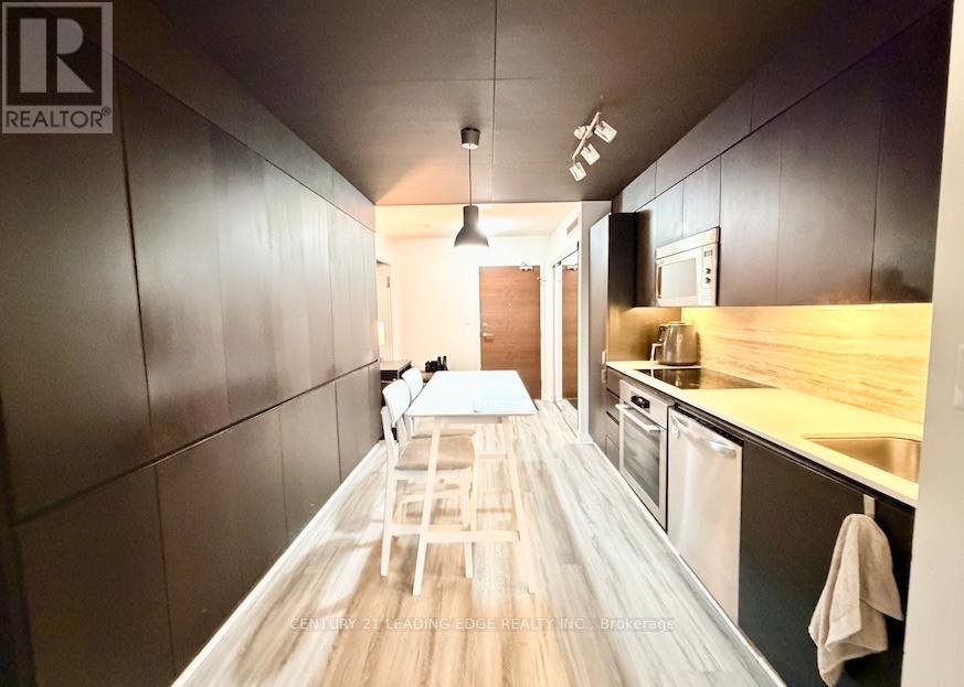 Welcome to Parade I Condo at City Place! Bright and functional 1+Den suite with parking & locker included. The large den is converted into a second bedroom, ideal for roommates, guests, or a home office. Enjoy laminate flooring throughout and a walk-out balcony overlooking a quiet courtyard garden. Modern kitchen features upgraded wood veneer cabinetry and ceiling detail, stainless steel & integrated appliances, natural stone countertops, and a built-in pantry wall for extra storage. Enjoy top-tier condo amenities in a well-managed building. Prime downtown location steps to TTC transit, Sobeys, 24-hour Tim Hortons, Starbucks. Walking distance to the Harbourfront, Rogers Centre, The Well and the vibrant King West neighbourhood with restaurants, shopping, and entertainment nearby! Perfect for professionals seeking convenience, comfort, and vibrant downtown living! (id:64974)