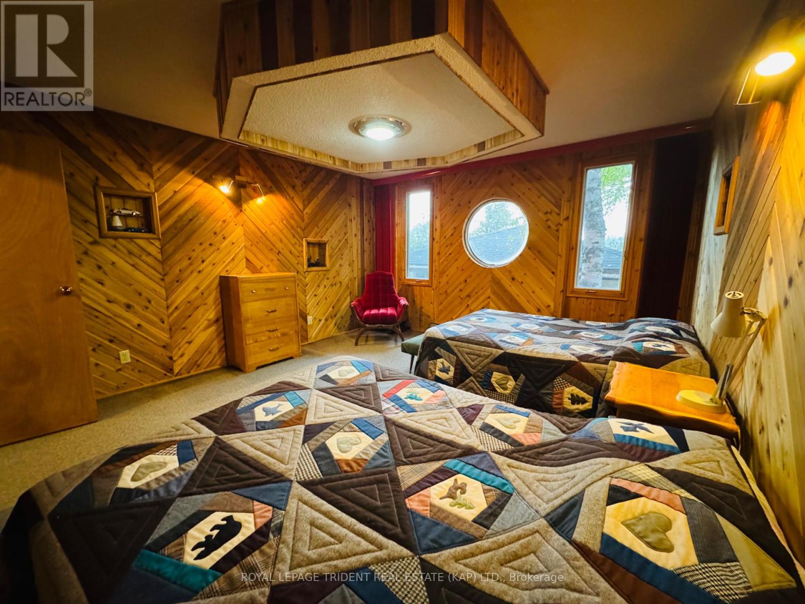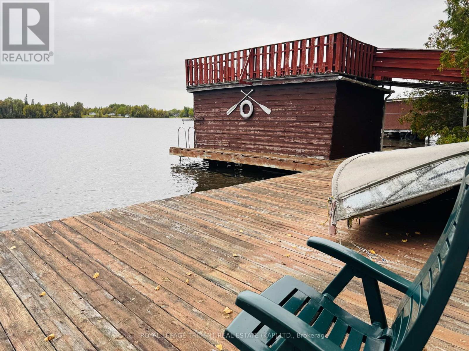 A true Northern Ontario waterfront gem on beautiful Remi Lake! This exceptional property offers a breathtaking panoramic view of the lake and boasts the best seat in the house for unforgettable sunsets. The main residence, built in 1979, is a cozy, fully insulated, year-round home featuring approximately 760 sq ft of living space with two bedrooms, one bathroom, and a bright open-concept kitchen and living area. The kitchen showcases oak cabinetry and a patio door leading to a large covered wrap-around deck overlooking the lake - perfect for morning coffee, BBQs, or watching the sunset. A wood fireplace adds warmth and charm, while abundant natural light enhances the inviting atmosphere. A secondary three-season guest dwelling offers flexible options for extended family, guests, or short-term rentals and includes a large bedroom, bathroom, cozy open-concept living area, woodstove, and electric heat. It is partly insulated and could easily be converted to four-season use. The propertys laundry facilities are located within this dwelling. Outdoor living here is truly special, featuring a 16 ft x 16 ft screened-in gazebo with electricity, custom winter panels, and a new roof (2024), a boathouse with an upper deck and power hookup accommodating up to a 16-foot boat, a dedicated firepit area, interlock driveway, and a spacious detached heated and insulated garage (24 ft x 36 ft) across the road with 12-foot ceilings and infrared heating. Additional highlights include a lake water system with three-stage filtration, separate hot water tanks for each dwelling, vinyl windows (2001), convect-air backup heaters, and an A/C wall unit in the main home. Whether youre seeking a peaceful year-round residence, a multi-generational family retreat, or an investment with rental potential, this property offers endless possibilities in a serene, private setting on one of Northern Ontario's most desirable lakes. ** This is a linked property.** (id:64974)