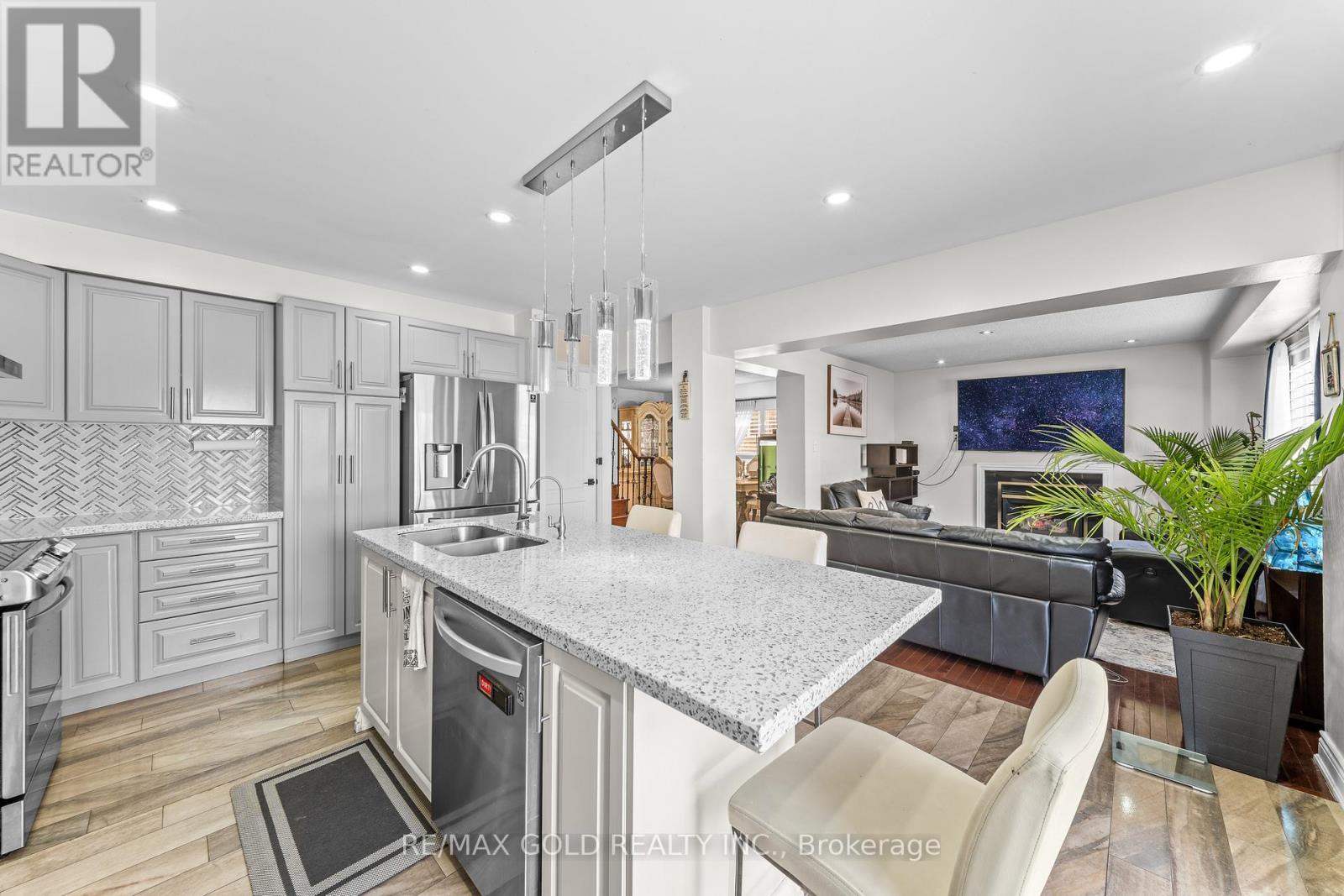 Stunning 4-bedroom, 4-washroom Detached home in the highly sought-after Fletcher's Meadow community! This beautifully maintained property shows like a model home and features hardwood flooring throughout. The spacious primary bedroom offers a walk-in closet and a luxurious 5- piece ensuite. All bedrooms are generously sized, each with large windows that provide abundant natural light. The modern kitchen is a true highlight, complete with quartz countertops, stainless steel appliances, and a walk-out to the backyard-perfect for entertaining. The open-concept living area boasts hardwood floors, a cozy fireplace, and newly installed pot lights throughout the home. Additional features include convenient double garage access and a fully finished 2-bedroom basement, offering excellent potential for extra income or extended family living. This spotless, bright, and spacious home is truly a perfect 10! Ideally located close to all amenities, with walking distance to grocery stores, plazas, and more. (id:64974)