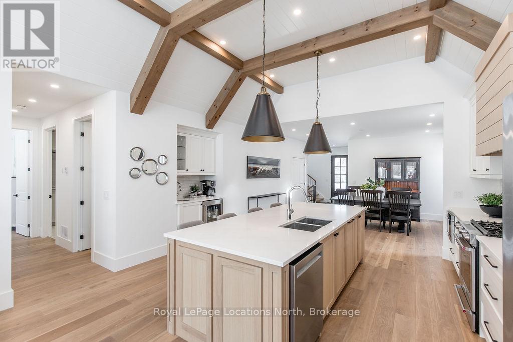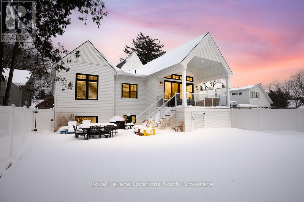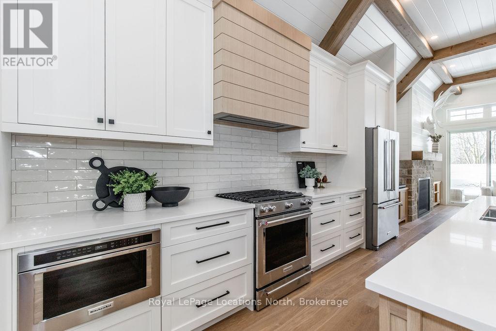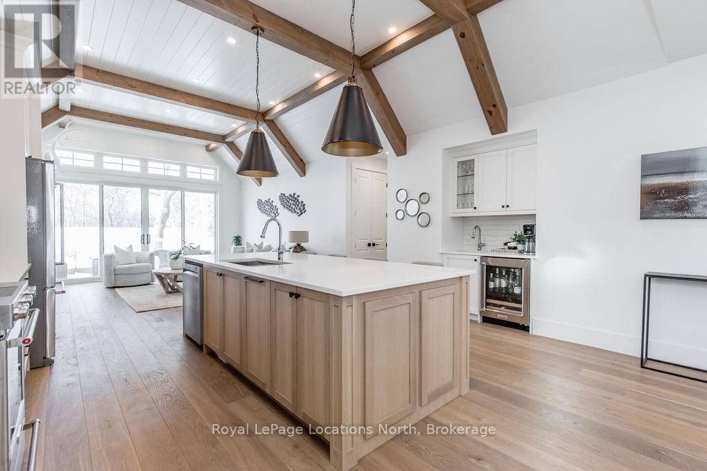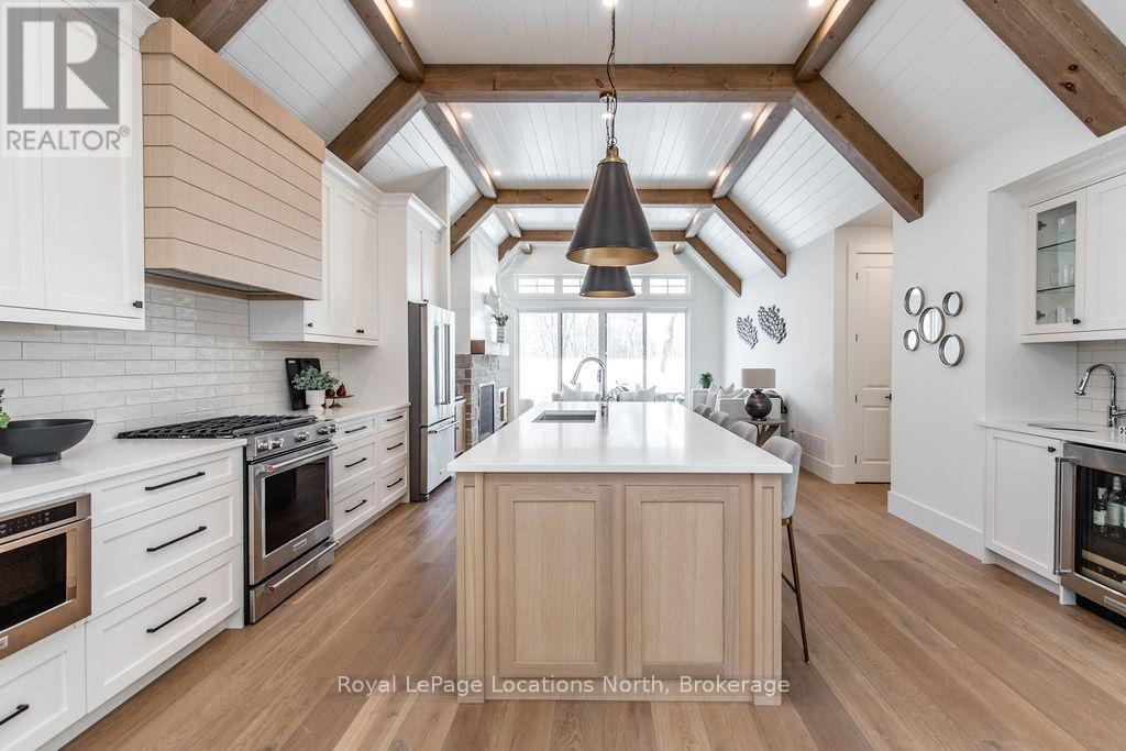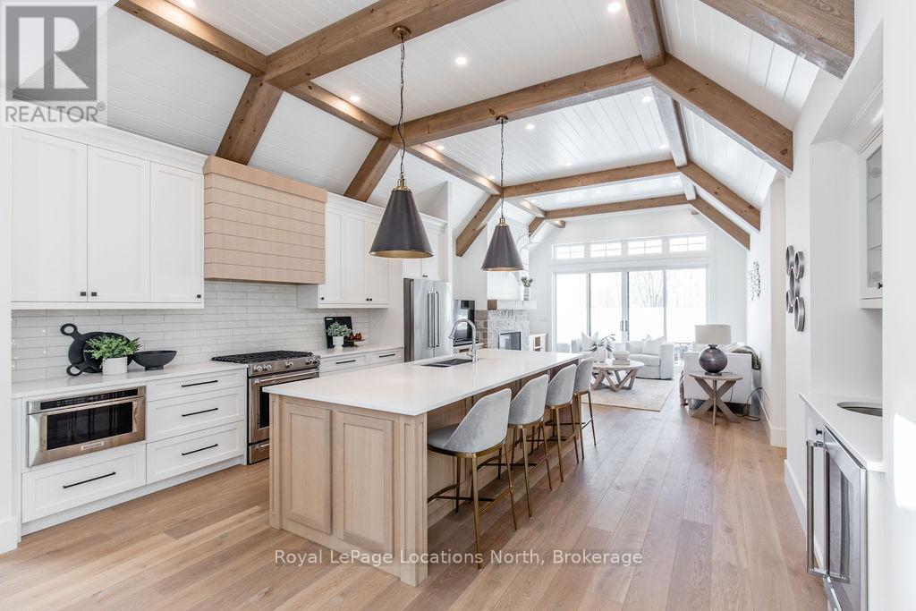 Fall in love with this spectacular custom-built Vandermeer home just steps from Georgian Bay at Sunset Point, one of the area's most sought-after waterfront neighbourhoods. Offering over 3,700 sq ft of luxury living space, this 3+2 bedroom, 4 bathroom residence blends timeless craftsmanship with elevated modern finishes.Designed with 9-ft interior doors, upgraded hardware, wide-plank white oak hardwood flooring, and soaring 12-ft beamed cathedral ceilings with shiplap and pot lights, the home delivers an airy, open-concept layout ideal for both everyday living and entertaining. The gourmet designer kitchen features a statement centre island, stainless steel appliances, and a wet bar, seamlessly flowing into the dining and family rooms.The main-floor primary suite is a true retreat with a spa-inspired 5-piece ensuite, floating soaker tub, glass shower, heated floors, double quartz vanity, and walk-in closet. A second main-floor bedroom or office adds flexibility for guests or remote work.The upper loft family room and finished lower-level recreation room, both with gas fireplaces, offer multiple living spaces for families or multigenerational living. The basement includes two additional bedrooms, a wet bar, and rough-in for heated floors, making it ideal for guests or extended family.Enjoy summer evenings on the covered back deck, a fenced yard, and direct access from the mudroom/ski locker with inside garage entry, perfect for four-season living near the bay. With three gas fireplaces, central air, central vacuum, and premium finishes throughout, this home offers luxury, comfort, and location in equal measure. (id:64974)