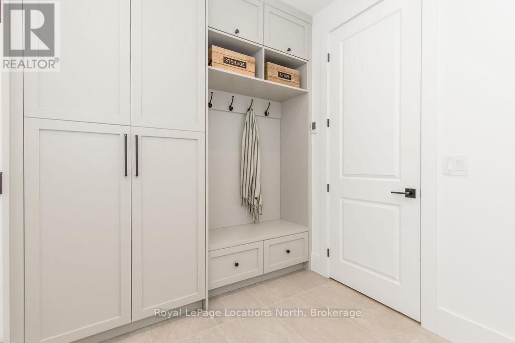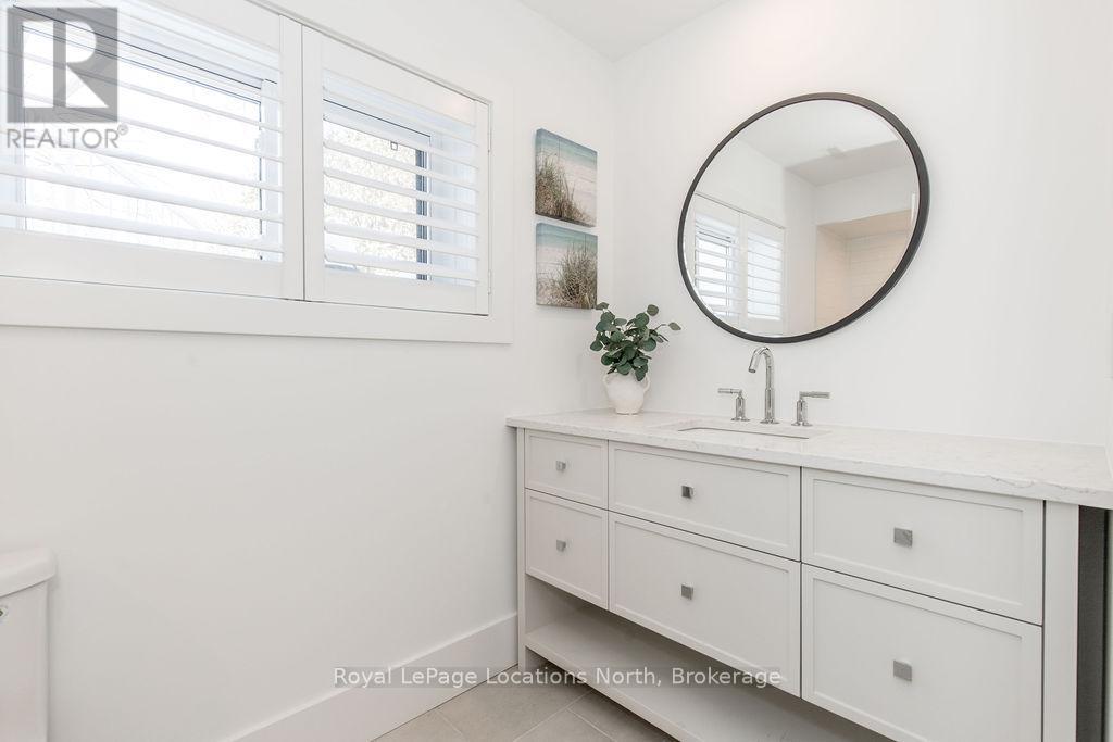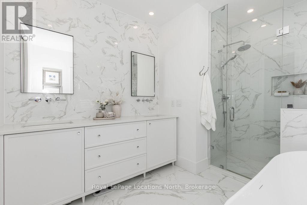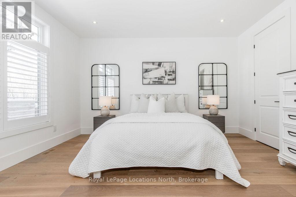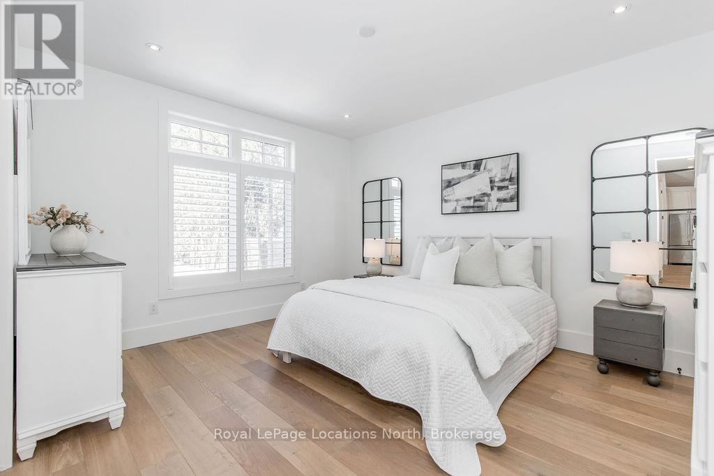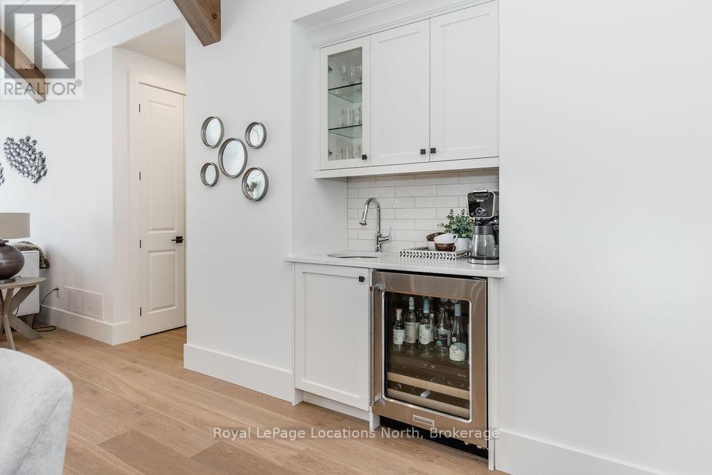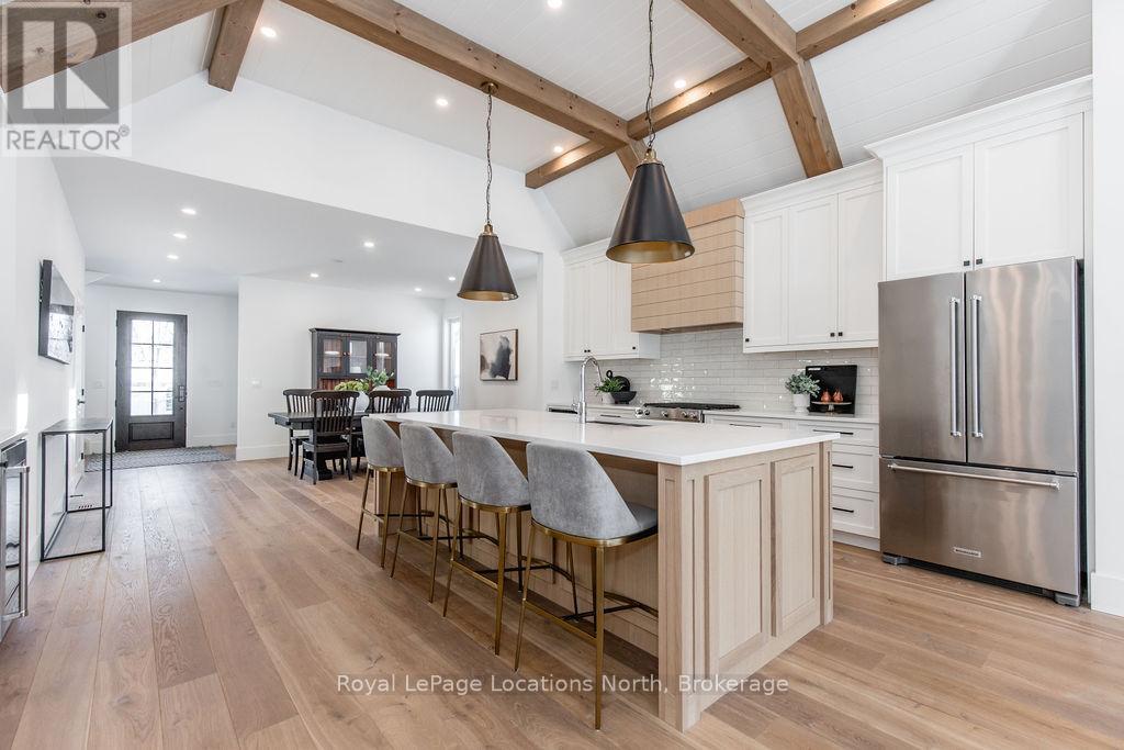 Fall in love with this spectacular custom-built Vandermeer home just steps from Georgian Bay at Sunset Point, one of the area's most sought-after waterfront neighbourhoods. Offering over 3,700 sq ft of luxury living space, this 3+2 bedroom, 4 bathroom residence blends timeless craftsmanship with elevated modern finishes.Designed with 9-ft interior doors, upgraded hardware, wide-plank white oak hardwood flooring, and soaring 12-ft beamed cathedral ceilings with shiplap and pot lights, the home delivers an airy, open-concept layout ideal for both everyday living and entertaining. The gourmet designer kitchen features a statement centre island, stainless steel appliances, and a wet bar, seamlessly flowing into the dining and family rooms.The main-floor primary suite is a true retreat with a spa-inspired 5-piece ensuite, floating soaker tub, glass shower, heated floors, double quartz vanity, and walk-in closet. A second main-floor bedroom or office adds flexibility for guests or remote work.The upper loft family room and finished lower-level recreation room, both with gas fireplaces, offer multiple living spaces for families or multigenerational living. The basement includes two additional bedrooms, a wet bar, and rough-in for heated floors, making it ideal for guests or extended family.Enjoy summer evenings on the covered back deck, a fenced yard, and direct access from the mudroom/ski locker with inside garage entry, perfect for four-season living near the bay. With three gas fireplaces, central air, central vacuum, and premium finishes throughout, this home offers luxury, comfort, and location in equal measure. (id:64974)